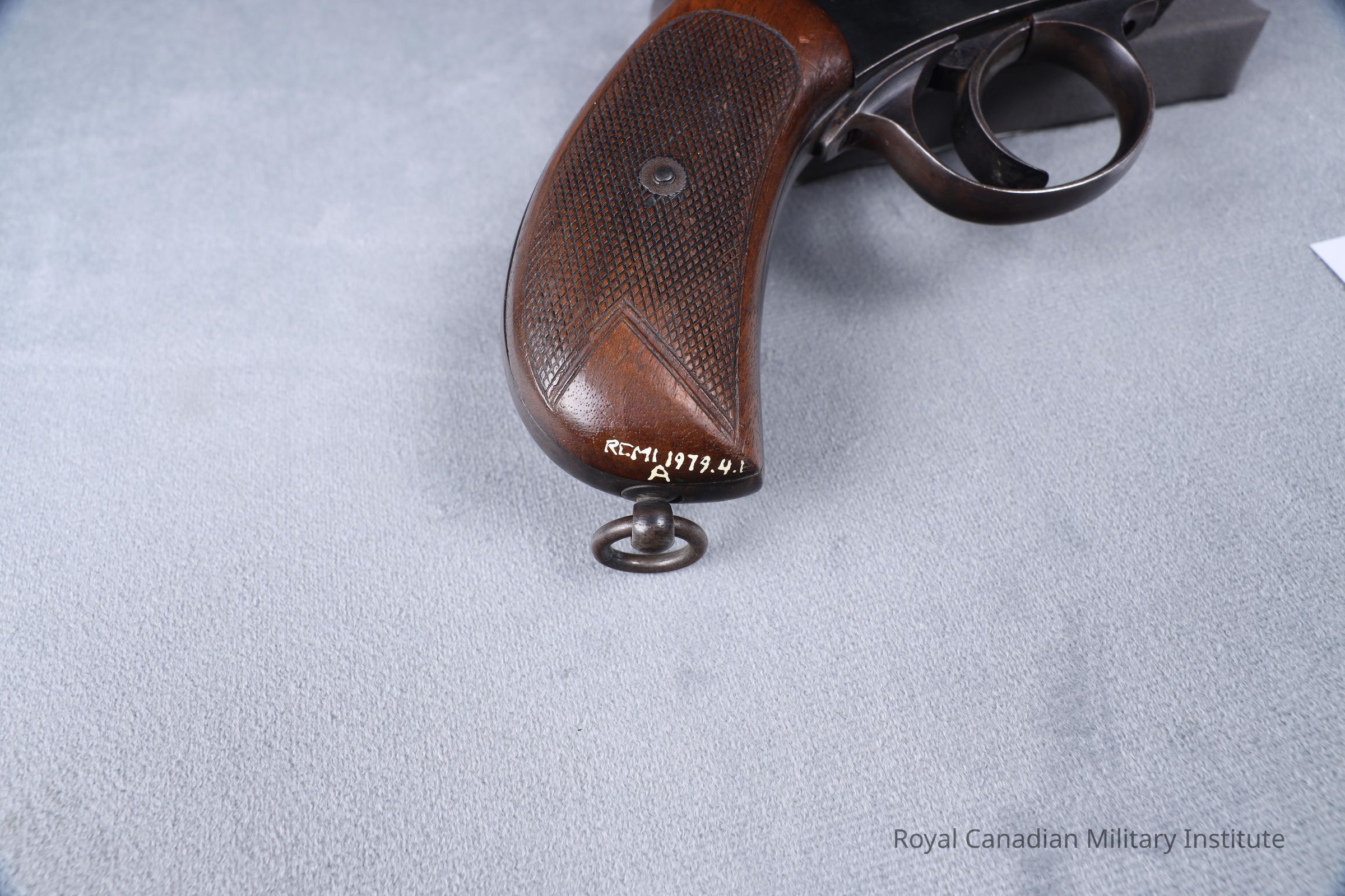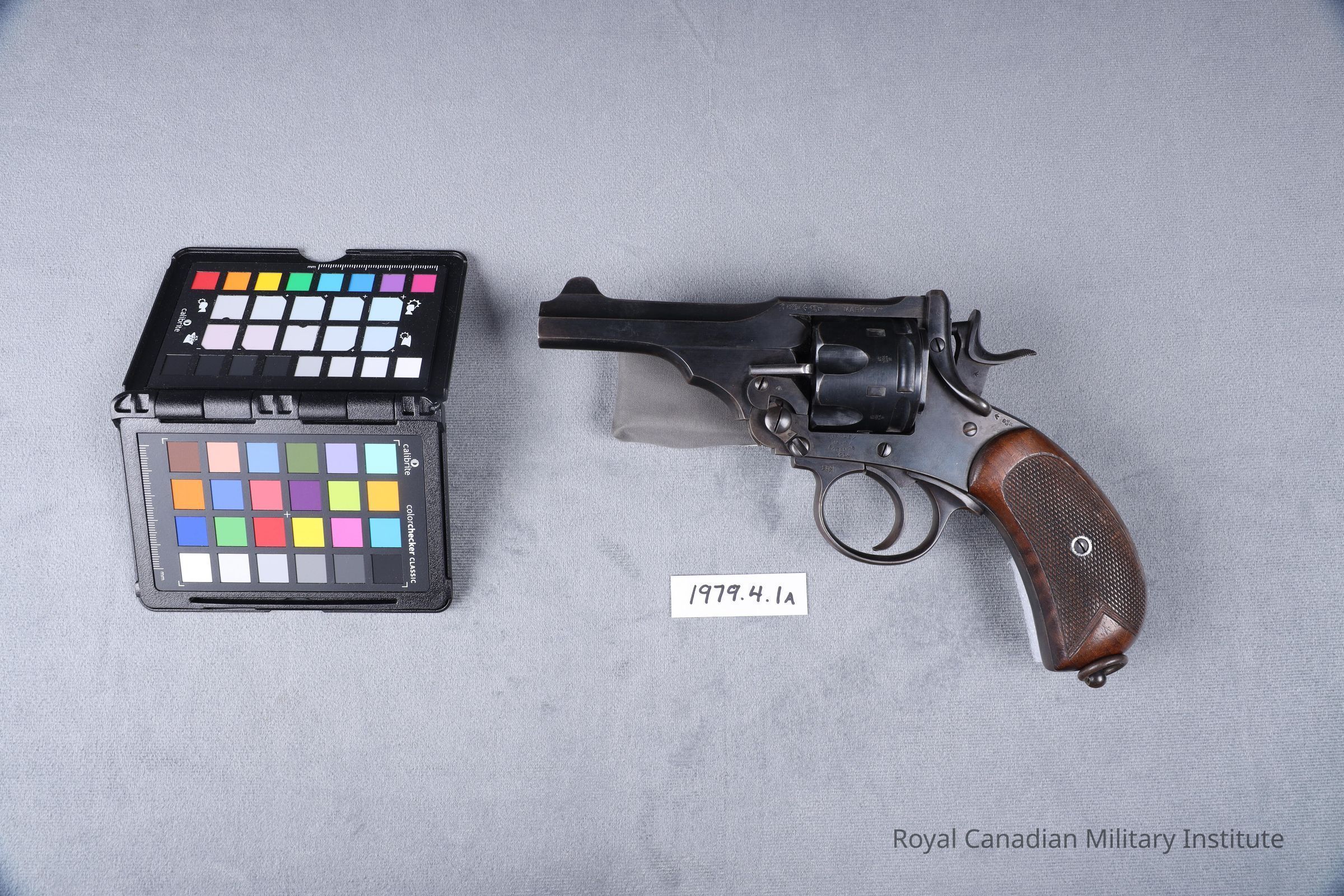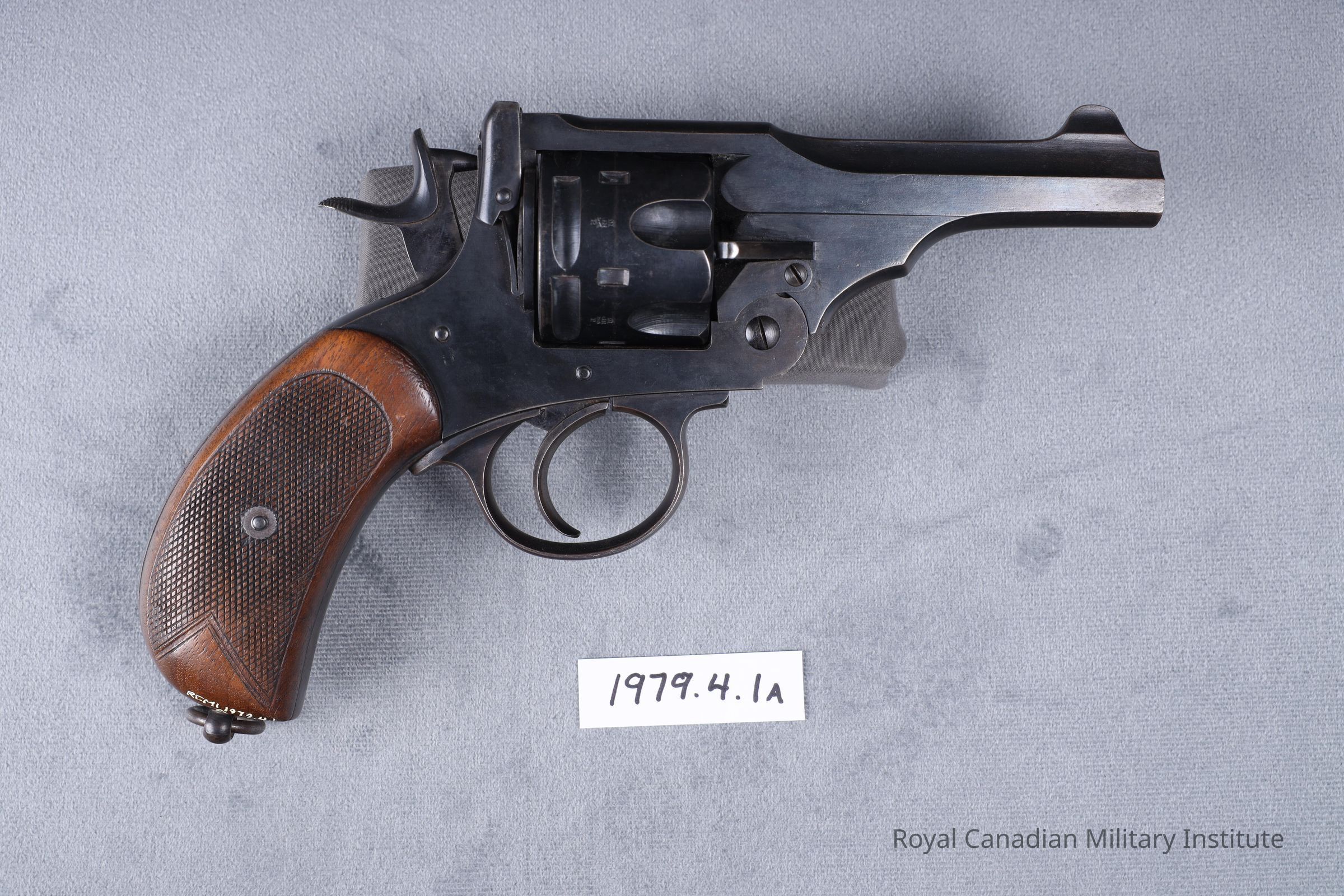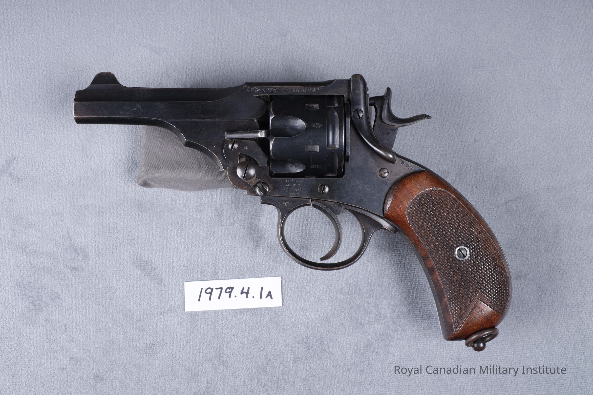 1914-1918 British Army Webley Mark V revolver, s/no. 131977. Blued steel "bird's head" butt with two knurled walnut grips. Blued steel top-breaking frame with six round capacity cylinder. Fittings of top stirrup catch, automatic cylinder extractor, butt lanyard ring. Rearsight a grooved notch in stirrup catch, frontsight a fixed blade.Made/Created