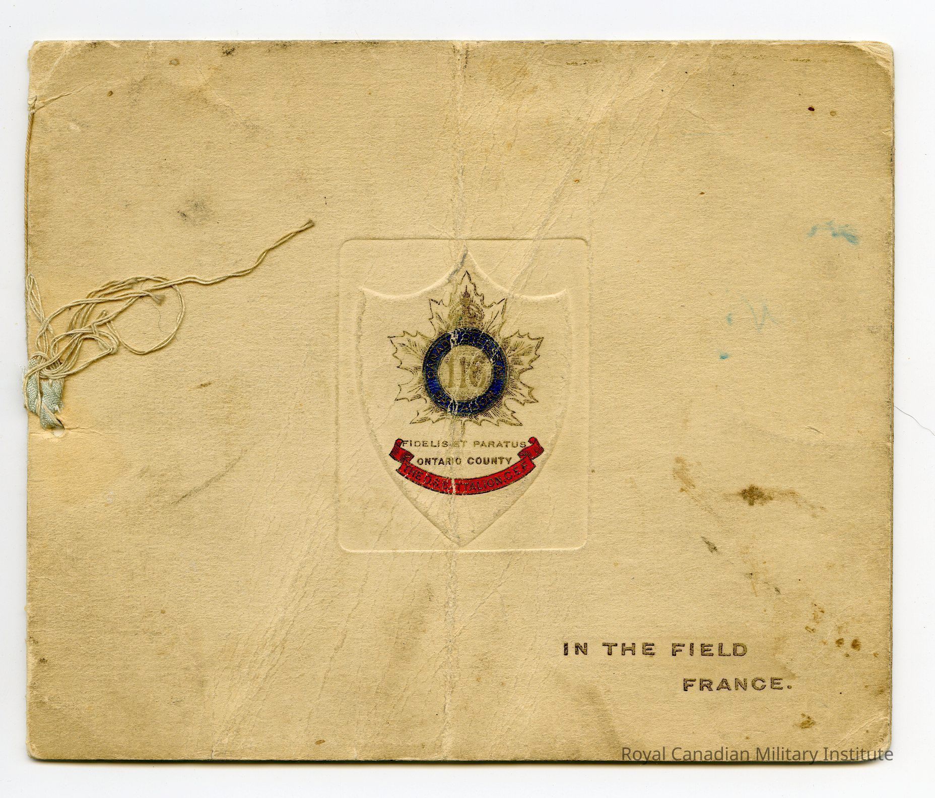 The cover of the card reads:"Canada Overseas Battalion, 116, Fidelis Et Paratus, Ontario County, The O.S. Battalion. C.E.F, In The Field France"