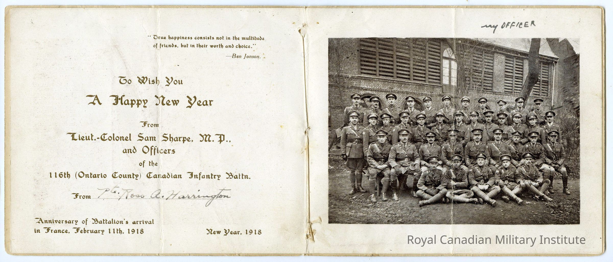 "To Wish You A Happy New Year from Lieut.- Colonel Sam Sharpe, M.P.. and Officers of the 116th (Ontario County) Canadian Infantry Battn. From pt. Ross A. Harrington