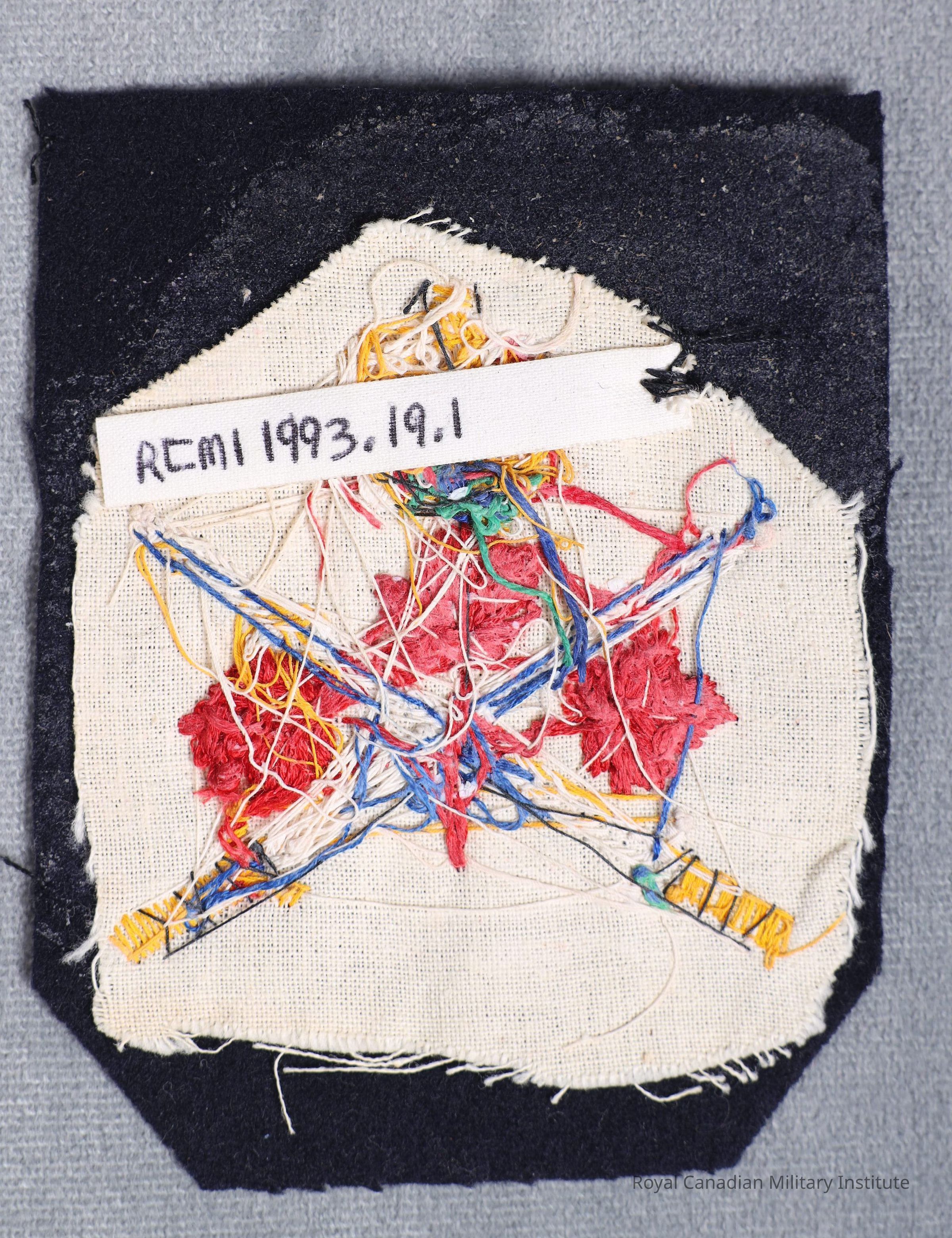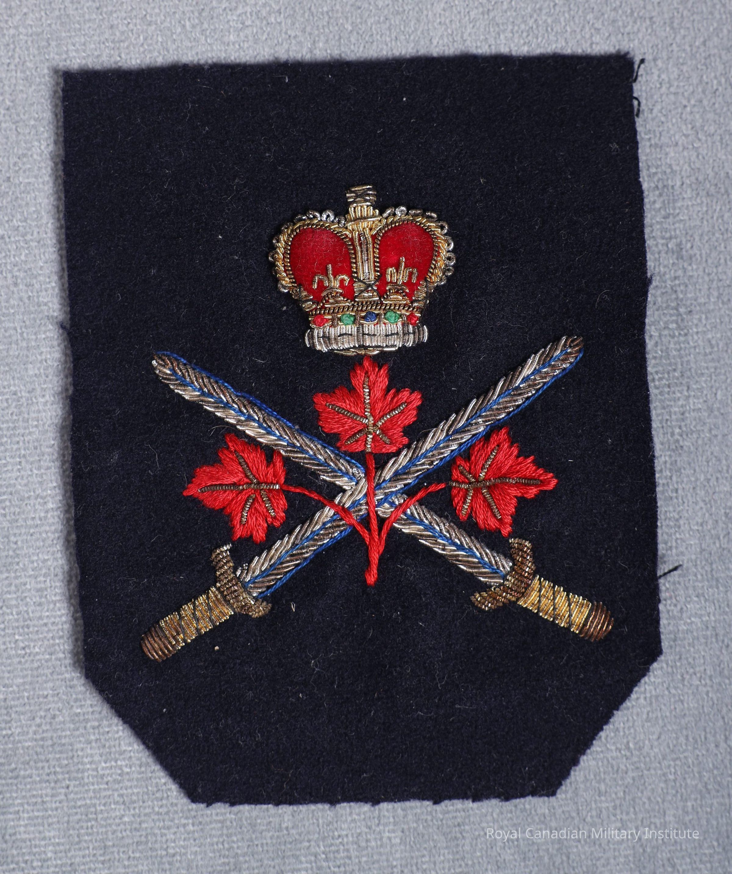 1953-1968 Royal Canadian Army Cadets jacket badge. Rectangular dark blue wool with machine-stitched embroidered silver/blue/gold bullion wire crossed swords, three red felt/gold bullion wire maple leaves. At top is a Queen's Crown in gold/silver bullion wire, red velvet, red/green/blue polyester thread.Made/Created