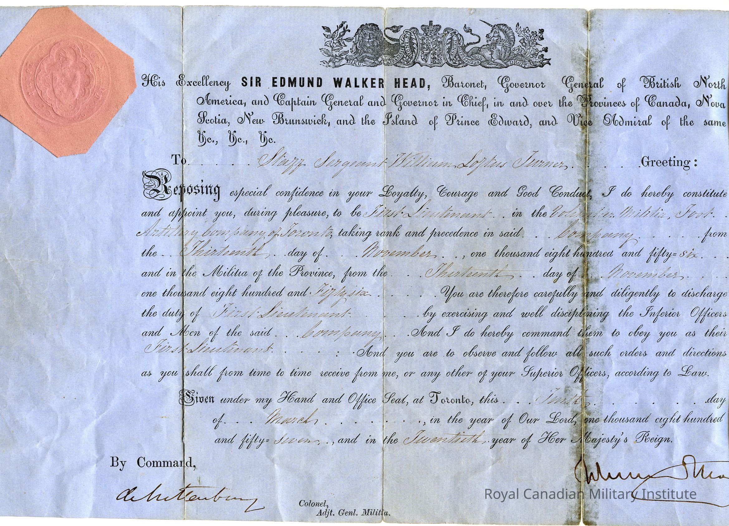 1857 Toronto Volunteer Militia Foot Artillery Company Officer's Commission Scroll "First-Lieutenant William Loftus Turner." Rectangular, blue watermarked paper. Red paper seal top left arms coat of Governor-General. Partial text reads:"We appoint William Loftus Turner Gent. a Second-Lieutenant...effective from 13 November 1856..." Signed by Edmund Walker Head, and Adjutant-General Militia de Rottenburg.Made/Created