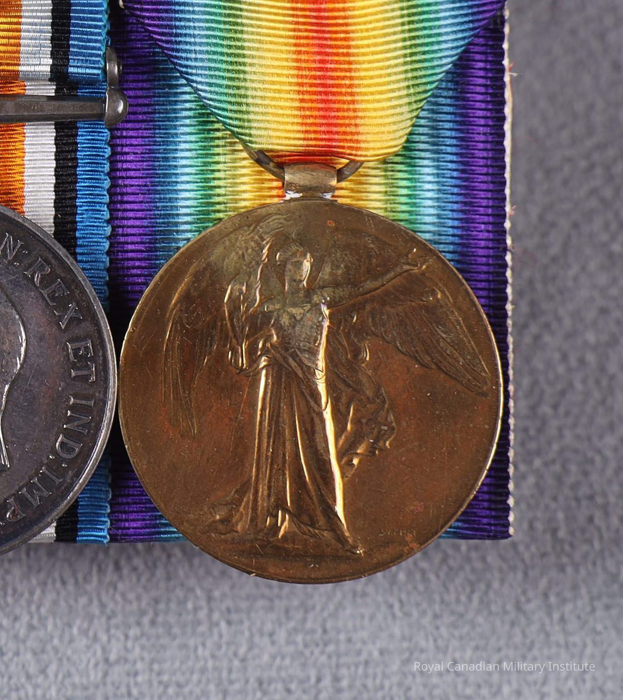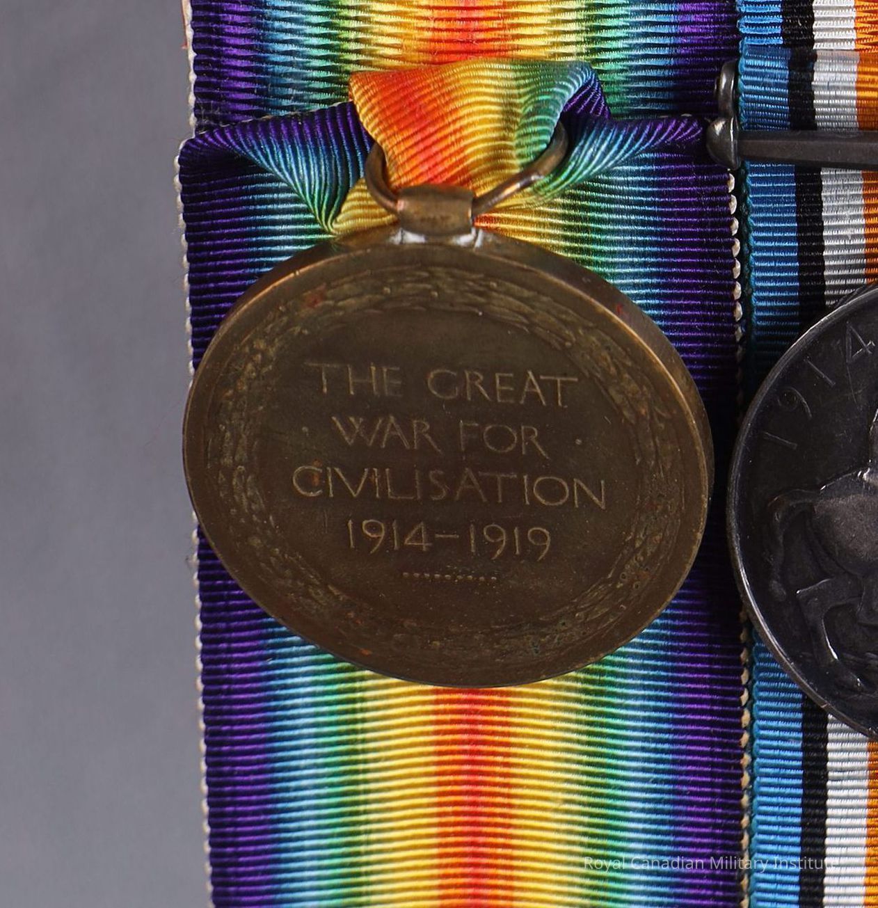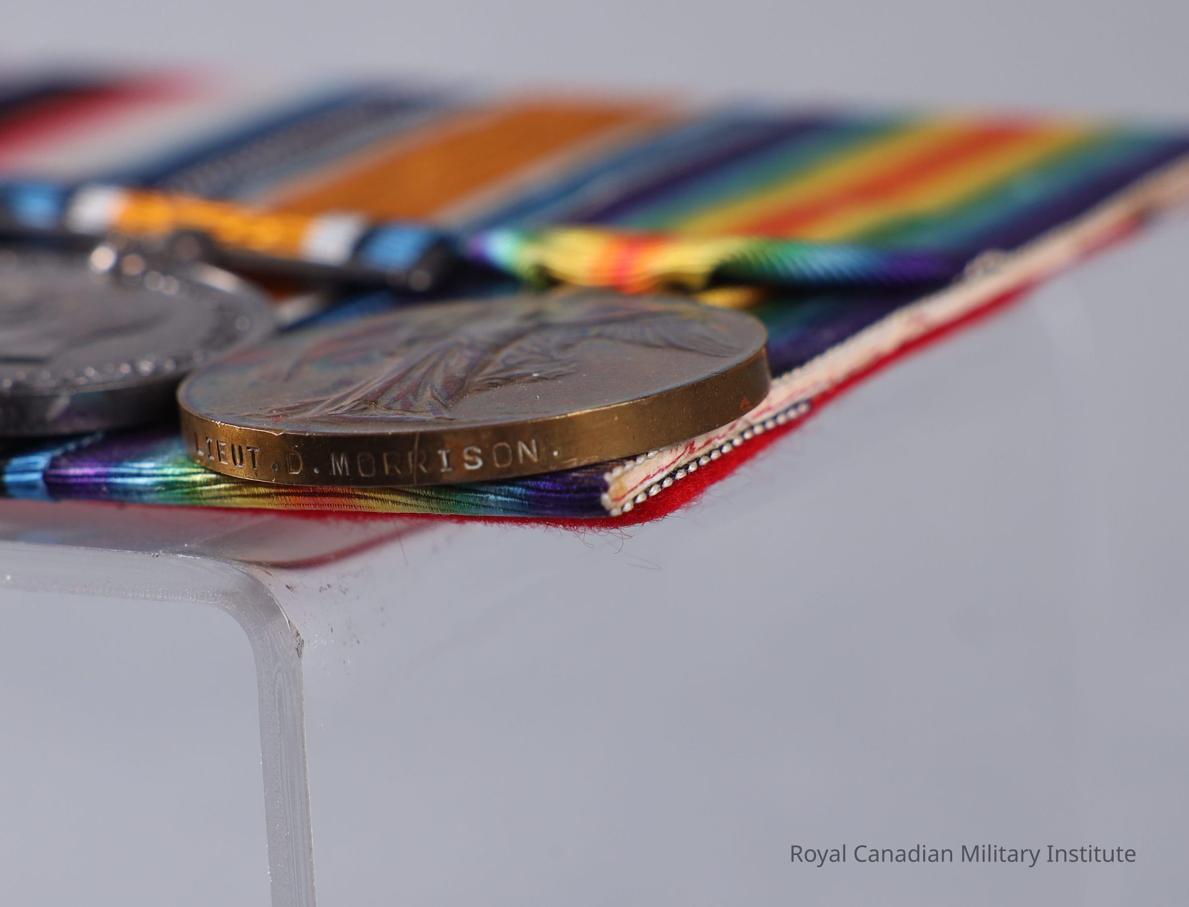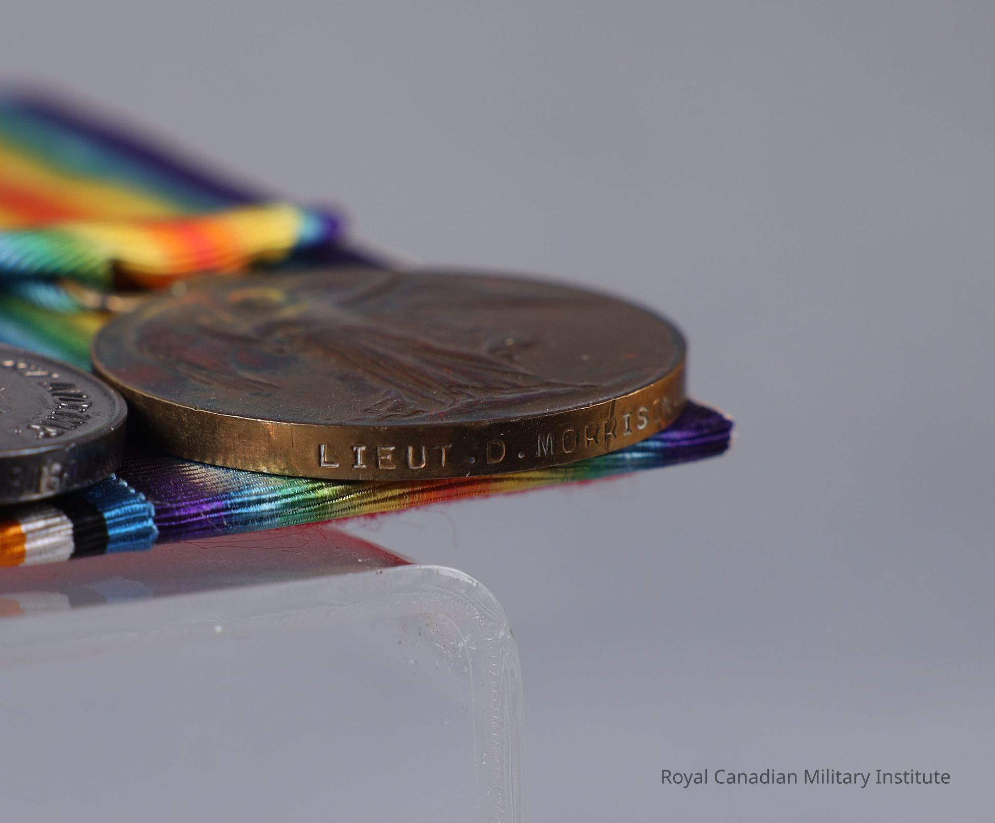 1914-1919 Allied Victory Medal, to LIEUT. MORRISON. The Allied Victory Medal includes a rainbow ribbon, representing international Allies and friendships. The bronze medal depicts Victory, the personification of her namesake in Ancient Roman and Greek cultures. One arm is outstretched while the other holds a palm branch, representing peace. The back of the medal reads, "THE GREAT / WAR FOR / CIVILISATION / 1914-1919." The inscription is surrounded by a laurel wreath. This medal was awarded to Lieut. David Morrison, and his name is inscribed around the rim of the medal.