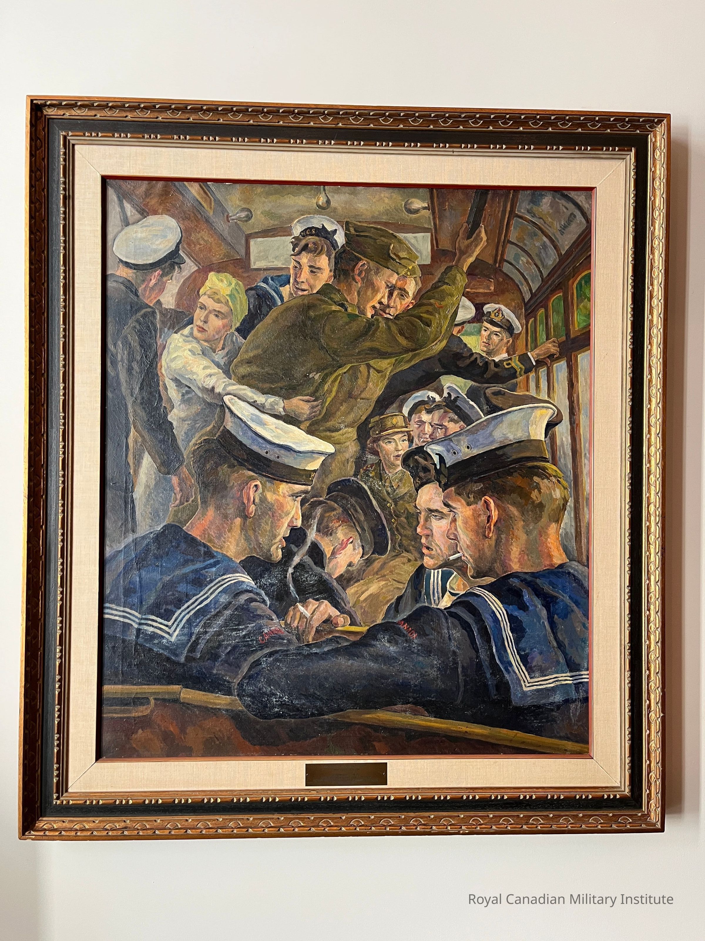 Oil painting (oil on canvas) "Dockyard Car, Esquimalt, British Columbia, 1942." Detail shows occupants of streetcar or bus on route to Royal Canadian Navy Station Esquimalt: eight sailors, three naval officers, one Canadian Womens' Army Corps officer, one female civilian war worker, one civilian. Red "Canada" shoulder titles on black navy uniforms are clearly visible.Made/Created