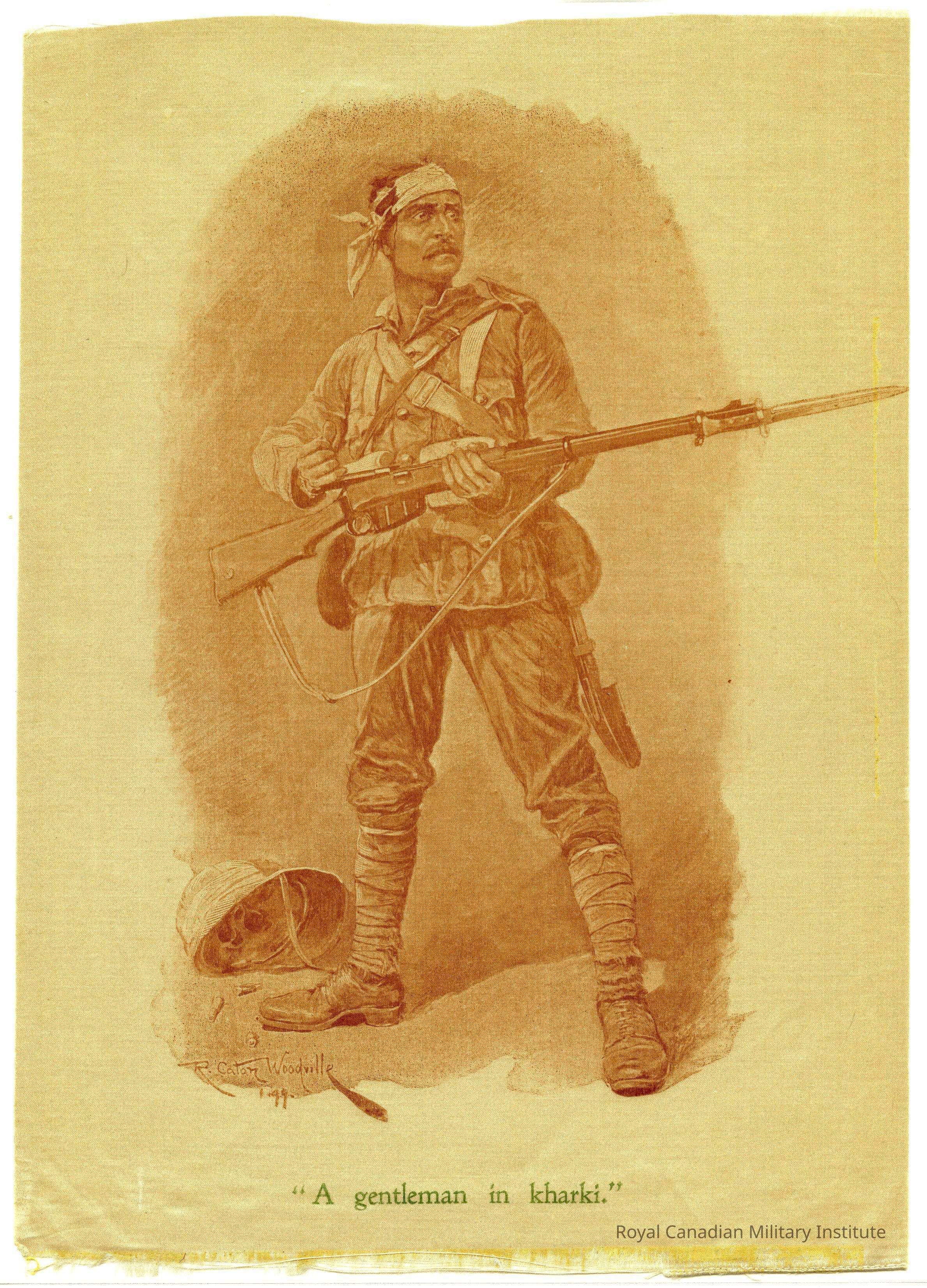 Linen print "Gentleman in Khaki, 1899." Sepia tone sketch of British Army private soldier, standing on guard, in khaki service dress jacket, trousers, puttees, boots, Oliver-pattern equipment. He holds Lee-Enfield Mark I long rifle with bayonet. He is bare-headed with bandage on head.Made/Created