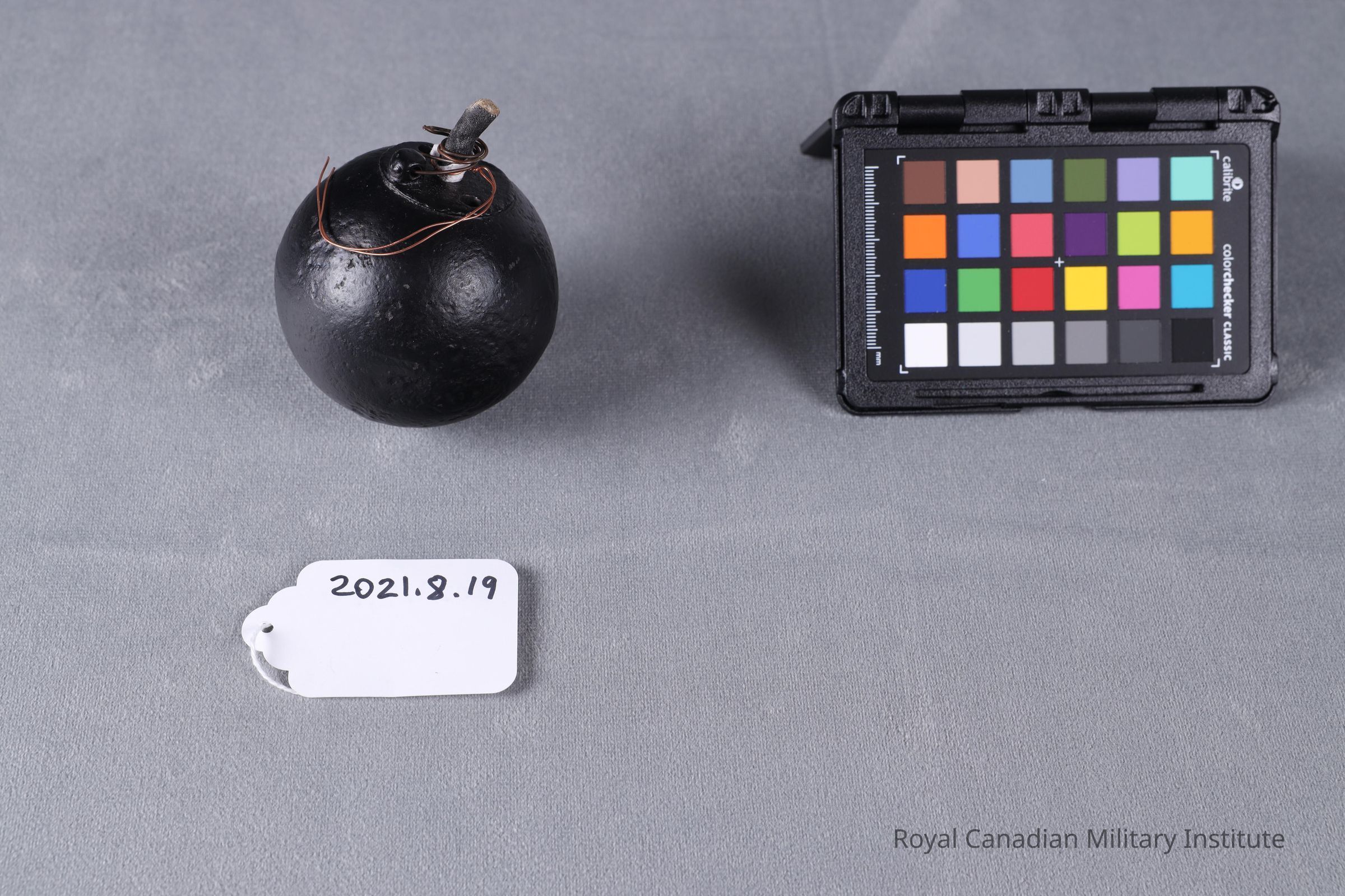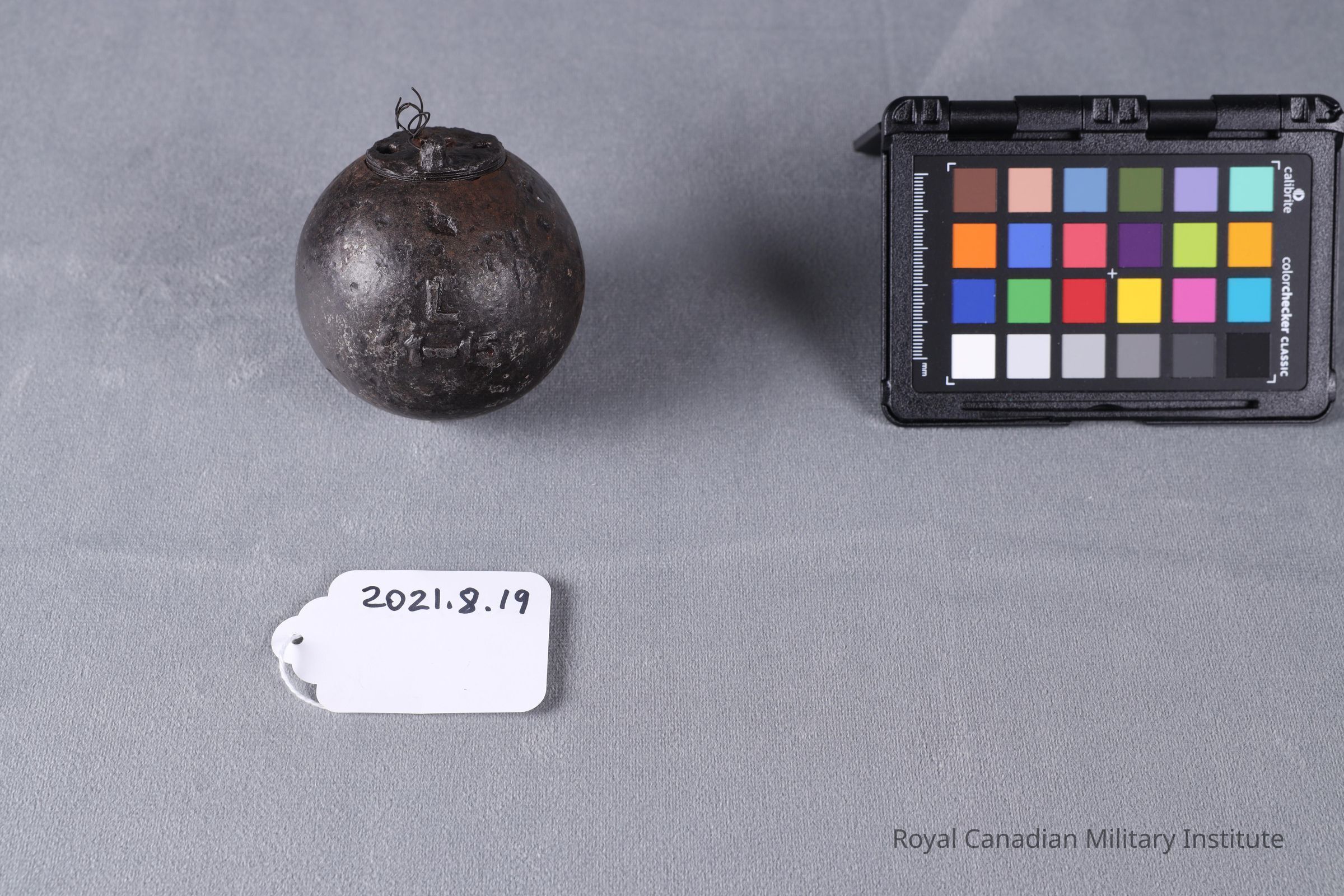 1916-18 British Army No.15 "cricket ball" hand grenade. An iron ball hand grenade with a fuse cast and the top is flattened with a hole for injecting the fuse.Context