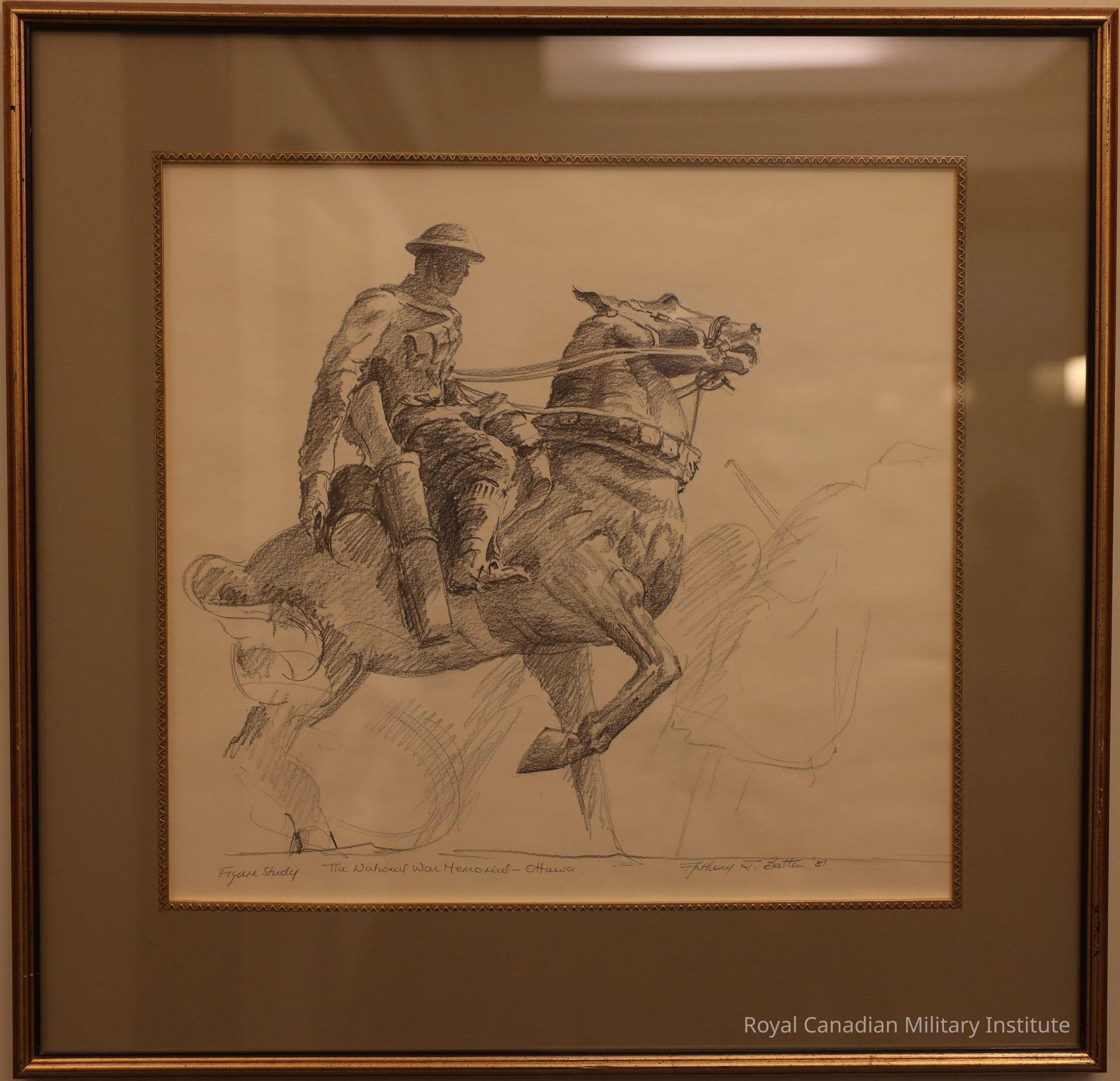 Pencil sketch "Figure Study The National War Memorial, Ottawa (1981)." Rectangular, on white cotton bond art paper. Shows Canadian Expeditionary Force mounted infantryman or cavalry trooper. Wearing helmet, field service dress, puttees, boots, waistbelt with ammunition pouch, pistol holster. Carries a rifle.Made/Created