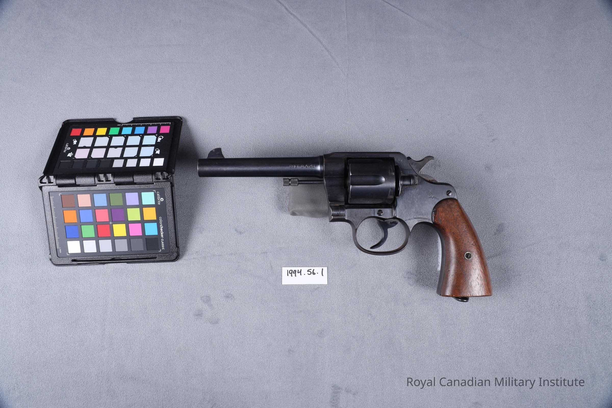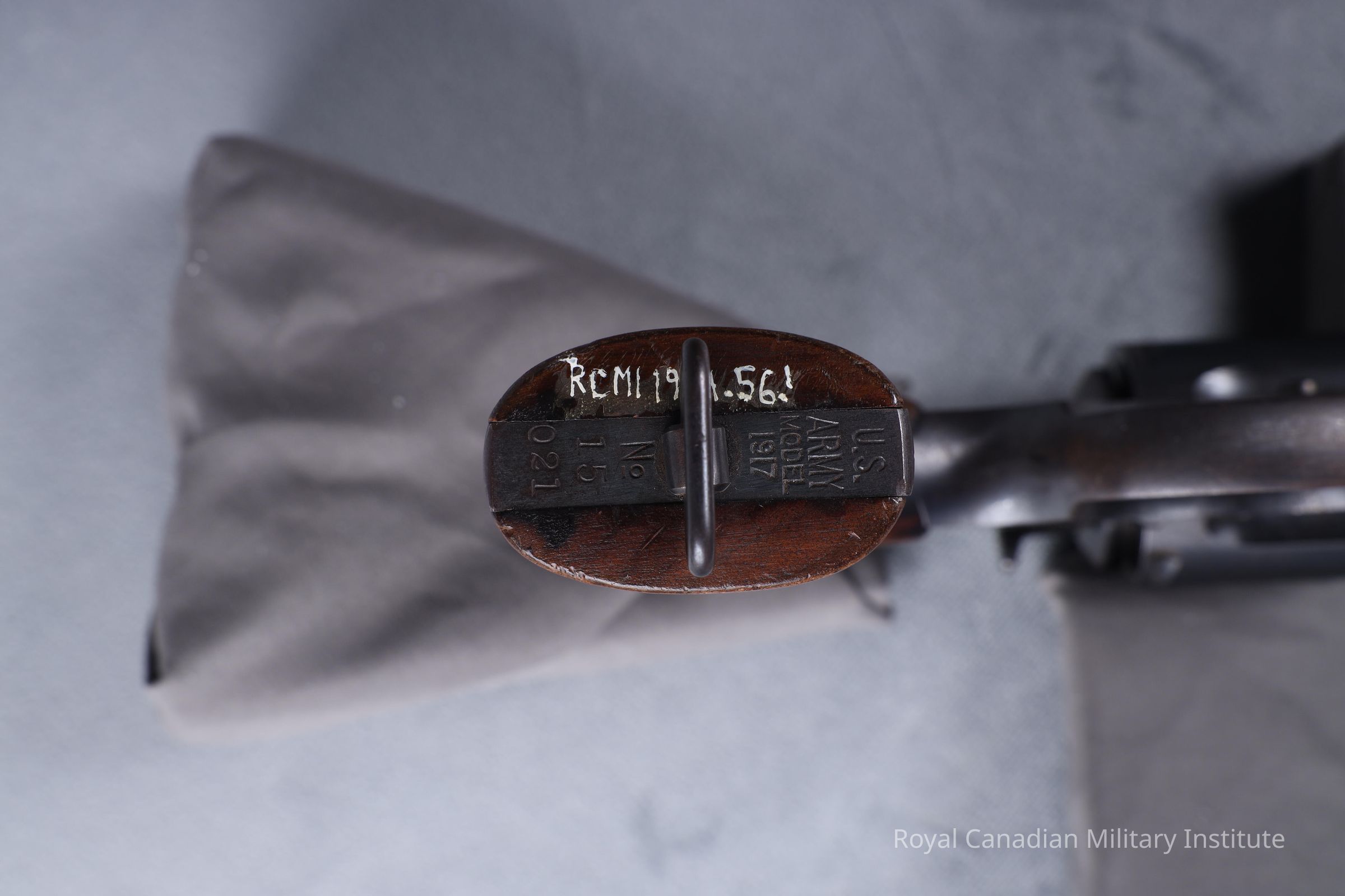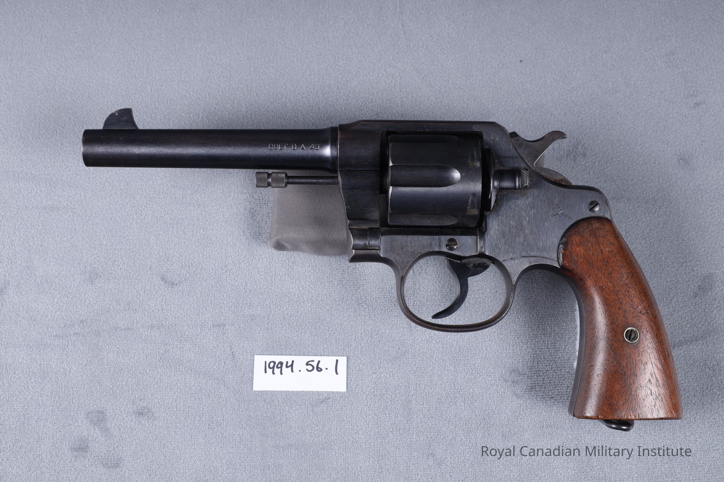 Stamped left frame: Colt "horse" trademark. Barrel: "Colt D.A. .45" "United States Property" Stamped butt underside: "U.S. Army Model 1917. 15021"Dimensions