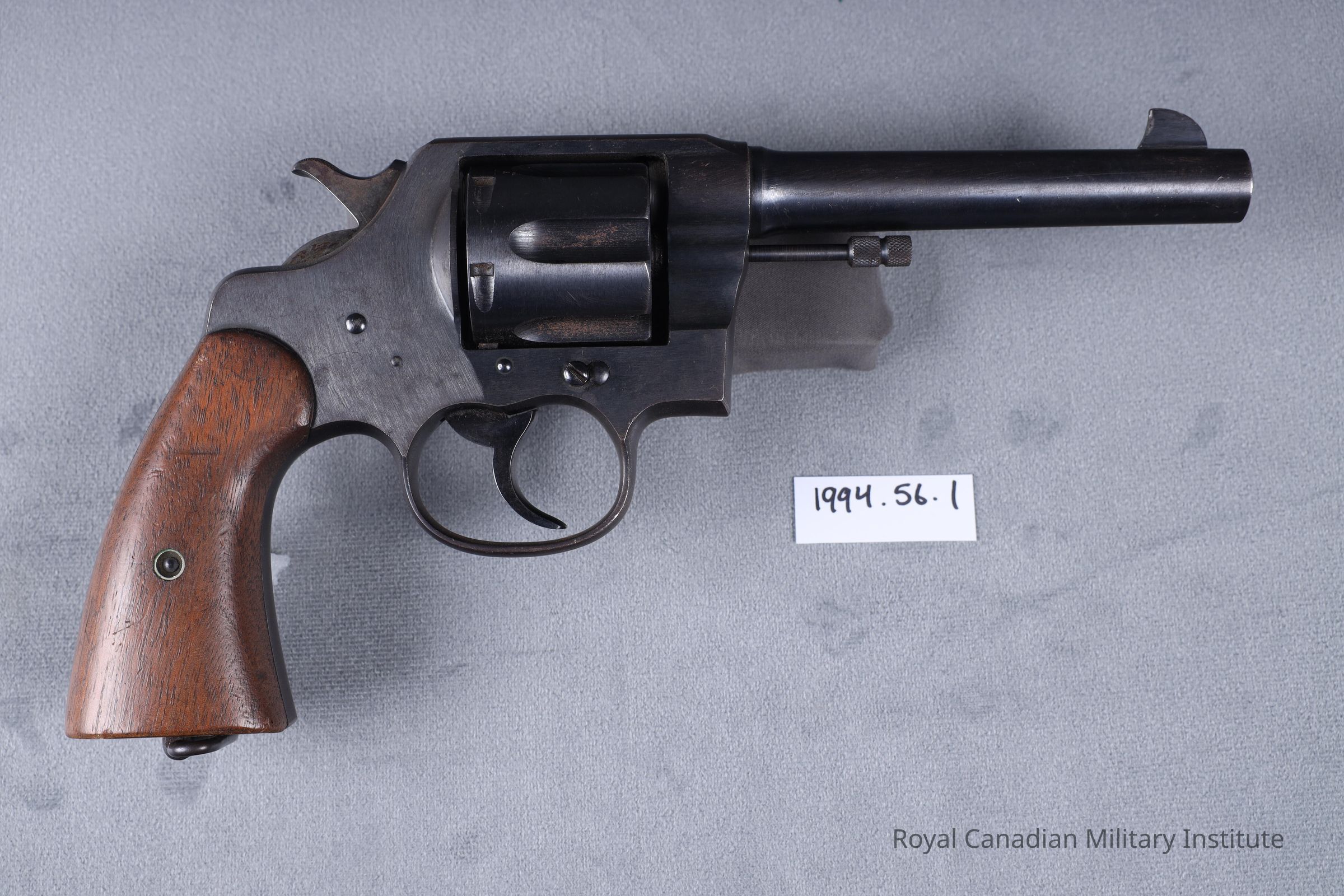 1939-1945 American Army Colt Double-Action Model 1917 revolver, s/no. 15021. Curved blued steel squared butt with smooth walnut grips. Blued steel solid frame with swing-out six round capacity cylinder. Fittings of ejector rod with internal ejector, butt lanyard ring. Caliber .45 inch cylindrical blued steel barrel 4.5 in (13.8cm) long. Rearsight a "U" notch, frontsight a fixed blade.Made/Created