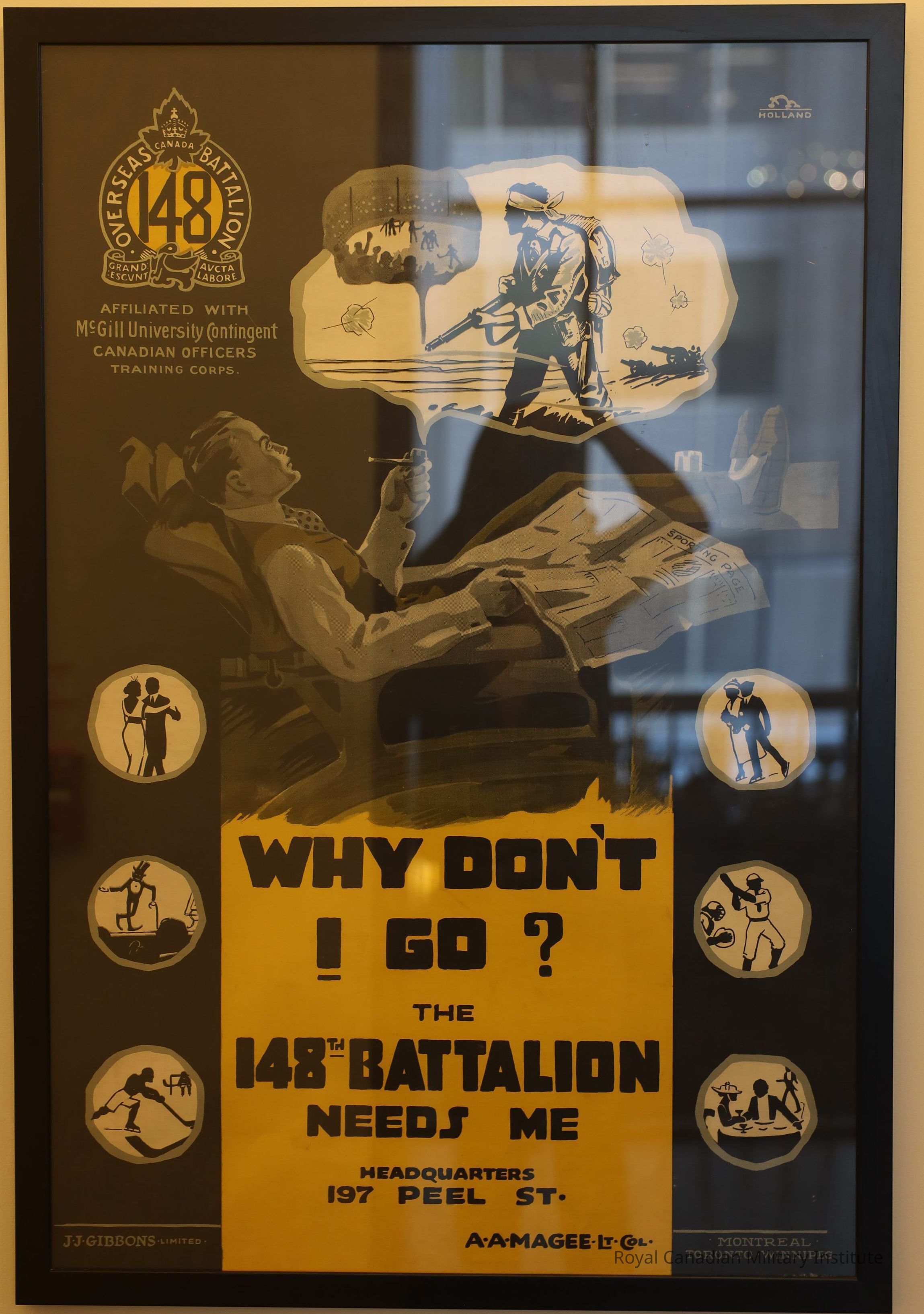 1916-1920 148th (Montreal, Quebec) Infantry Battalion recruiting poster "Why Don't I Go?" Rectangular, shows pipe-smoking civilian man in recliner chair with seven smoke clouds showing battlefield and peaceful scenes. Title "Why Don't I Go? The 148th Battalion Needs Me." At top left is 148th Battalion cap badge.In striking black, yellow.Made/Created