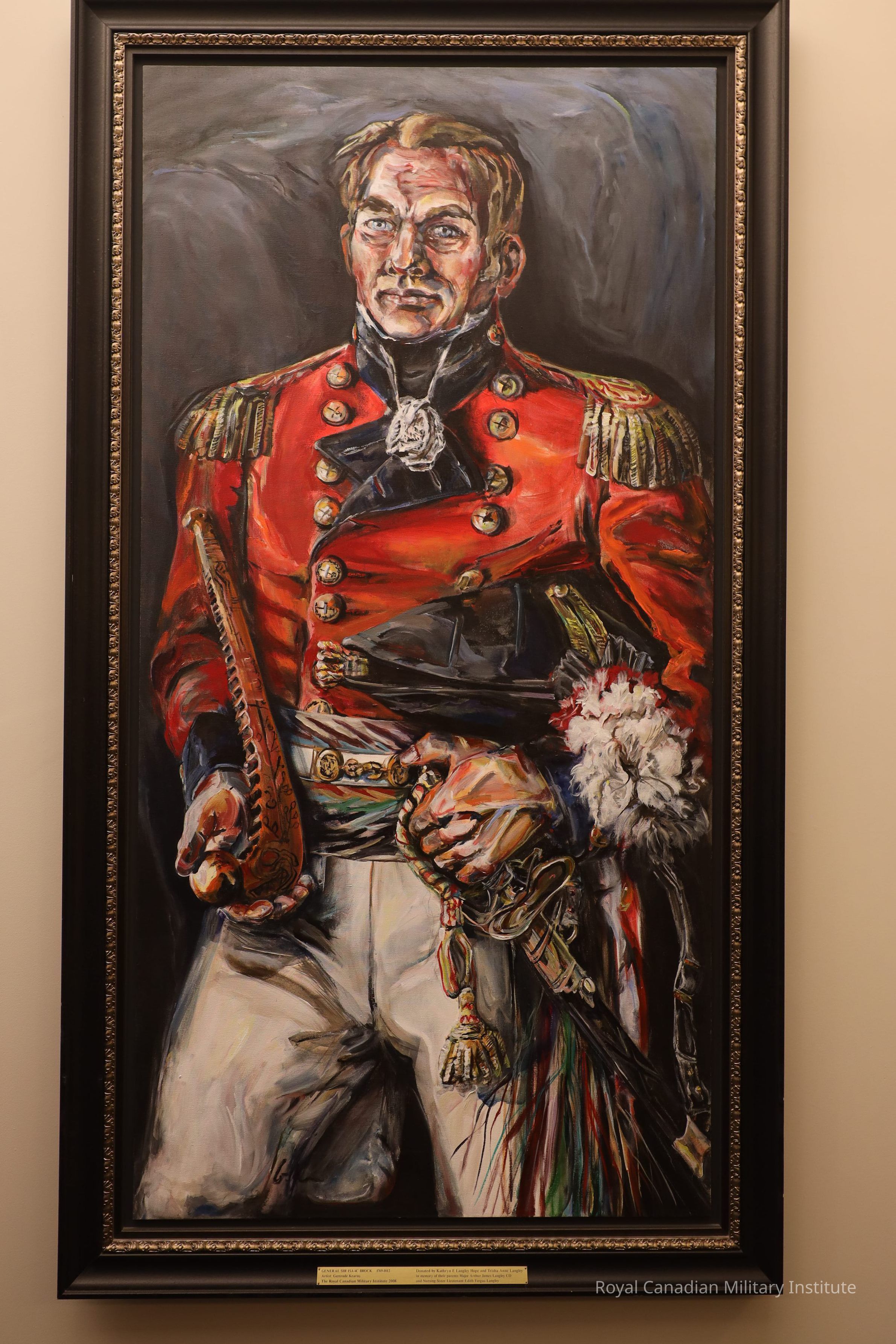 Oil painting (oil on canvas) "Major-General Sir Isaac Brock, 1769-1812." Brock is bareheaded, in crimson frock coat with gold bullion epaulettes, buttons, embroidered burgundy waist sash with gold lace/gilt metal waistbelt. He holds a black bicorne hat in crook of his left elbow, holds a P1803 sword in his left hand. In his right hand, he holds a "peace pipe."Made/Created