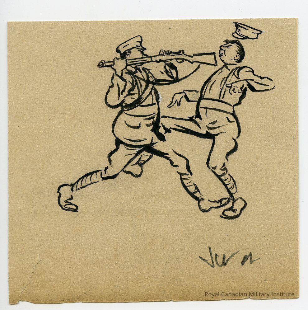 Winslow Mortimer pen/ink cartoon entitled "Rifle Drill: The Buttstroke." This cartoon features two soldiers fighting. The soldier on the left is ramming the butt of his rifle into the other soldier's face. The force of the blow has blown the soldier's cap right off his head, and it hovers above his head. There is a signature in the bottom right corner of the sketch.Made/Created