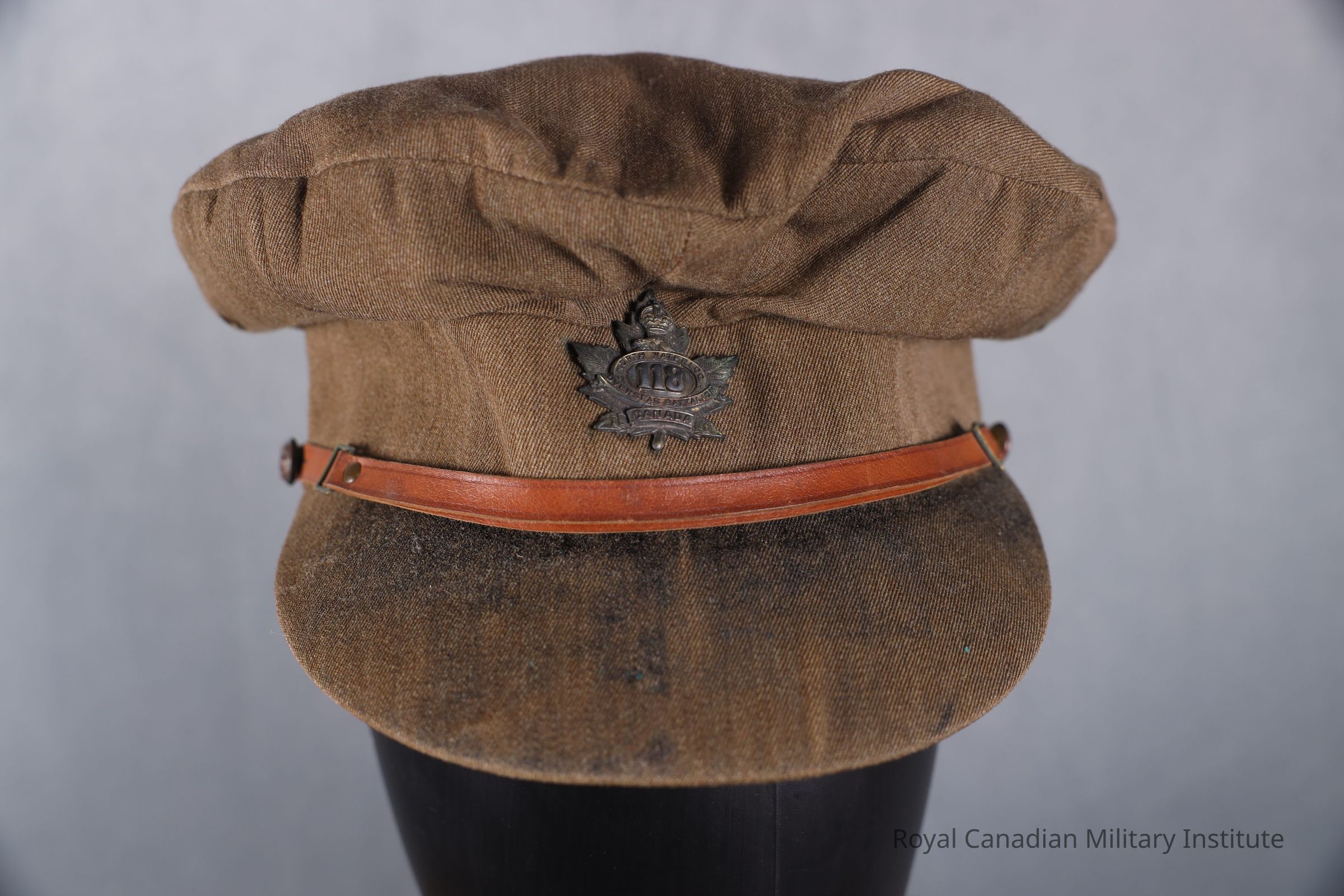 1916 Canadian Expeditionary Forces 118th North Waterloo Infantry Battalion Lieutenant's cap. The body, the cap band, and the peak are made of khaki green twill wool. The body has two brass grommets (1 cm) on either side. Two brass British general listing buttons are on either side of a leather chin strap (30.5 cm), adjustable with two rectangular brass buckles (1 cm wide x 1.2 cm high). The badge is the Canadian Expeditionary Forces 118th North Waterloo Infantry Battalion and fixed with a pin on the inside. The sweatband is made of a brown leather. The crown body is lined with a tan, silk or cotton twill.Context