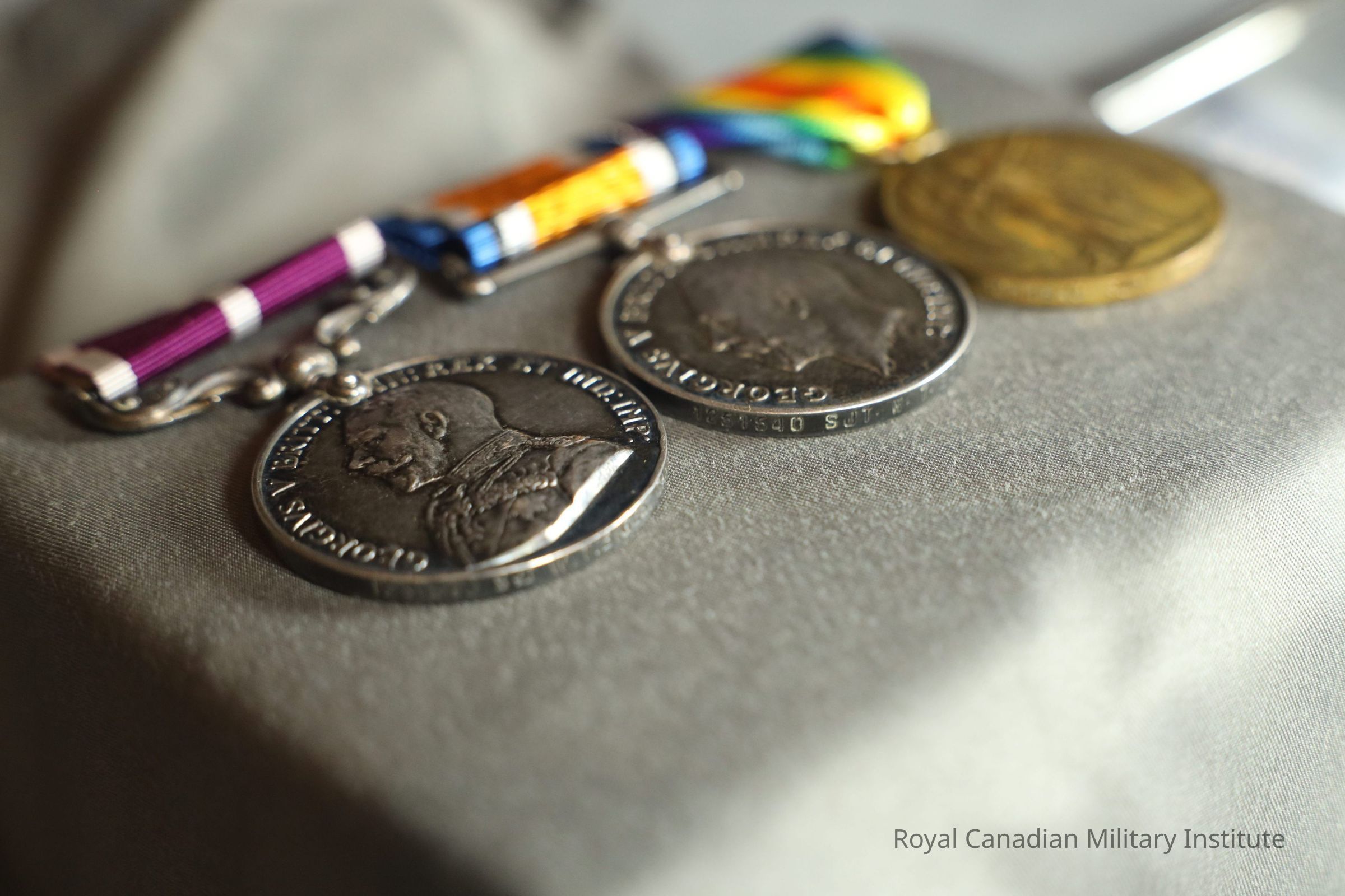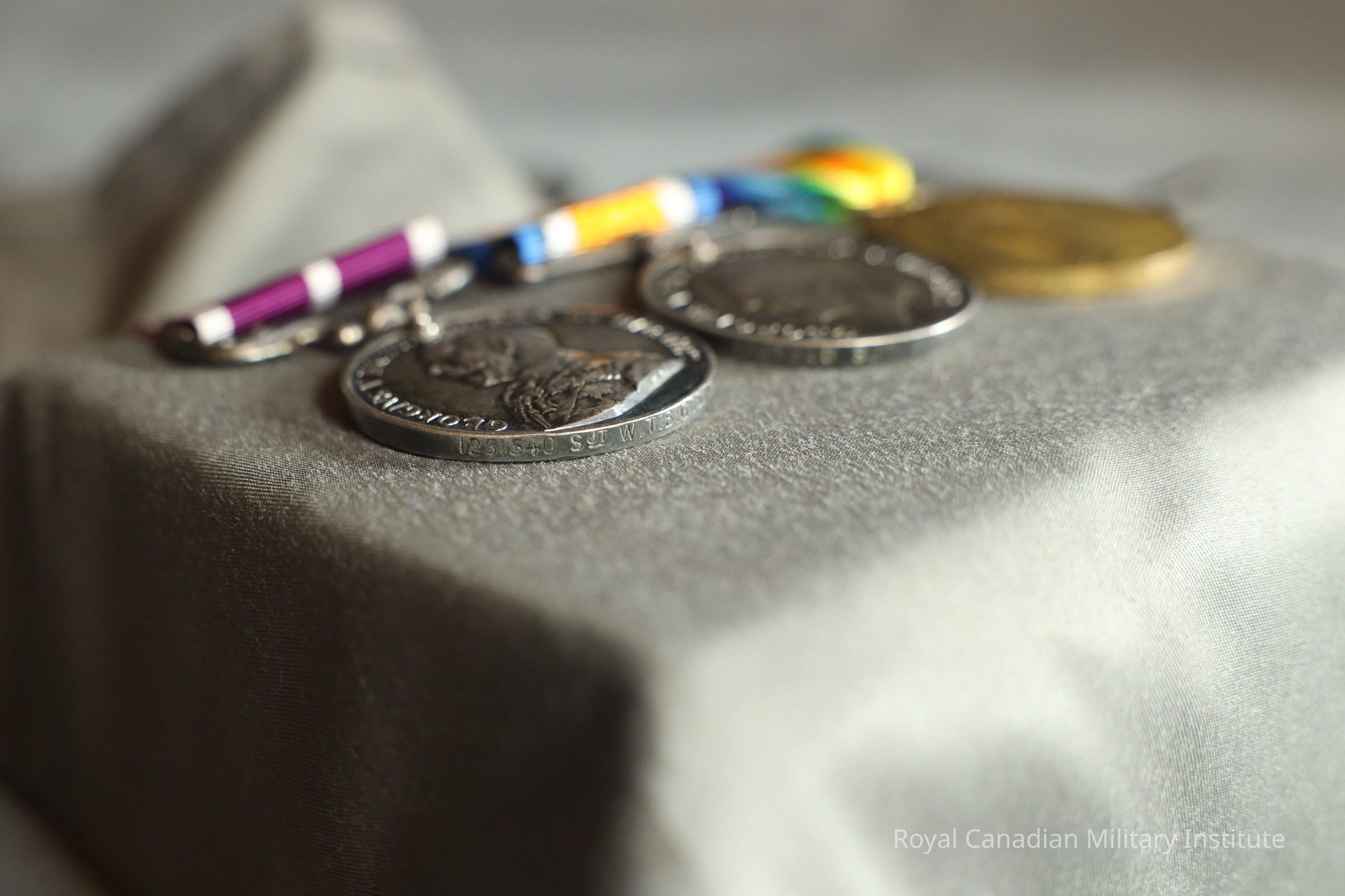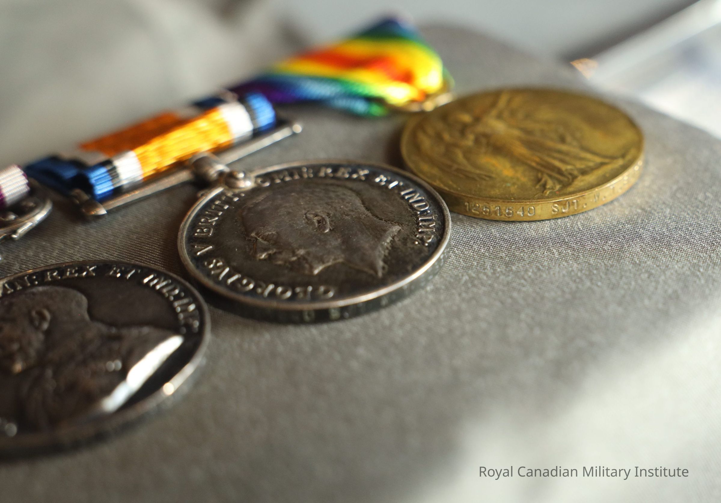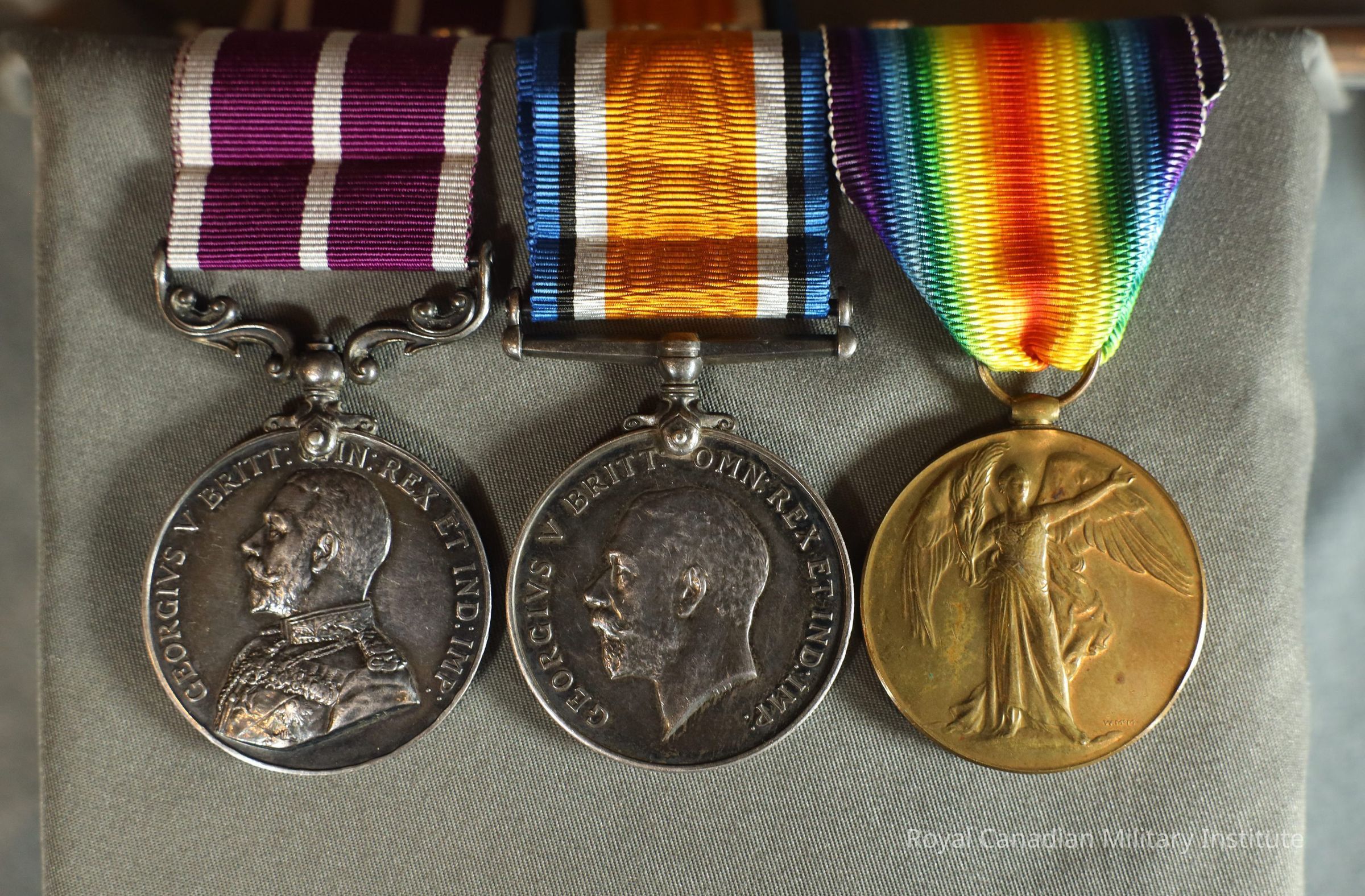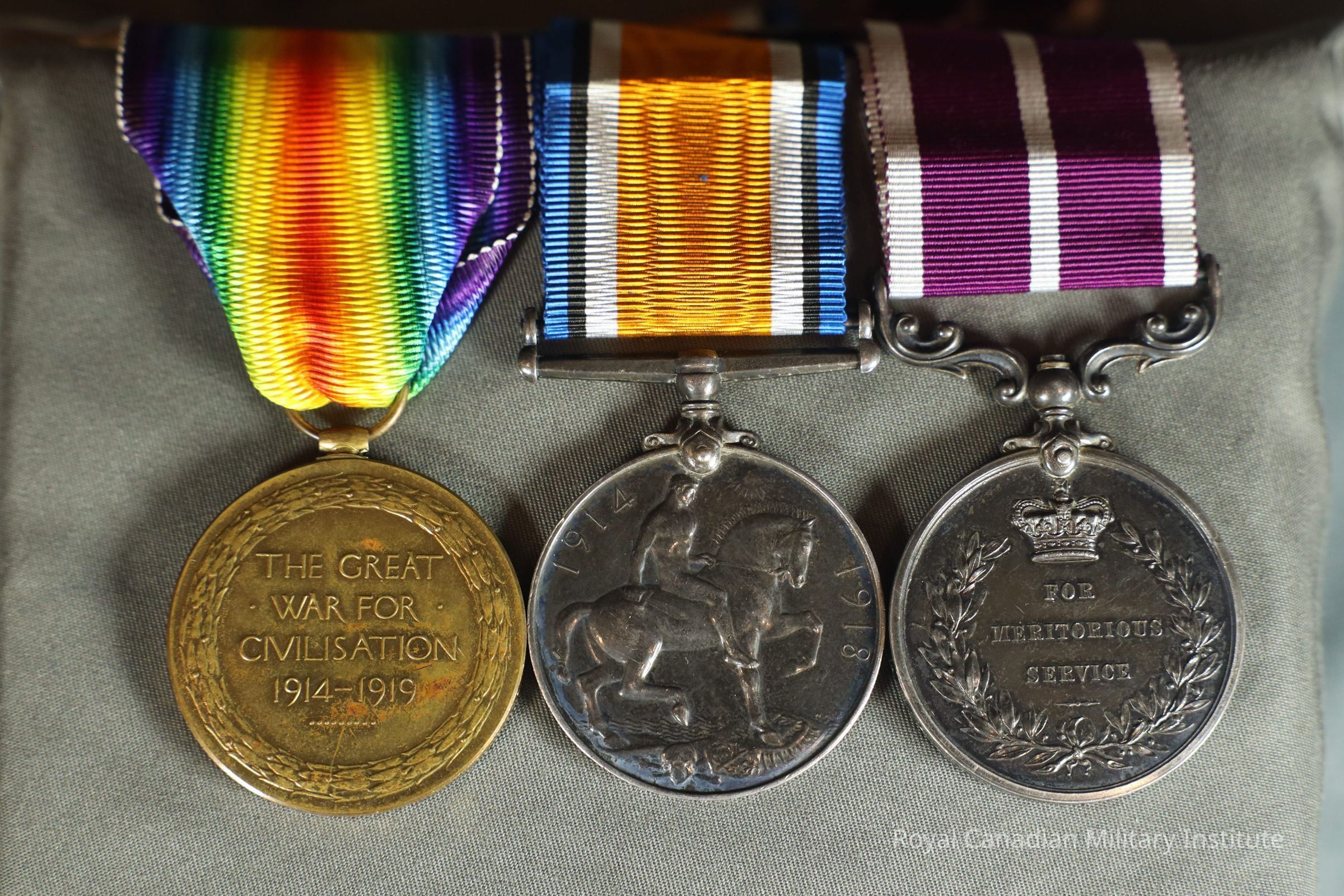 The Allied Victory Medal includes a rainbow ribbon, representing international Allies and friendships. The bronze medal depicts Victory, a Roman and Greek goddess. One arm is outstretched while the other holds a palm branch, representing peace. The back of the medal reads, "The Great War for Civilisation." A laurel wreath surrounds the wording.Context
