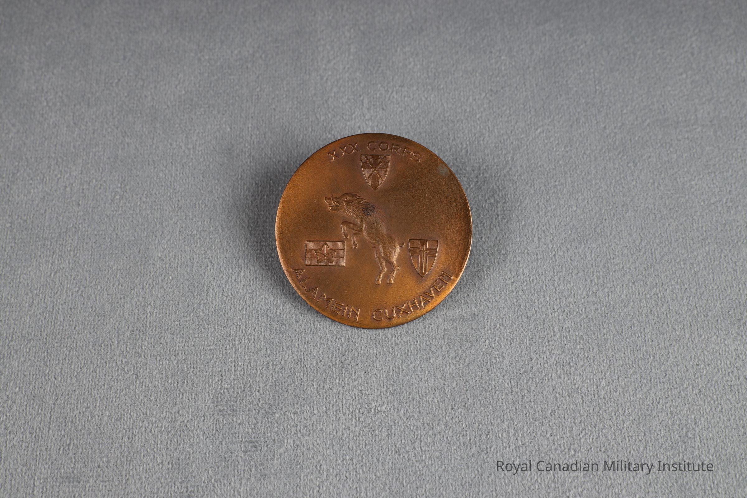 1945 Belgian civilian "30th Corps" souvenir medallion. Circular, bronze. Obverse a "wild boar" (symbol of 30th Corps) flanked by three shields: 21st Army Group, Second Army, First Canadian Army. At top, are titles "XXX Corps" "Alamein Cuxhaven" Reverse is laurel leaves