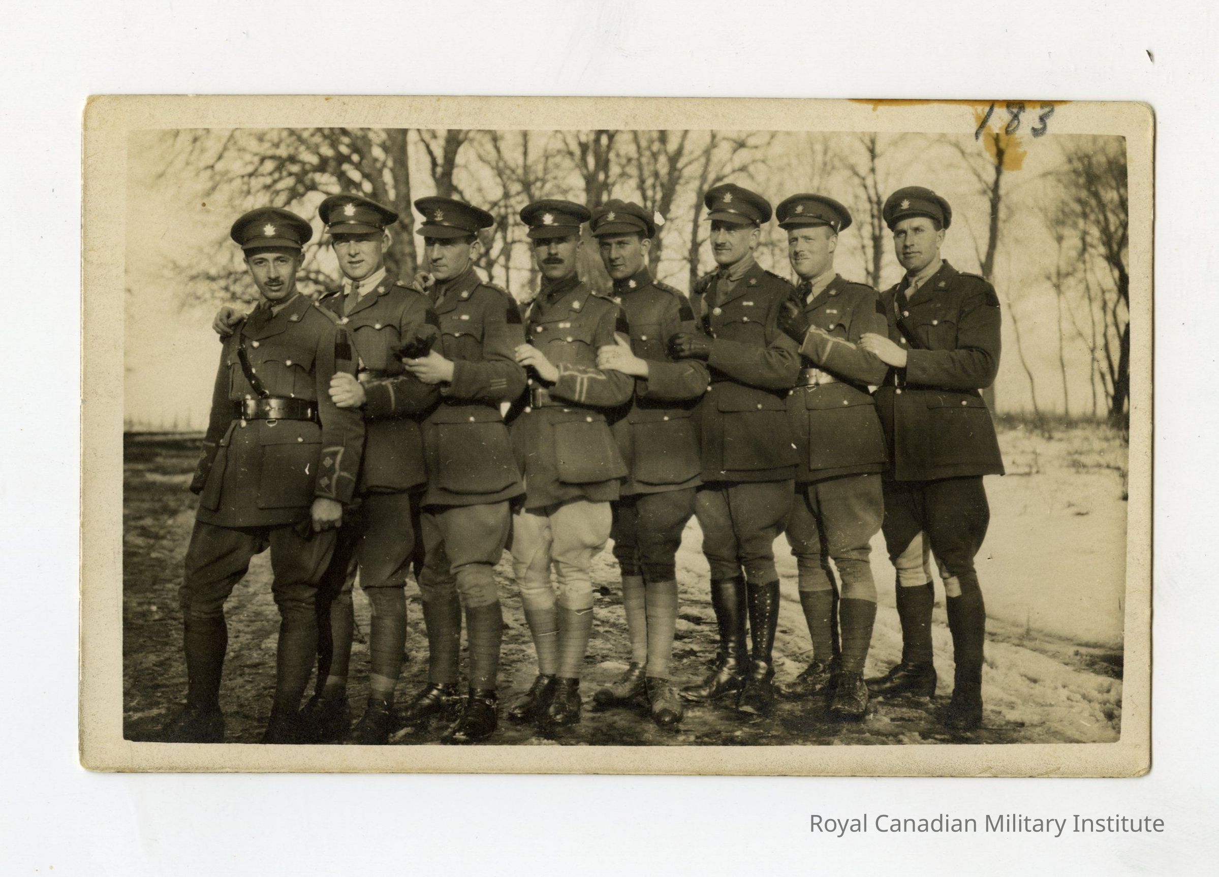 An unidentified Real Photo Postcard (RPPC) of eight 4th Battalion officers in France. The men are staggered in a line, each holding onto the man in front of him. They are all wearing their military uniforms, including their caps. Many of these officers have either gallantry awards, wound stripes or both. They are photographed in a wintery, snowy environment.