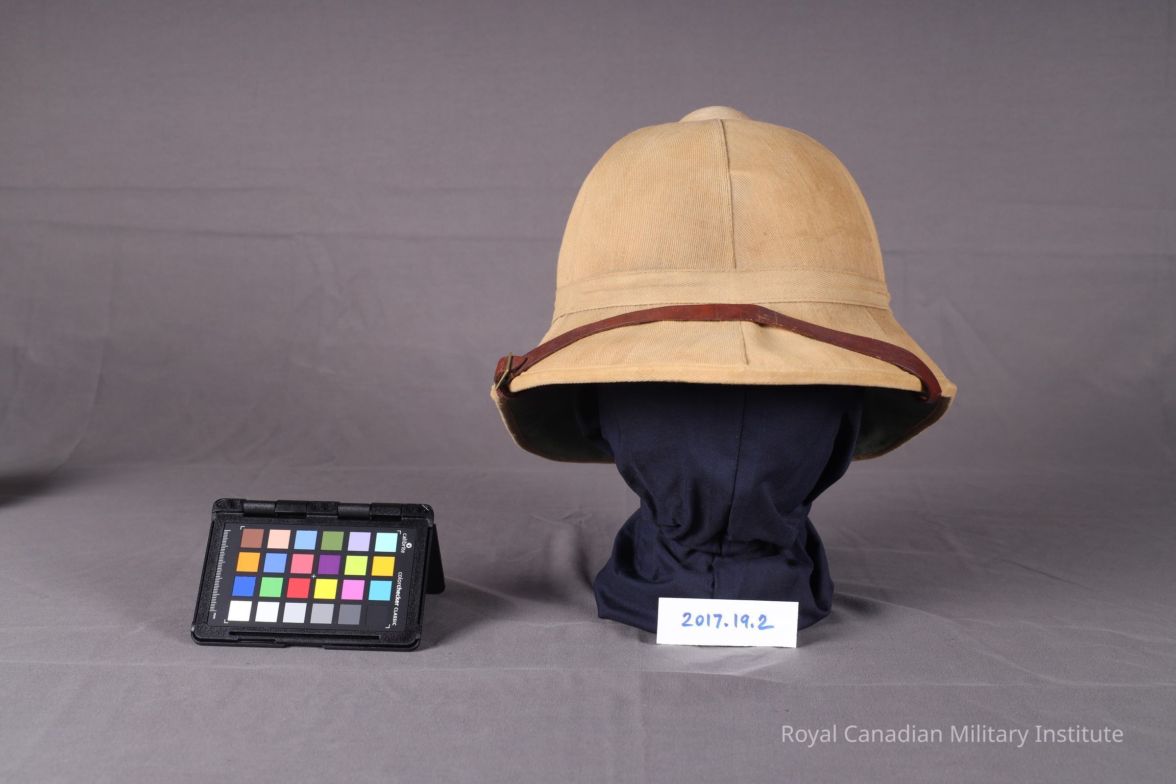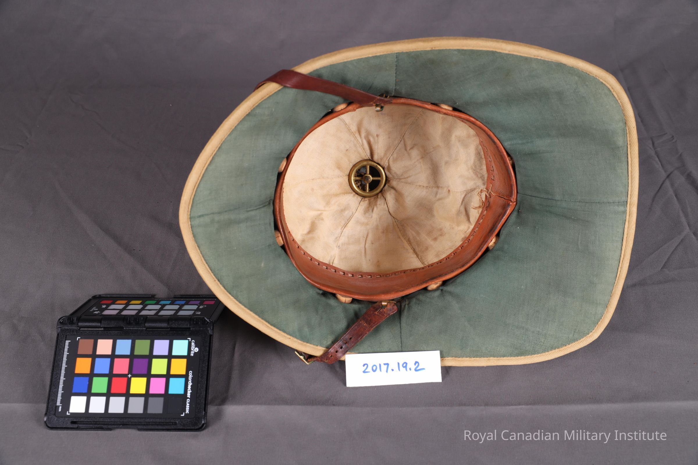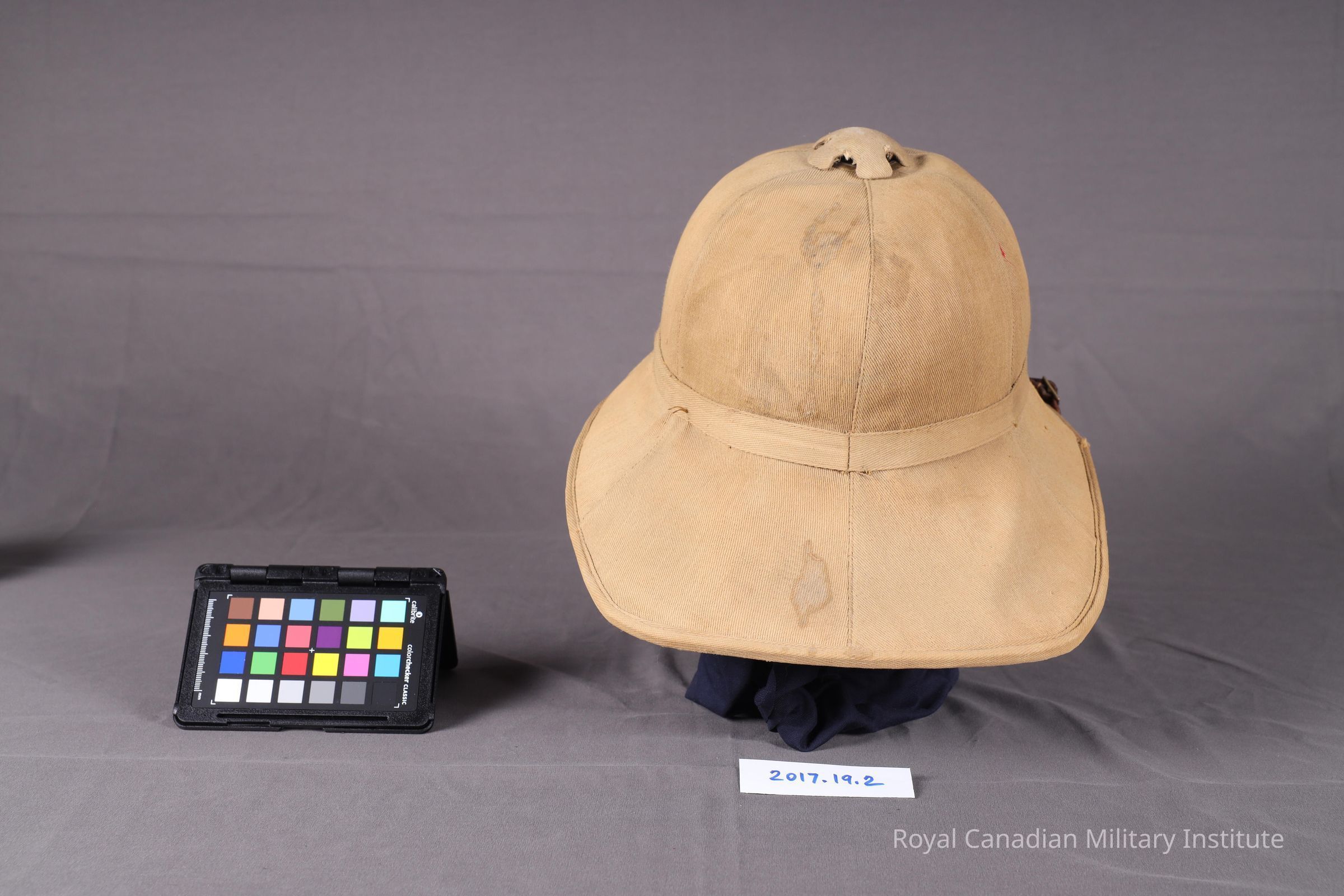 1914-1918 Canadian Universal Pattern helmet (Valcartier) made of khaki tan drill. The helmet is in a Wolseley pattern. On the crown is a screw-on topper that covers the brass ventilator opening. The crown is made with six-piece construction. Connecting the crown and the peak is a thin cap band made of matching twill tape (1.8 cm wide). The peak is also six-piece construction, matching with the seams of the crown. The crown and peak are stiffened with cork. The helmet is missing its cloth pugaree and badge. On the sides of the helmet, under the cap band, are brass rivets (1.2 cm diameter) that hooks onto the chinstrap on the inside of the helmet. The chinstrap (46 cm long x 1.3 cm wide) is made with a red-brown medium leather. It is adjustable with a square buckle and eleven buckle holes.