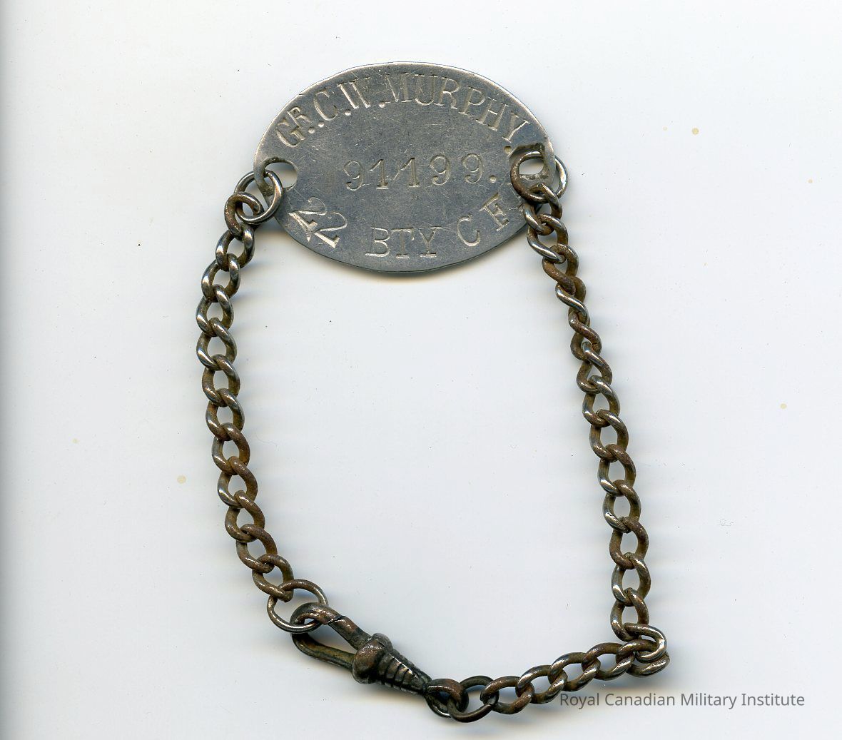 1916-1918 Canadian Field Artillery identity bracelet. Oval aluminum or white metal disc holed at edges for 19 cm. Long steel link chain. Bracelet stamped: "GR. C.W. MURPHY 91199 22 BTY CFA"Made/Created
