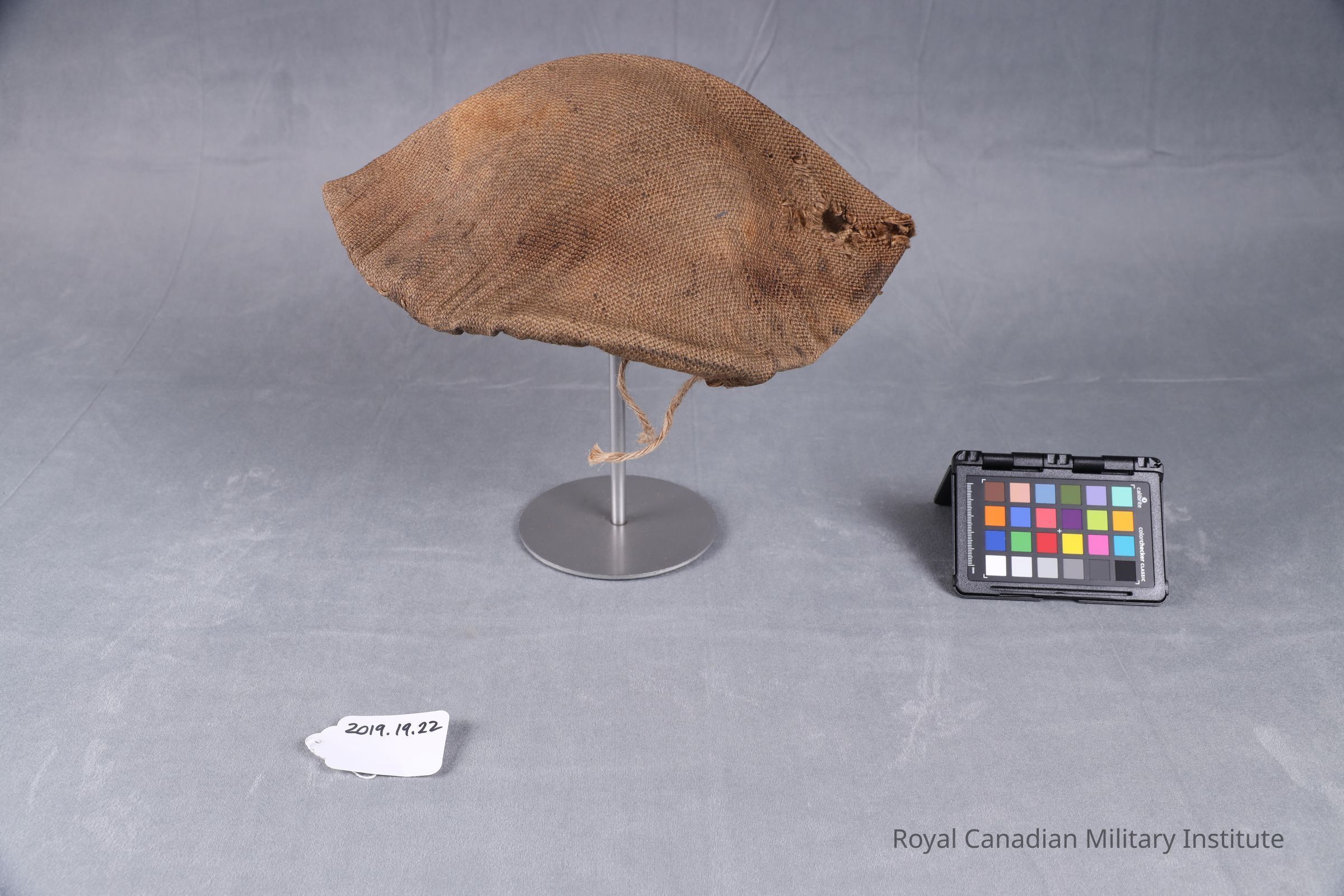 Worn over top of steel "Brodie" helmets by British Expeditionary Forces/Canadian Expeditionary Forces during World War One to camouflage soldiers when they emerged from the trenches. Mud would be smeared onto the helmet to aid the camouflage.Made/Created