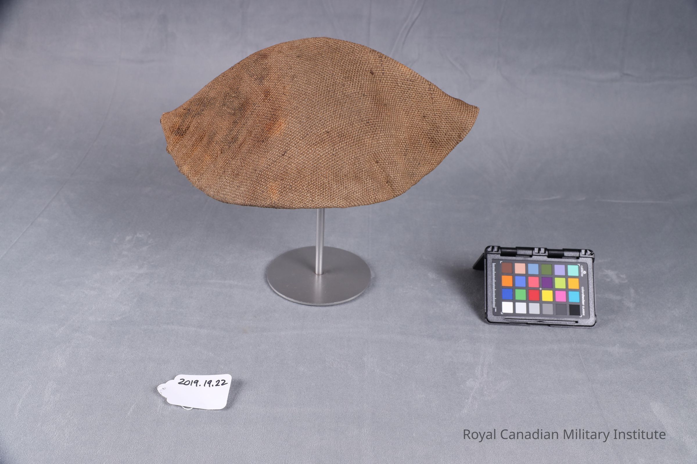1917-1918 British Expeditionary Forces/Canadian Expeditionary Forces Brodie Helmet Hessian camouflage cover made of a single layer of brown burlap. The cover is circular. On the edges of the cover, twine is woven into the burlap to create an adjustable drawn string. The cover is unlined.Use