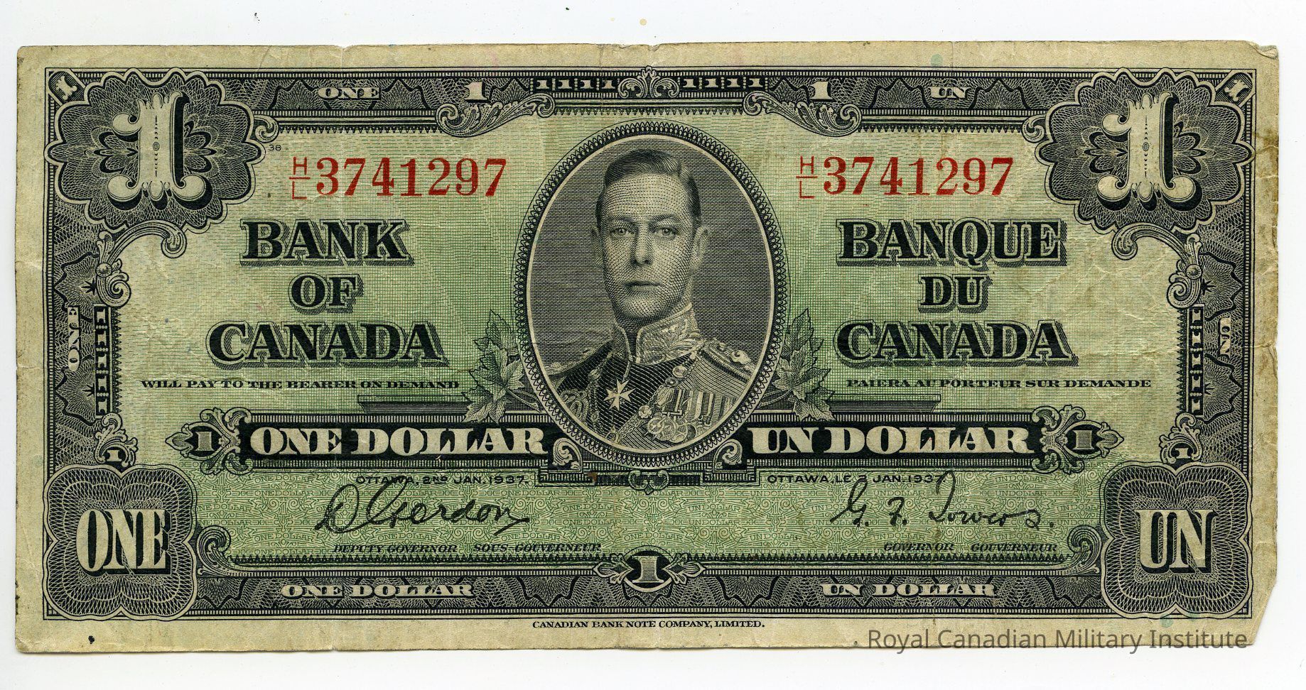 Canadian one dollar bill issued in 1937. Serial number 3741297. The bill features King George, and has both English and French on it. Four signatures can be found on the back: "Roberta (?) Holeston, Cowfand Elinor (?), Andre Kostelonetz (?), and Peggy Elliott".Made/Created