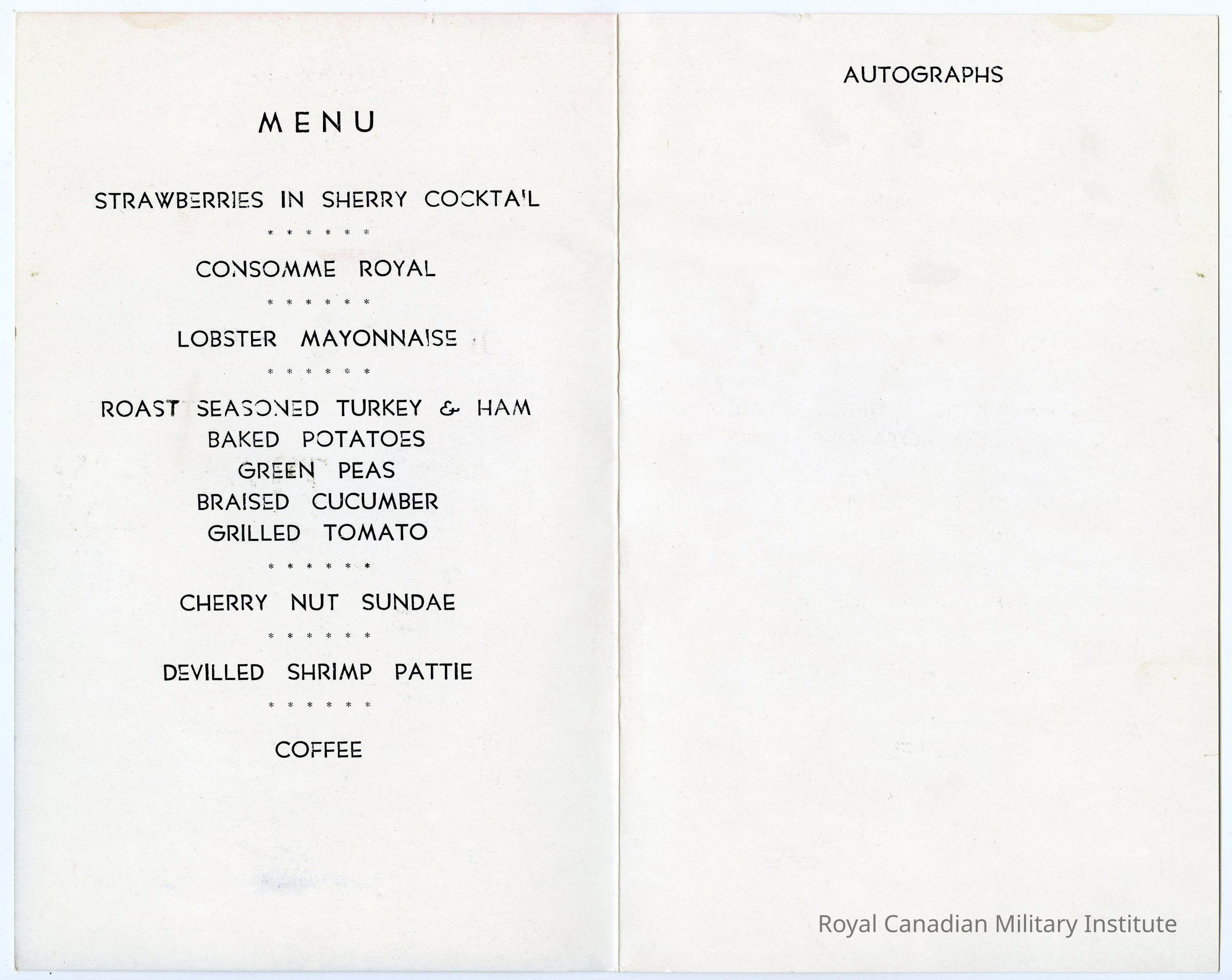 Inside, on the left, is the menu for the event. There were 7 courses. The left side of the menu was reserved for autographs received during the event. It is a blank page that simply says "Autographs" at the top. It is blank.Made/Created