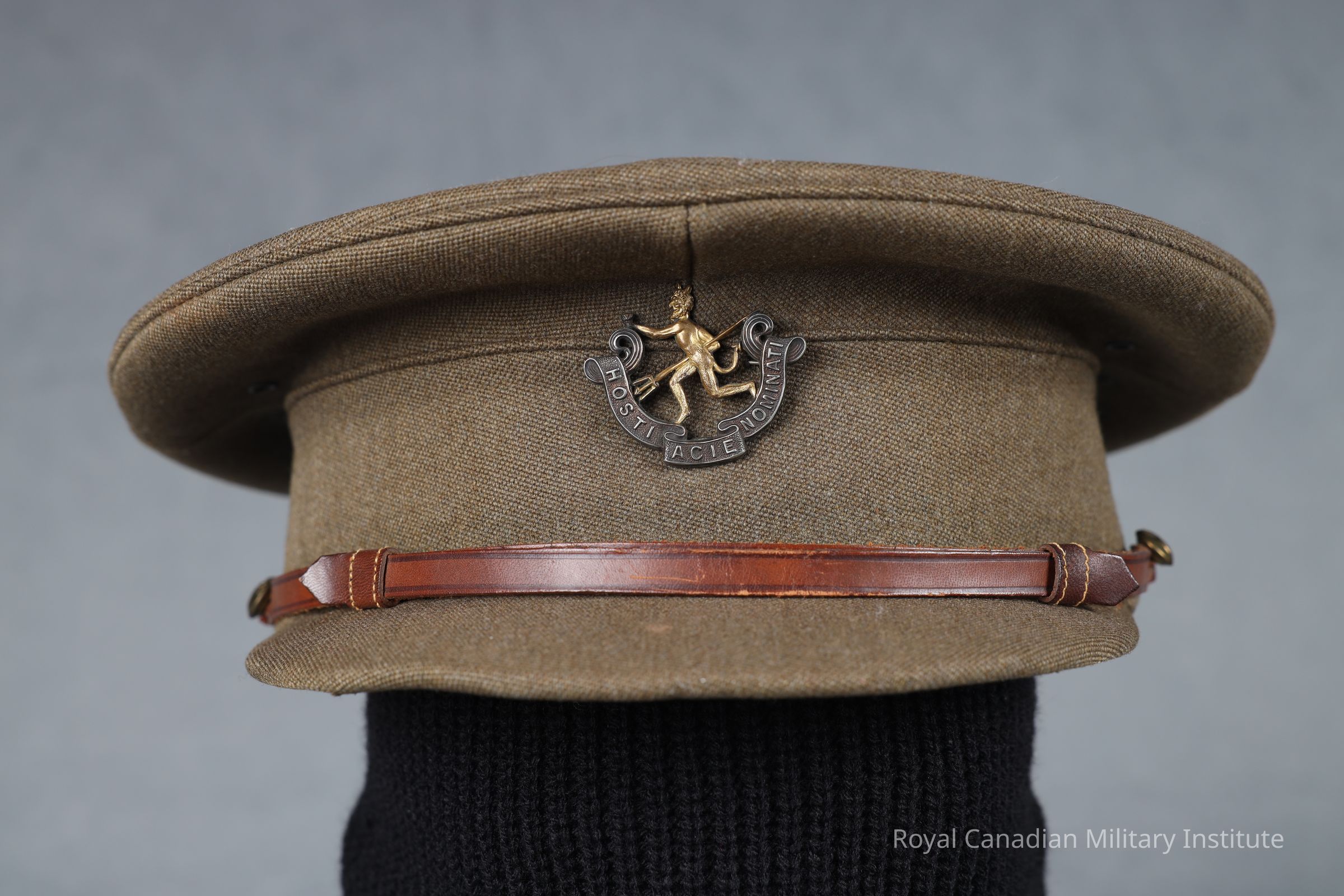 1918-1919 8th Battalion (Winnipeg Rifles "Little Black Devils") officer's service dress cap. Khaki green fine napped wool crown, (wire stiffener), body (2 brass reinforced grommet holes each side), cap band. Attached to cap is Battalion cap badge in blackened silver, scrolled title HOSTI ACIE NOMINATI and gilt devil device, badge is 4 cms. square. Mid-brown leather chinstrap (w/adjustable sliders) (31.2 cm long x 1 cm wide), attached to the cap by two brass CANADA buttons. Stiffened peak in the same material.