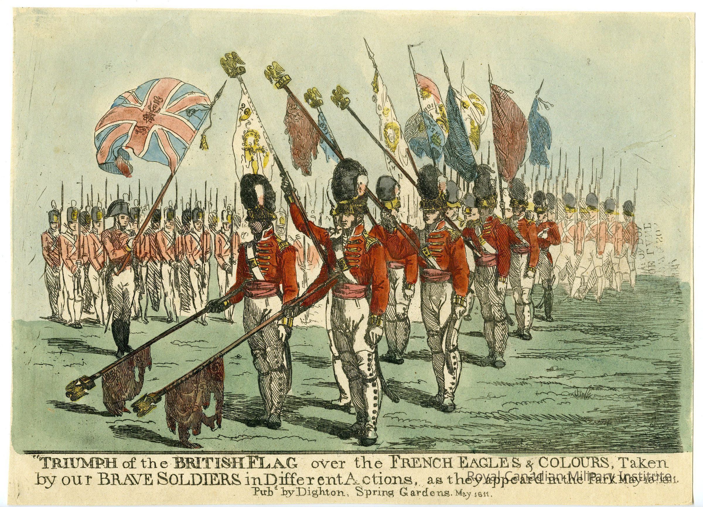 Coloured print showing British soldiers holding flags. While many are tattered and ripped, the British flag held by one soldier remains complete and beautiful. Under the print, text reads: "Triumph of the British Flag over the French eagles & colours, Taken / by our Brave Soldiers in Different Actions, as they appear'd in the Park May 18th, 1811. / Pub'd by Dighton, Spring Gardens, May 1811."