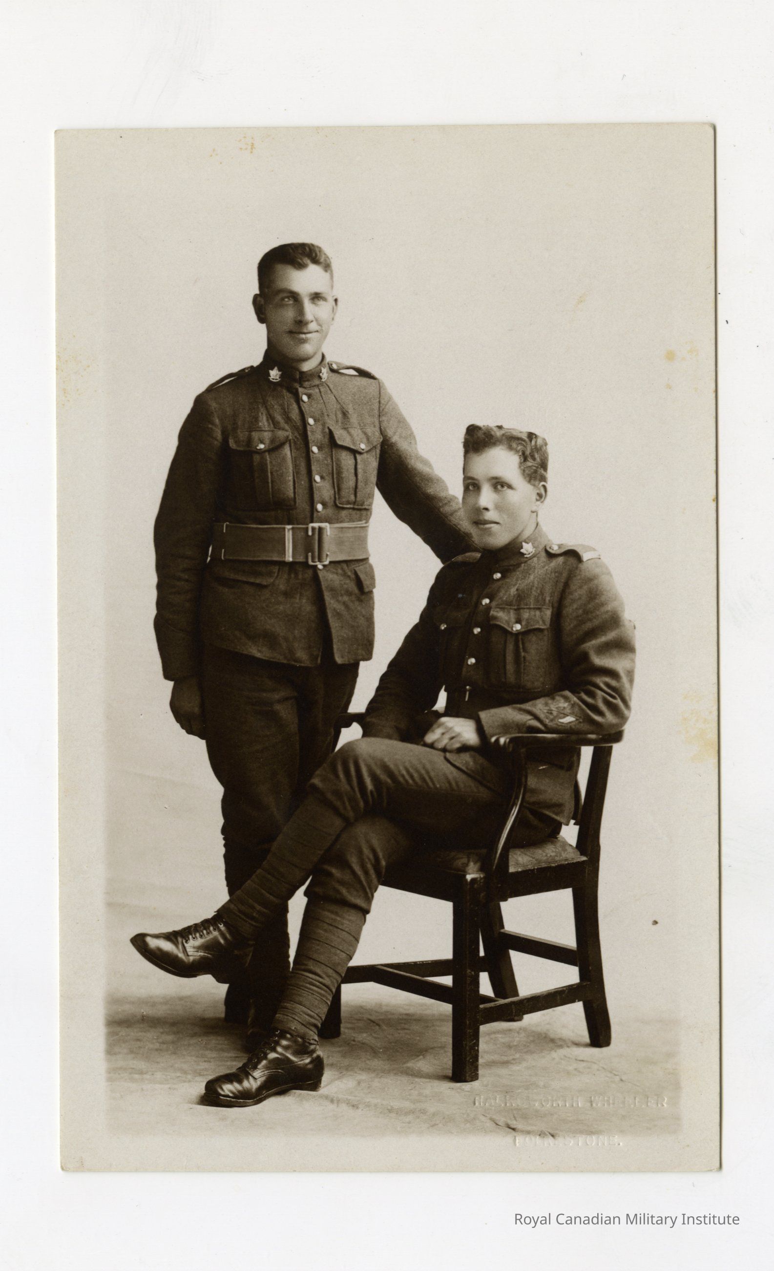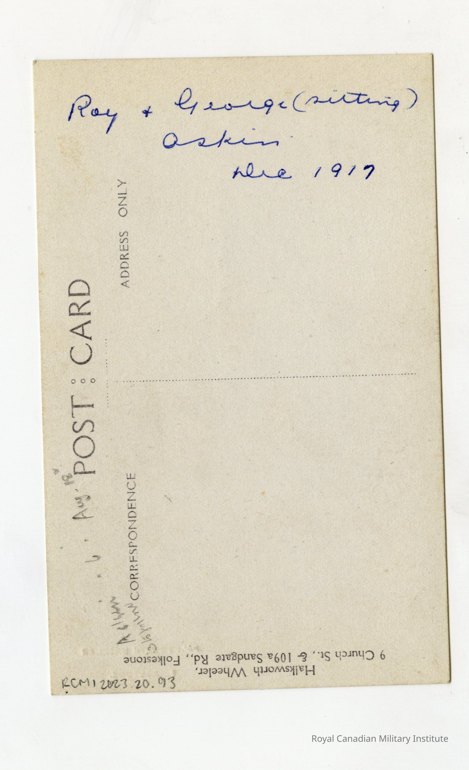 A Real Photo Postcard (RPPC) of Roy Dornan Askin #892600 and his brother Robert George Askin #235008. Both men are wearing their military uniforms, without their caps. According to the inscription on the back, the man sitting down on the right is Robert George, and the one standing is his brother Roy. The inscription also dates this postcard to 1917. Embossed on the bottom right corner of the front, "Halksworth Wheeler / Folkstone".