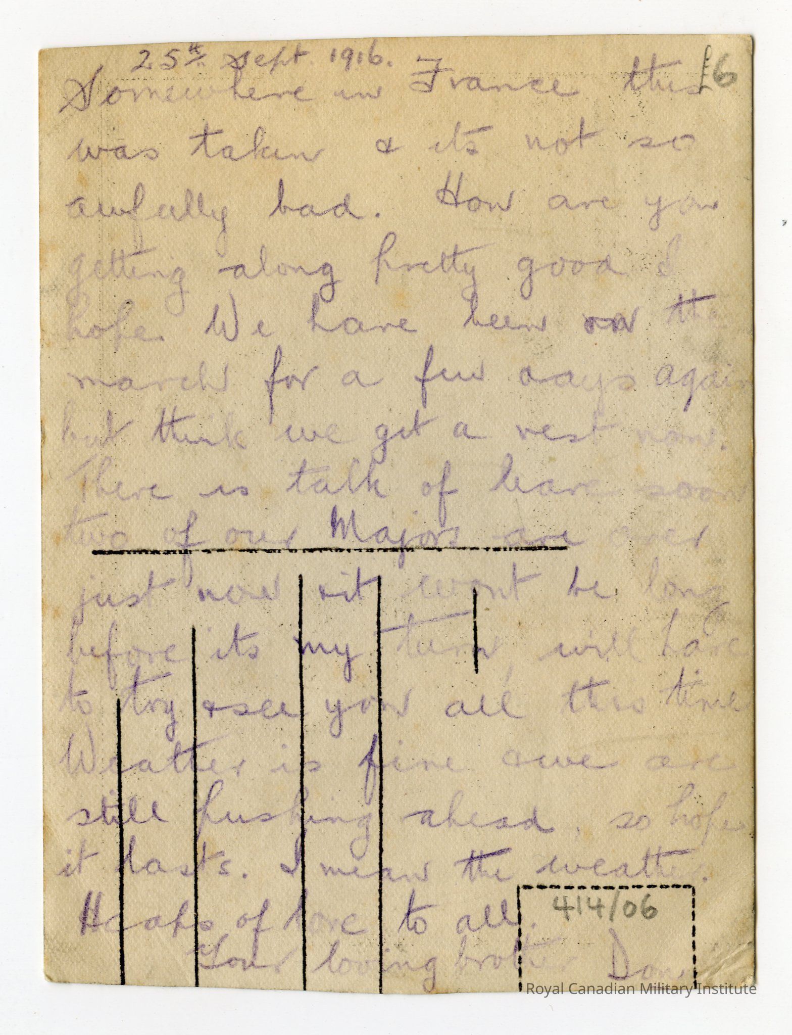 A Real Photo Postcard (RPPC) of a Princess Patricia's Canadian Light Infantry (PPCLI) Captain, photographed in France. Front side of the postcard depicts a PPCLI Captain, standing in a carpeted studio in full military uniform. The edges of the photograph blur into the postcard paper it is printed onto. Dated Sept. 25th, 1916. Signed simply "Don".