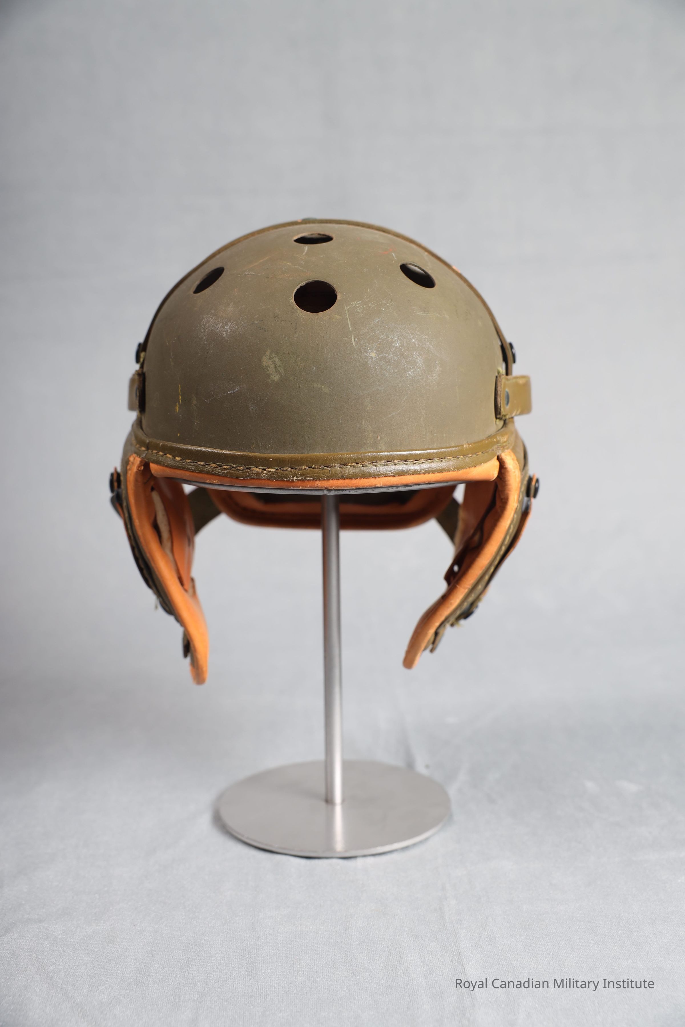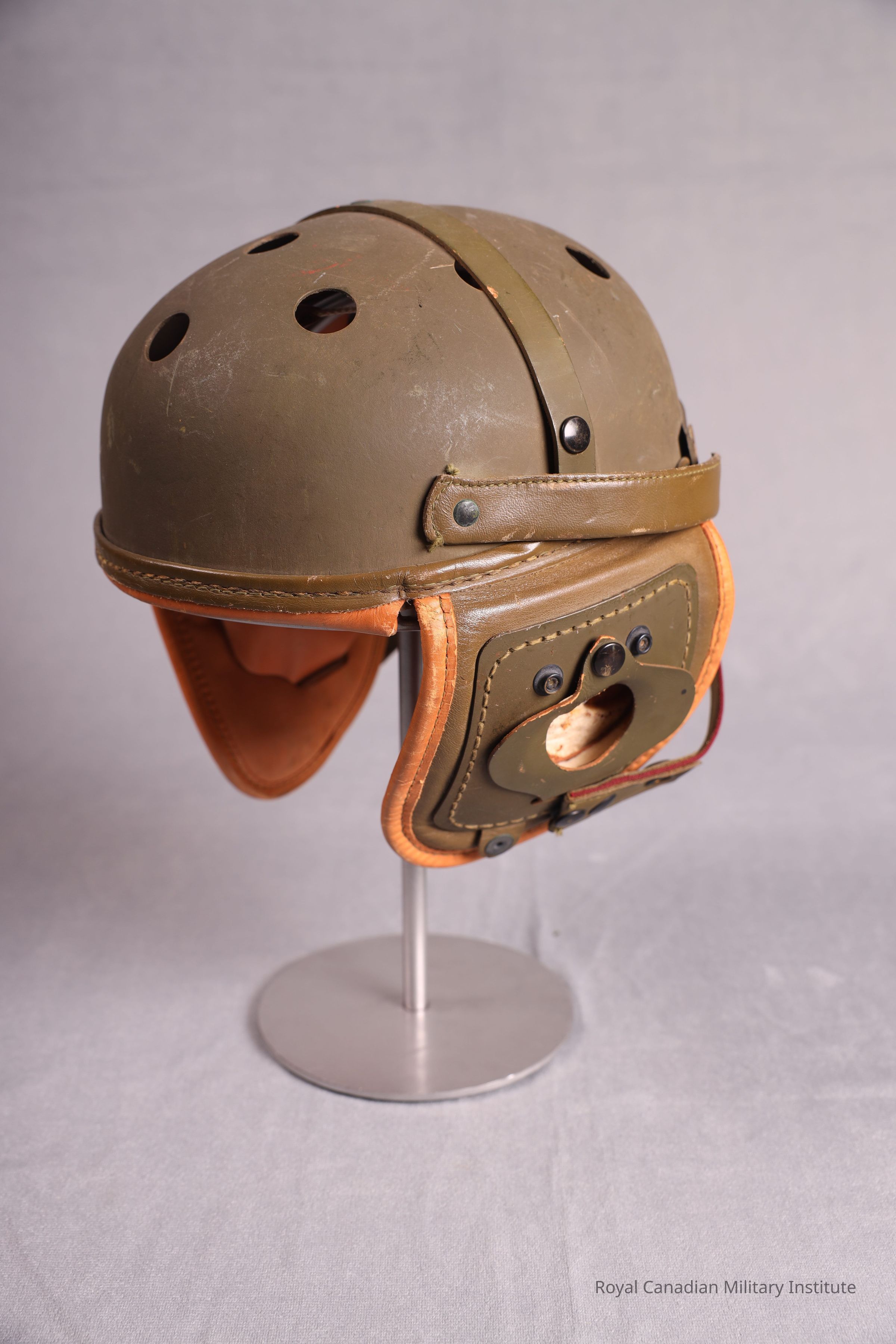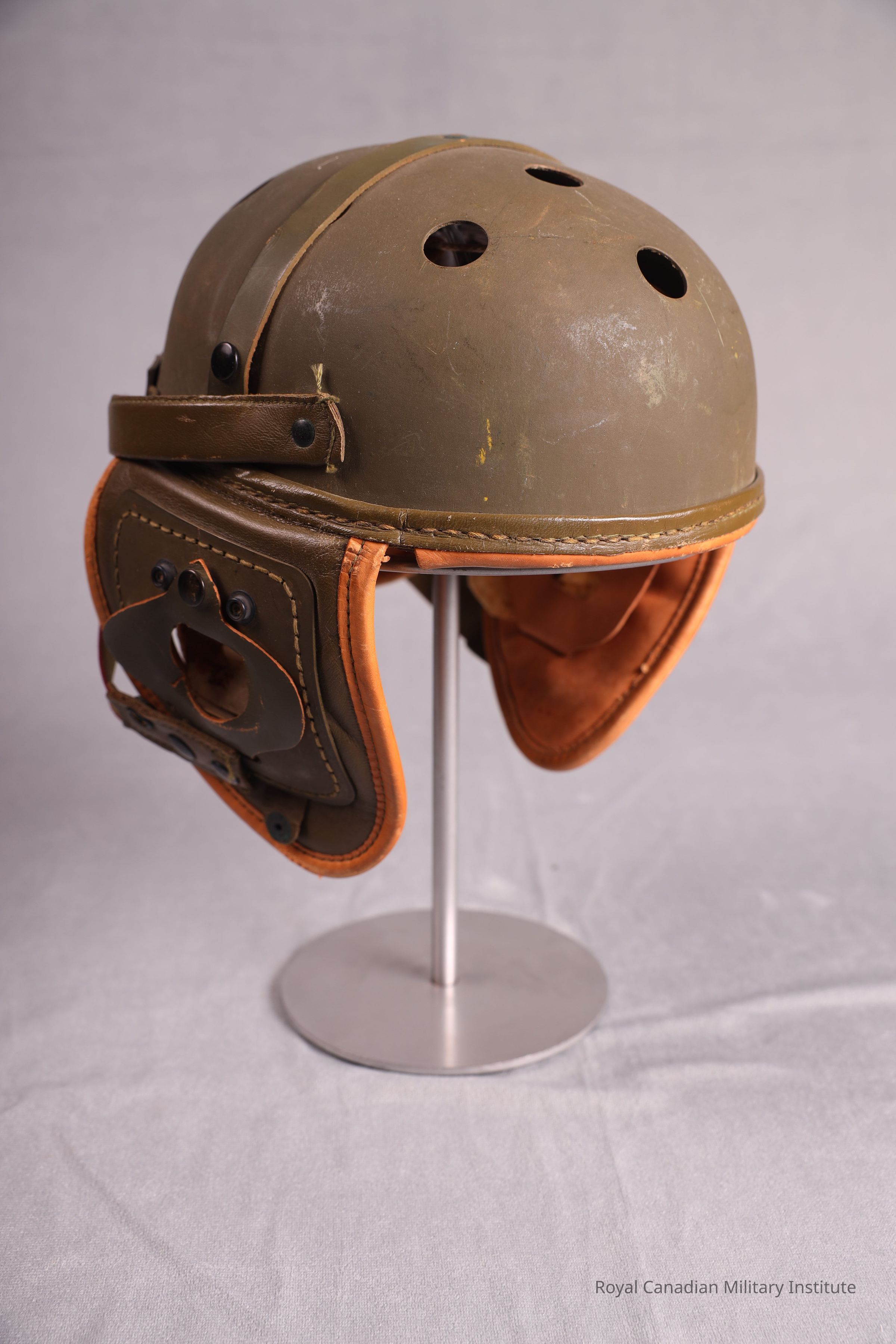 1942-1945 American/Canadian Army Armoured Regiment M38 tanker's helmet. The outer shell and rear neck guards are made of a green fibre resin. Across the top of the steel is a band (30 cm long x 1.5 cm wide) made of green leather held in place by two black metal rivets (1.3 cm diameter) on either side of the helmet and one metal rivet (1 cm diameter) on the crown. Ten holes (2 cm diameter) are punched into the top of the shell. There are four black rivets on rear neck guard. A green leather padded headphone clamp is on either side of the head. The ear flaps are made with green leather and the same green fibre resin as the shell. The ear flaps have a hole on the outside (3.5 cm diameter) and the inside (3 cm long x 1.5 cm wide). The inside of the flaps are cushioned with a white wool felt. The two ear flaps and the rear neck guard is connected with a green and red trimmed elastic web (38 cm long x 2.5 cm wide when relaxed). The inside lining is made of a tan leather. The suspension system on the inside consists of four panels of leather connected with a white cotton cord at the inner crown.Context