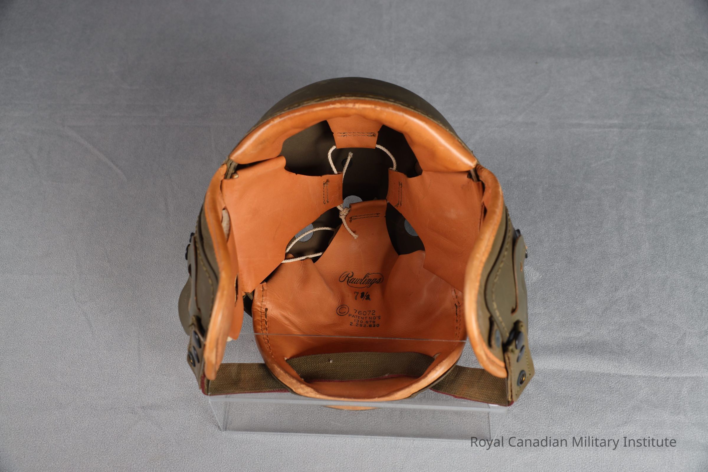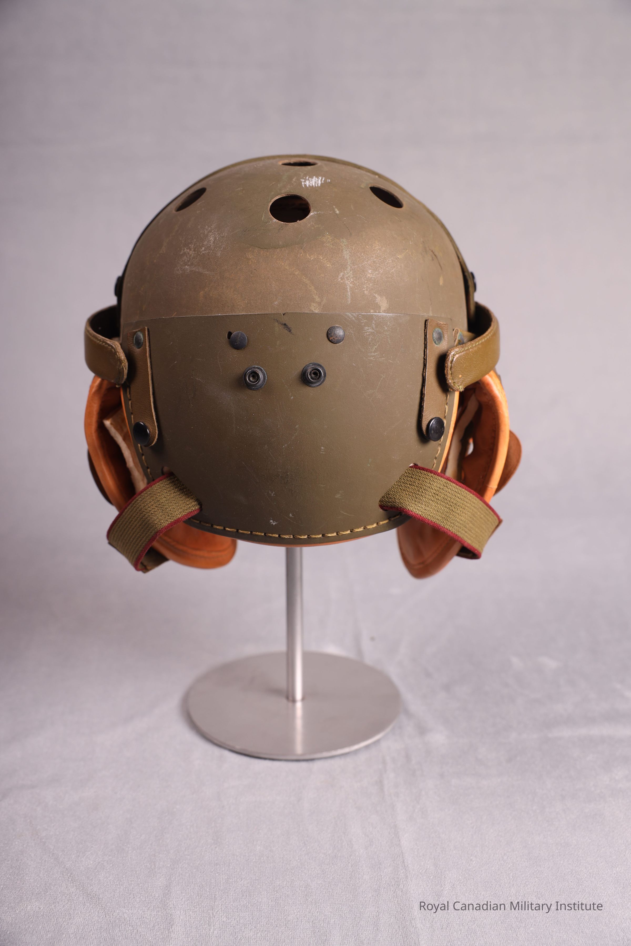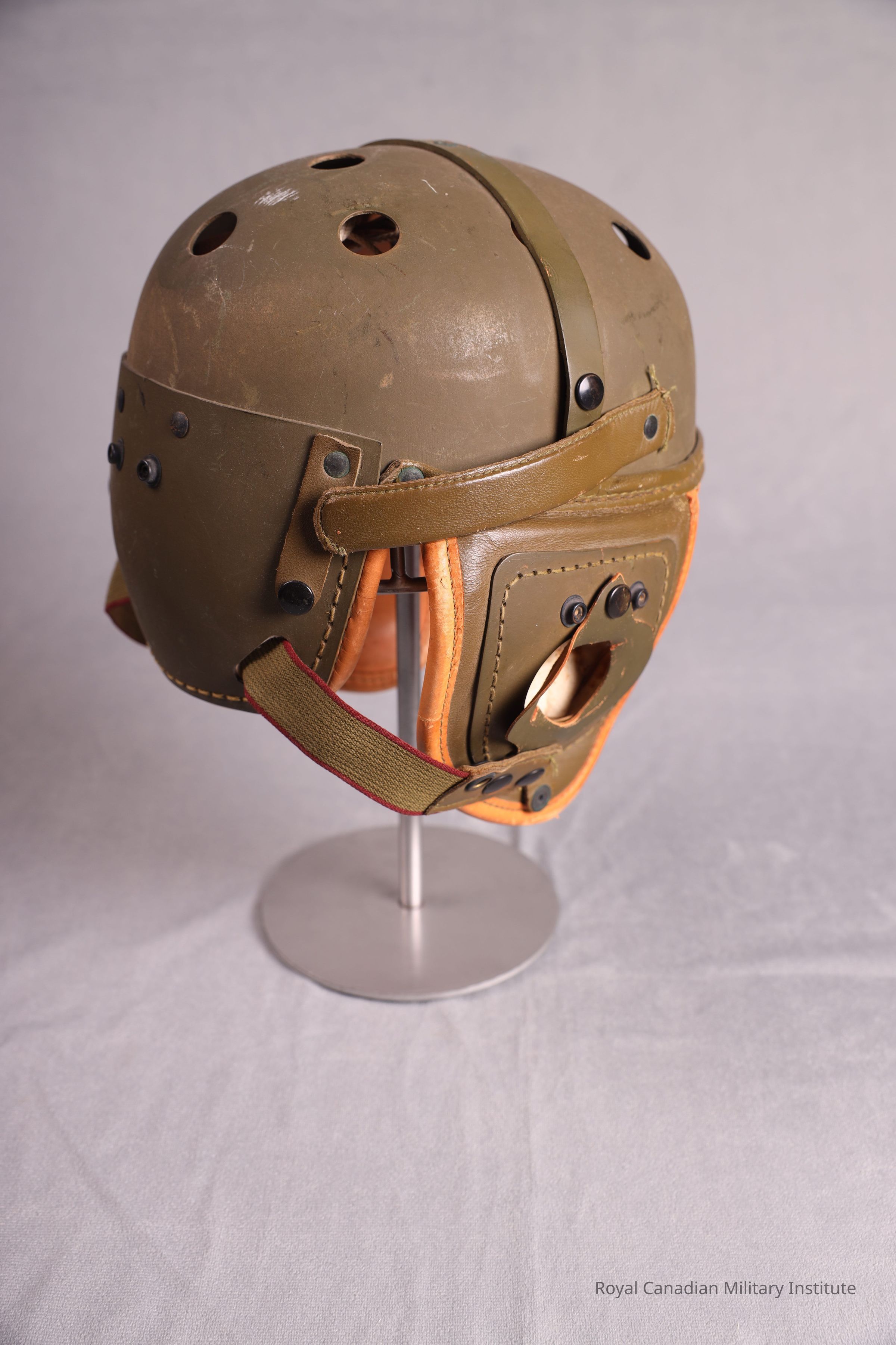 1942-1945 American/Canadian Army Armoured Regiment M38 tanker's helmet. The outer shell and rear neck guards are made of a green fibre resin. Across the top of the steel is a band (30 cm long x 1.5 cm wide) made of green leather held in place by two black metal rivets (1.3 cm diameter) on either side of the helmet and one metal rivet (1 cm diameter) on the crown. Ten holes (2 cm diameter) are punched into the top of the shell. There are four black rivets on rear neck guard. A green leather padded headphone clamp is on either side of the head. The ear flaps are made with green leather and the same green fibre resin as the shell. The ear flaps have a hole on the outside (3.5 cm diameter) and the inside (3 cm long x 1.5 cm wide). The inside of the flaps are cushioned with a white wool felt. The two ear flaps and the rear neck guard is connected with a green and red trimmed elastic web (38 cm long x 2.5 cm wide when relaxed). The inside lining is made of a tan leather. The suspension system on the inside consists of four panels of leather connected with a white cotton cord at the inner crown.Context