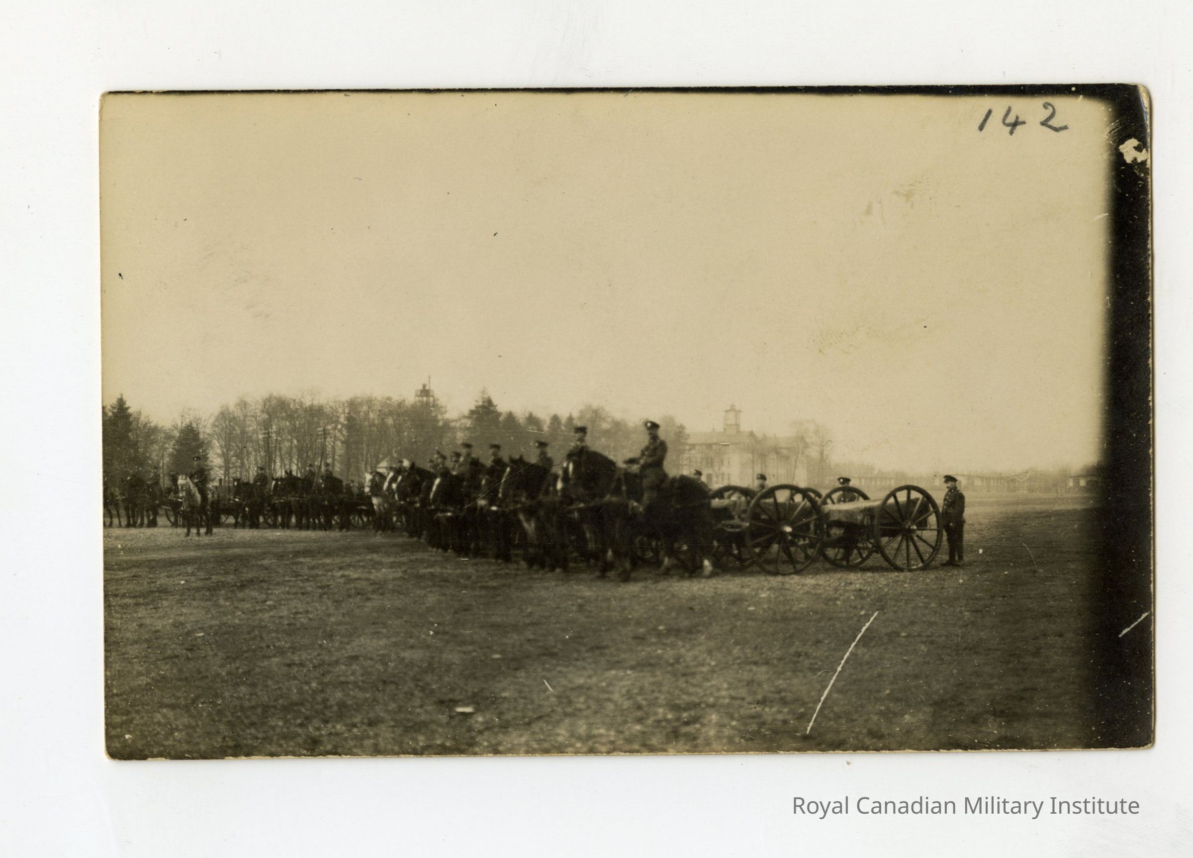 An unidentified Real Photo Postcard (RPPC) of 4th Battalion soldiers on horseback pulling supply carts. Photograph depicts a line of soldiers with horses and carts on an open field. In the background, there's a large building and a line of trees. The postcard is dark around the right edge and the top edge.