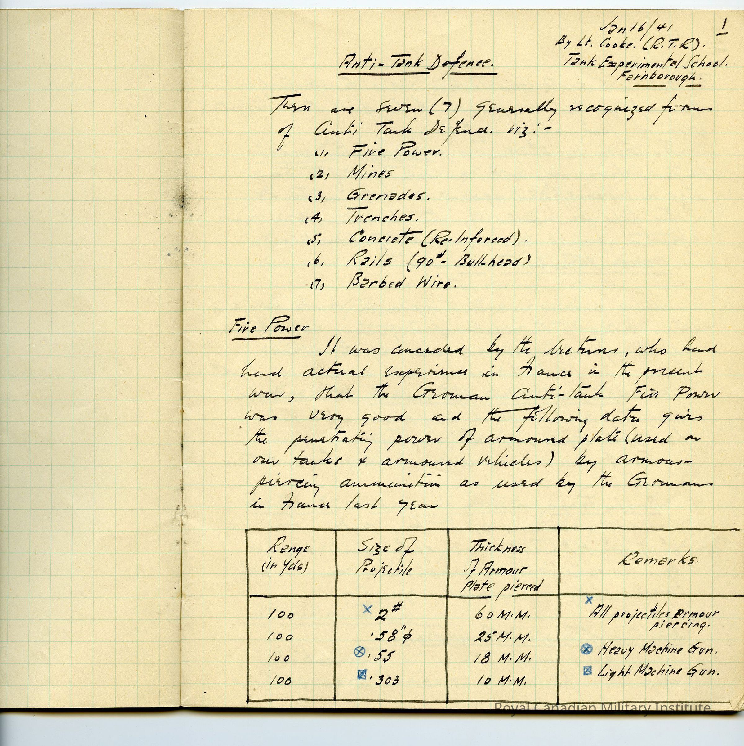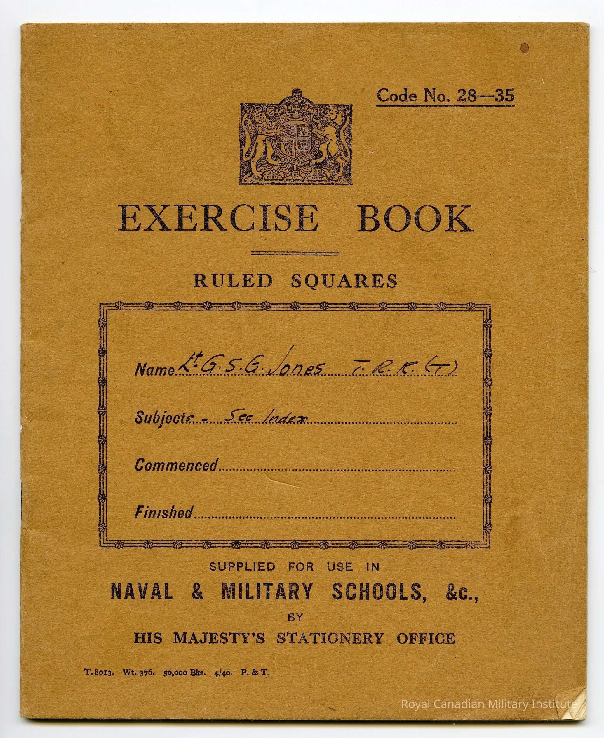 Exercise book (ruled squares) intended for used in naval and military schools. Owned by Lt G.S.G. Jones T.R.R. (T). It contains the notes from a presentation on anti-tank defence by Lt. Cooke (R.T.R) at the Tank Experimental School in Fairborough. The date is given as January 16, 1941. Only 8 pages of the book are filled.