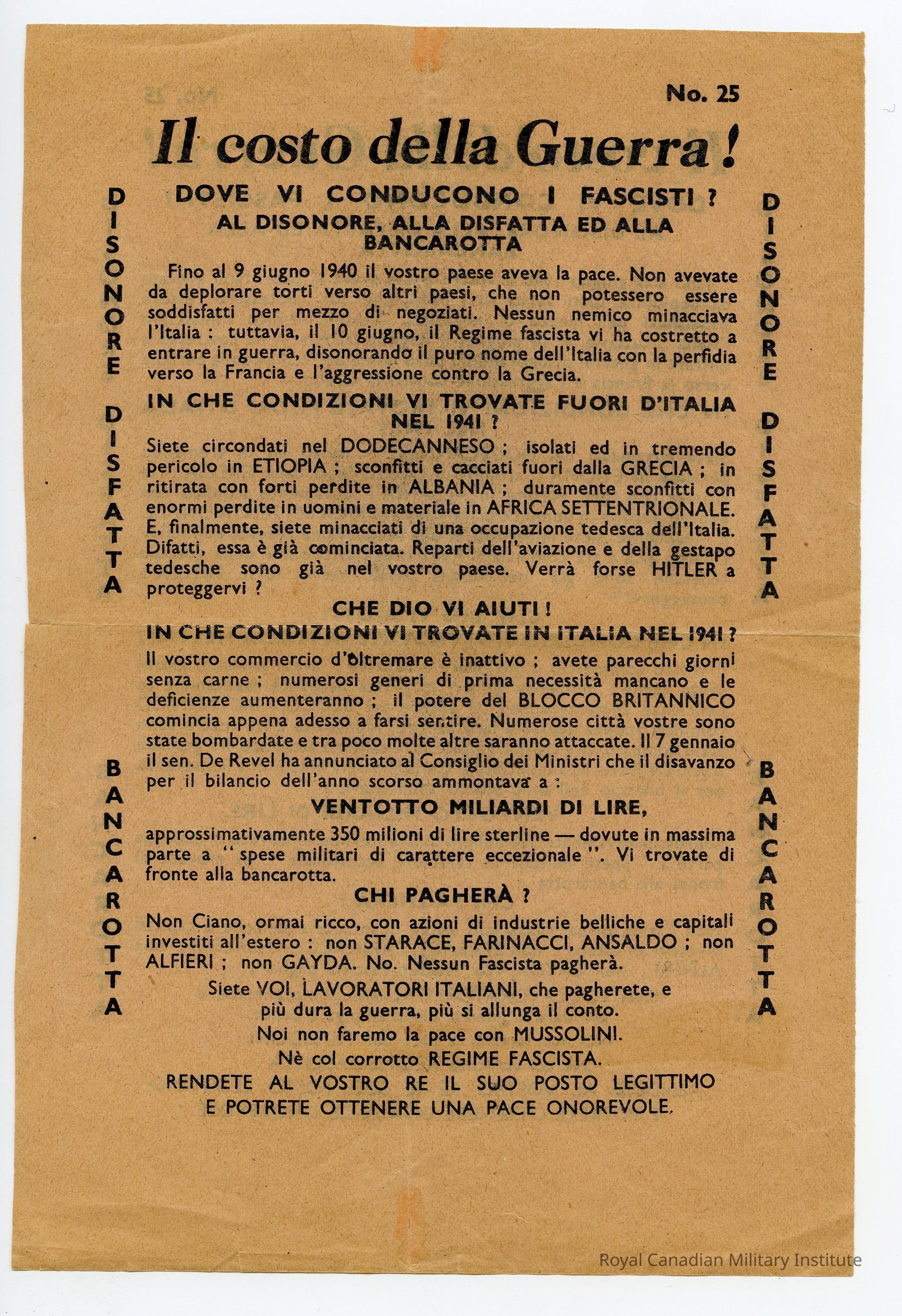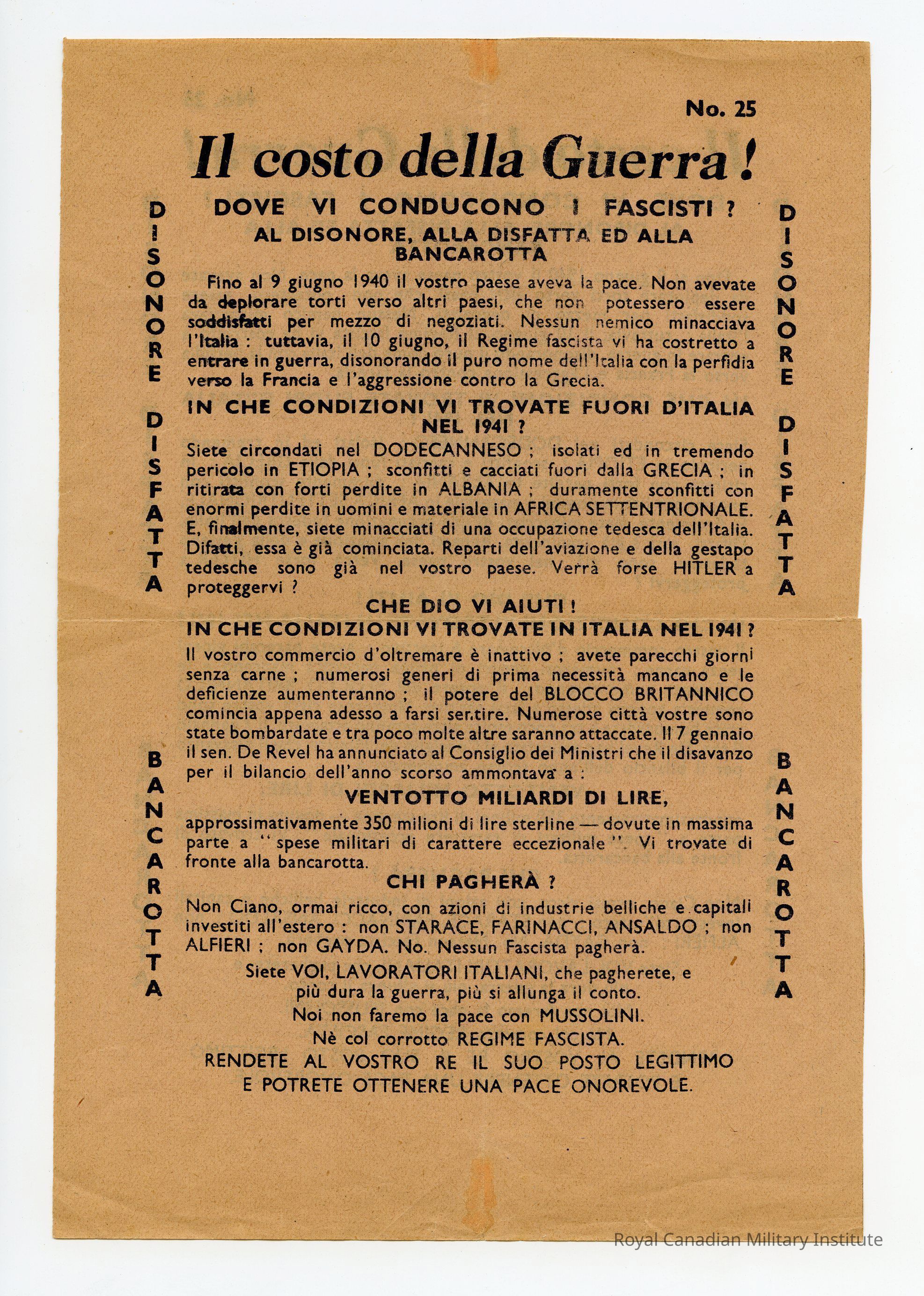1940-1943 British Government Anti-Fascist (Italian) propaganda leaflet.Entry/Object ID