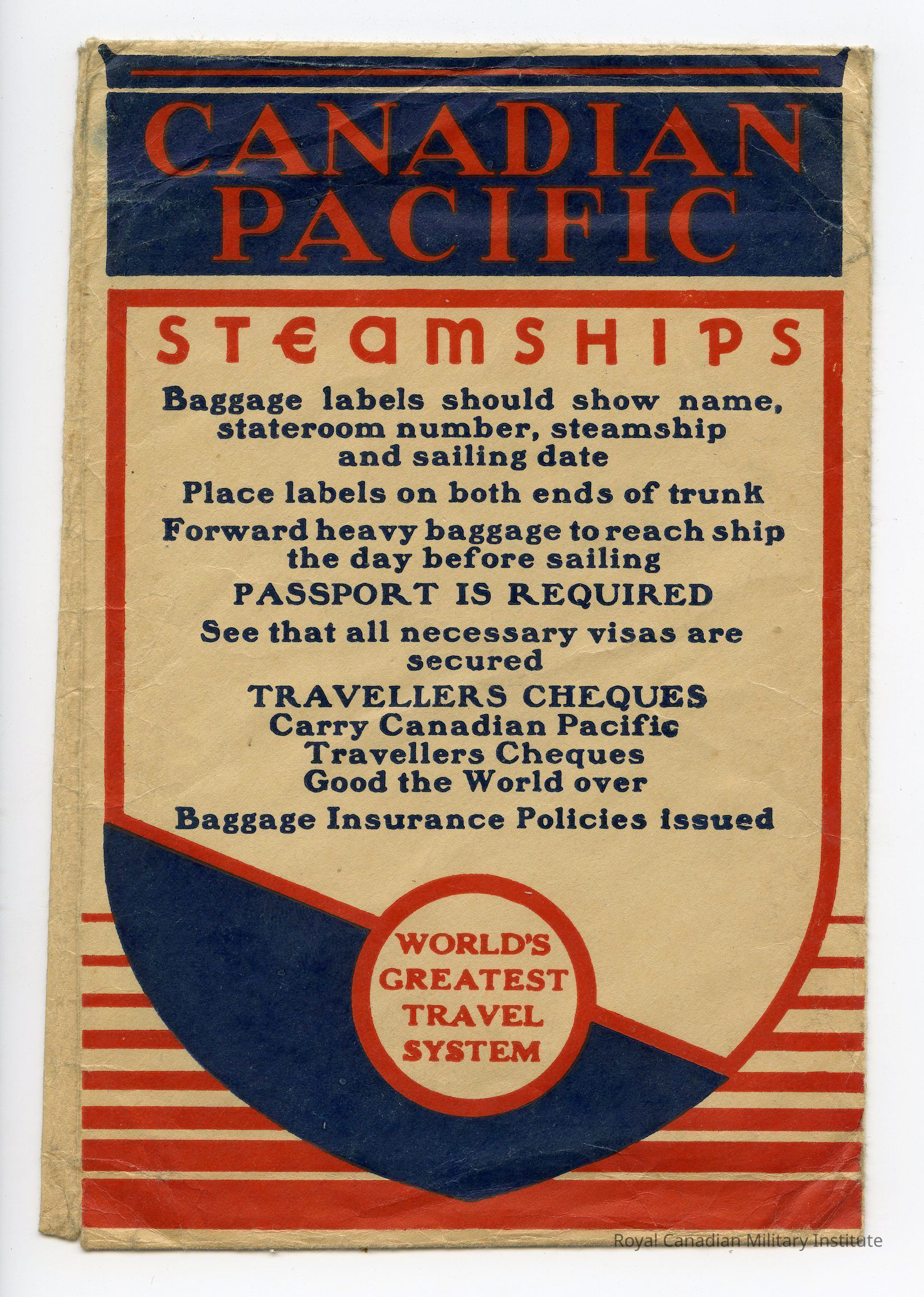 Empty Canadian Pacific Steamships envelope. Possibly used to hold tickets. The envelope is beige, while the front has a red and blue design.
