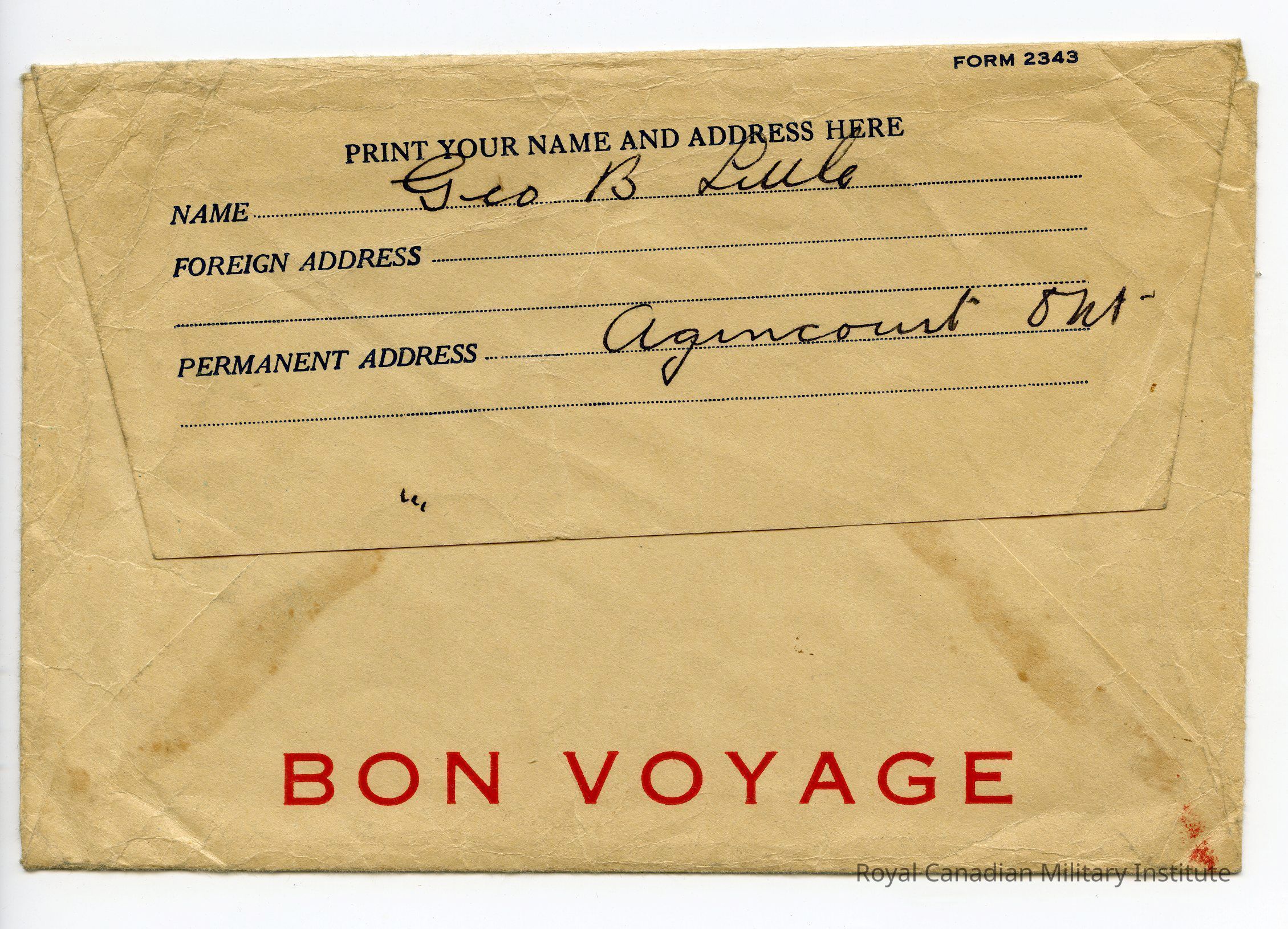 The envelope flap lists as the owner of the envelope Geo B Little and his permanent address as Agincourt Ont.