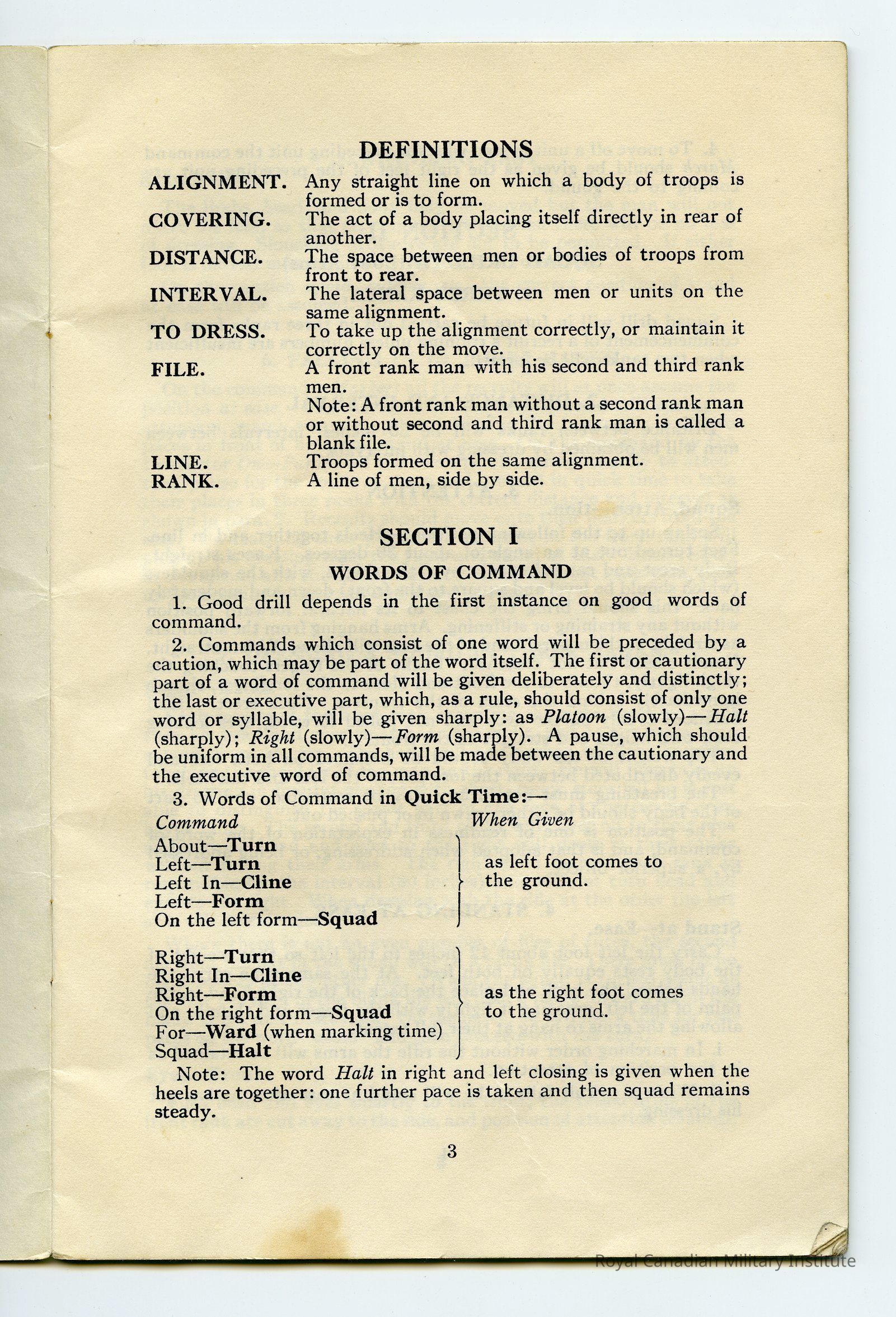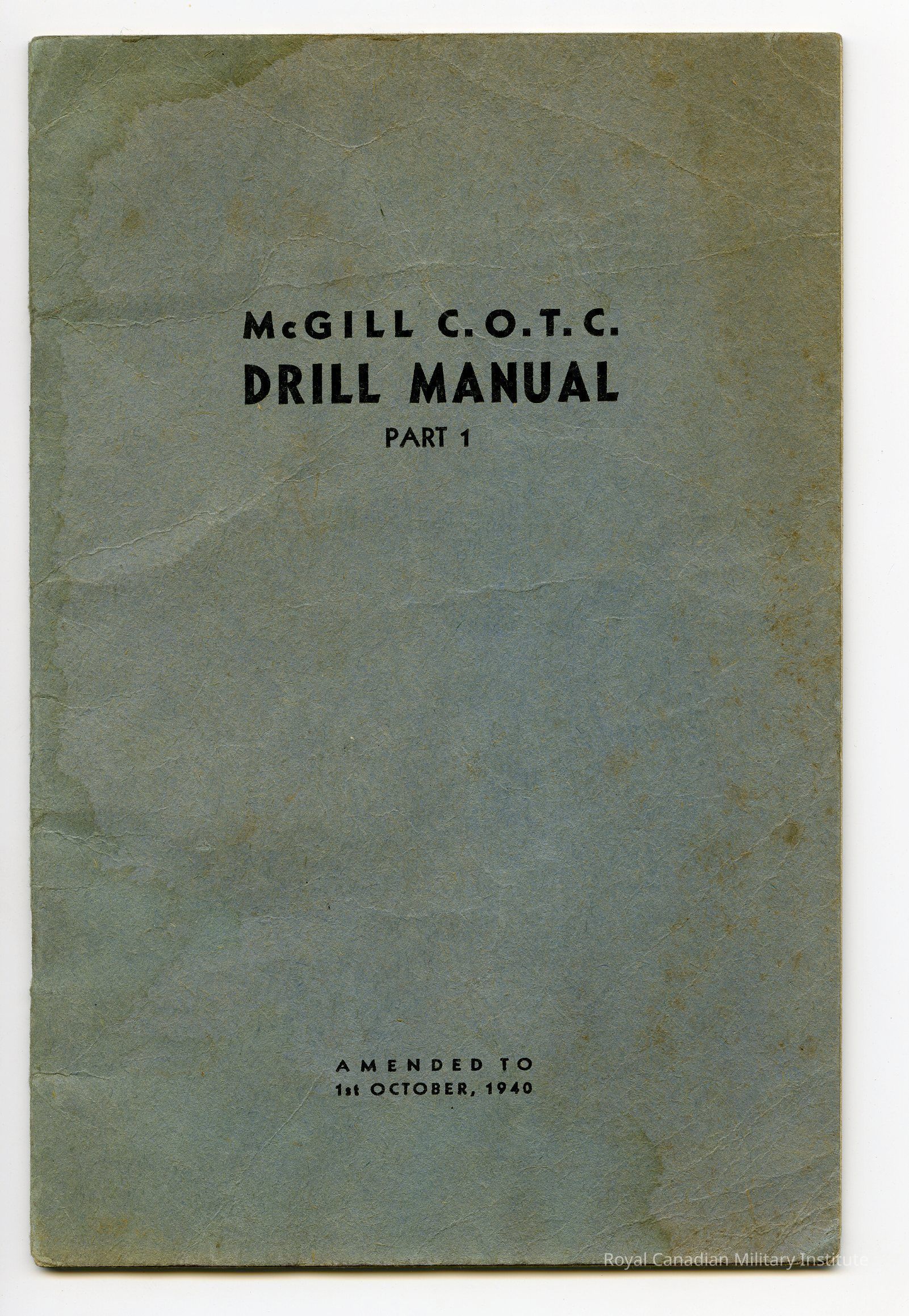 Title in black ink: "Mc Gill C.O.T.C. Drill Manual Part 1 Amended to 1st October 1940" 24 pages with sections on definitions, command words, squad drill without arms, squad drill with arms, introduction to platoon and company drill. Hand-written definiions on inside back cover.Dimensions