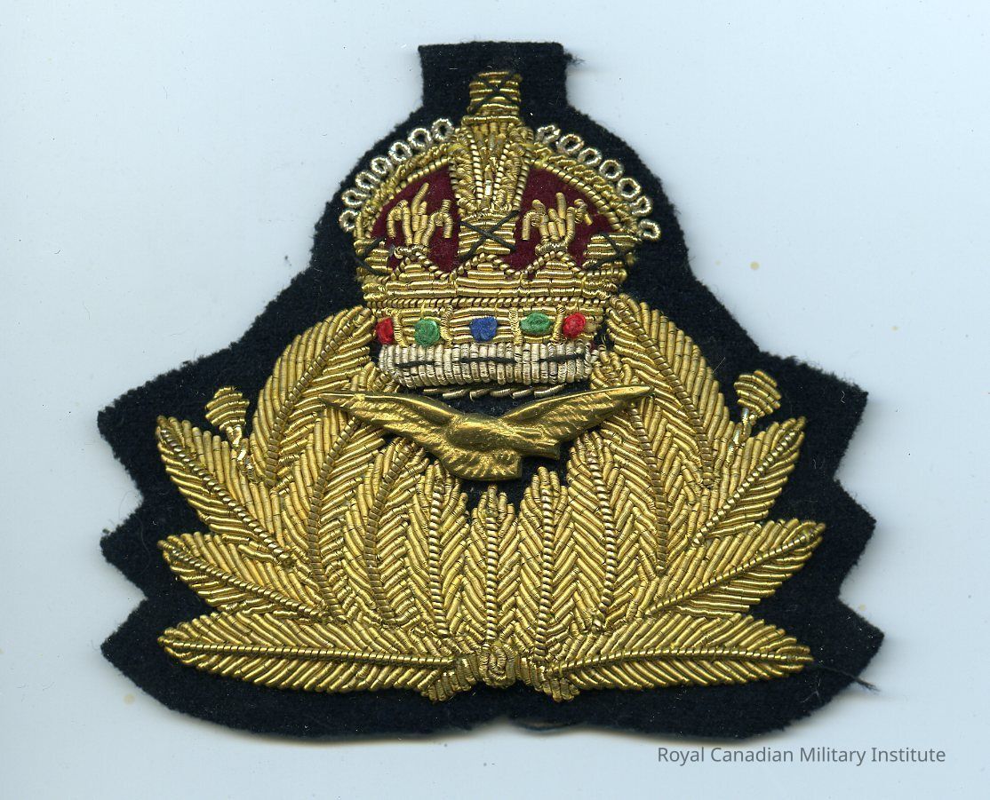 REPRODUCTION 1912-1918 Royal Naval Air Service cap badge. Oval, gold and silver bullion wire wreath around gilt metal eagle. At top is red/green/blue nylon and red velvet King's crown. Black wool base, padded, black linen backing.Made/Created