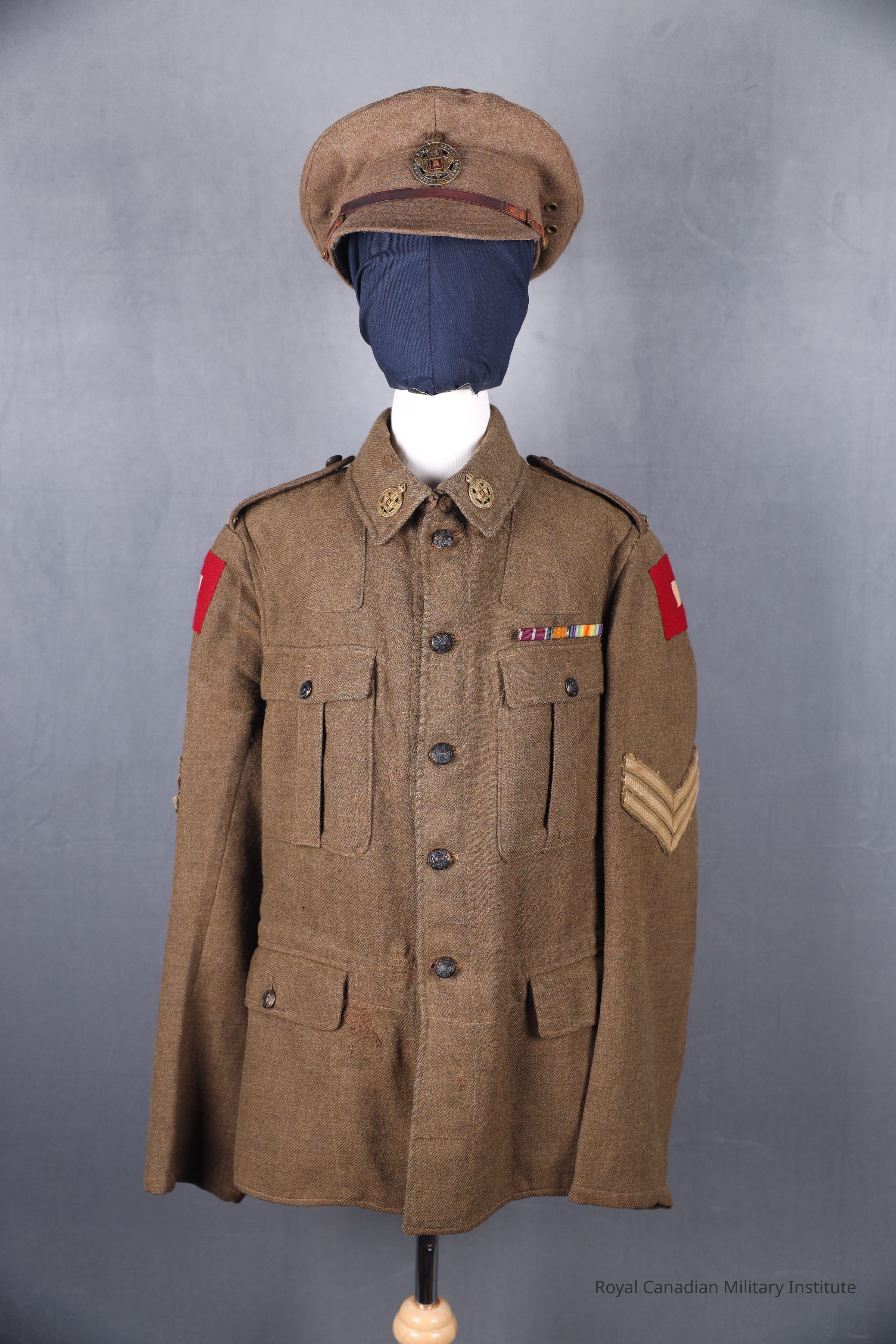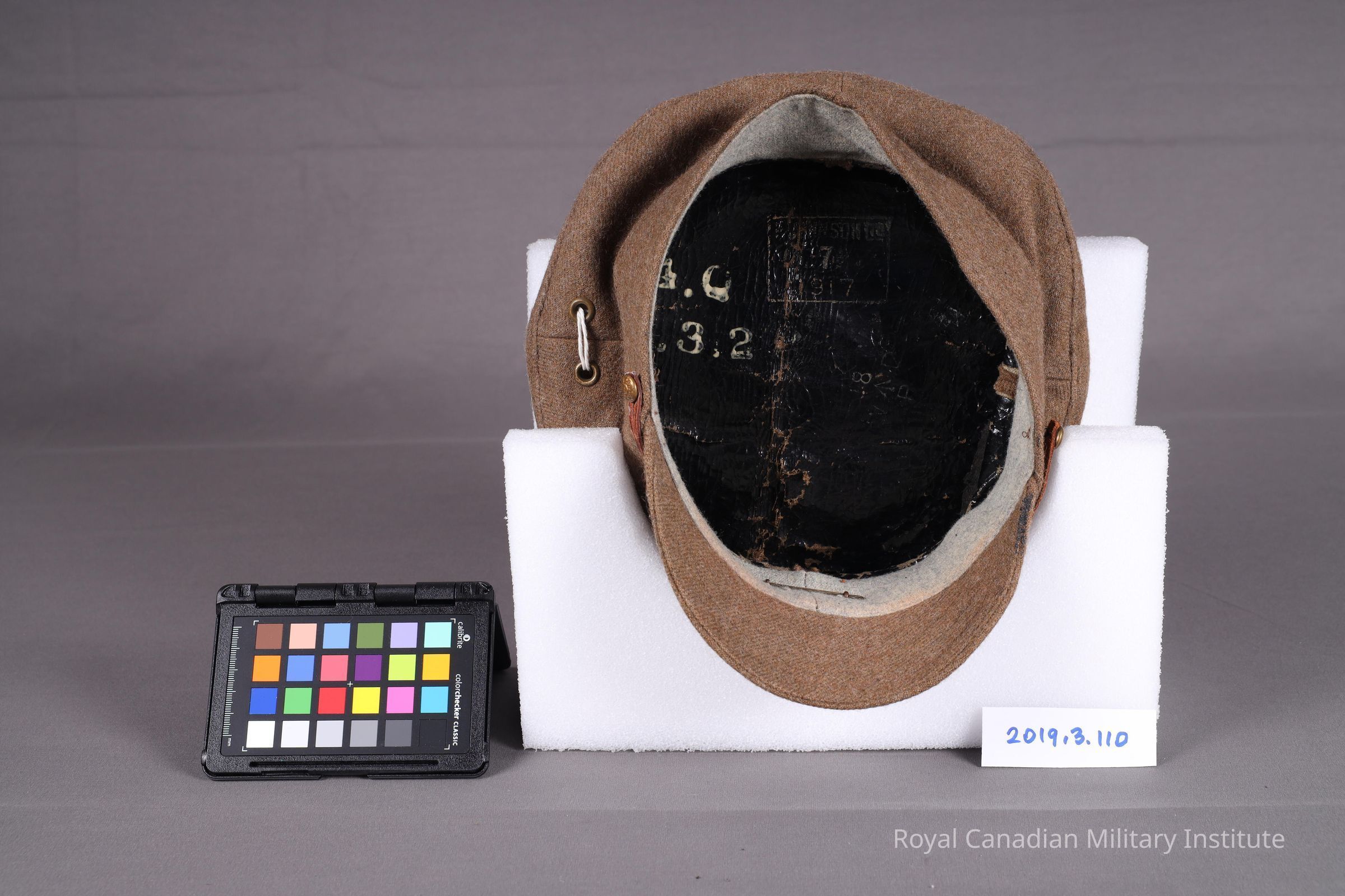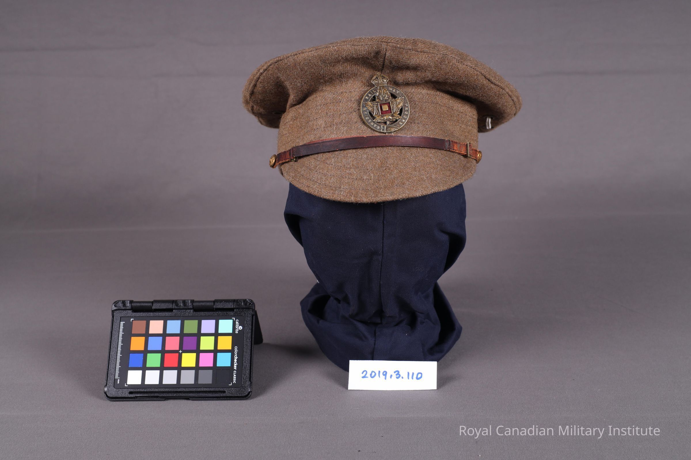 A Great War service brown khaki dress cap made from wool. The top is flattened and has a quilted peak. Attached is an adjustable brown leather chinstrap (31cm length x 9cm height) with two brass buckles connected to two British General List chinstrap buttons (1cm diameter) on either side of the dress cap. In the center is a King's Crown, maple leaf Canadian Railway Troops cap badge. The interior of the cap has a black oilskin lining and a grey wool sweatband.Context