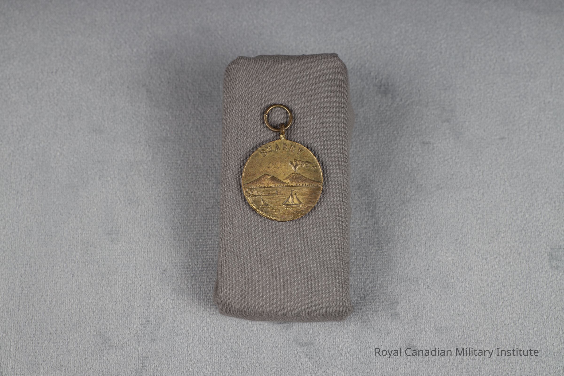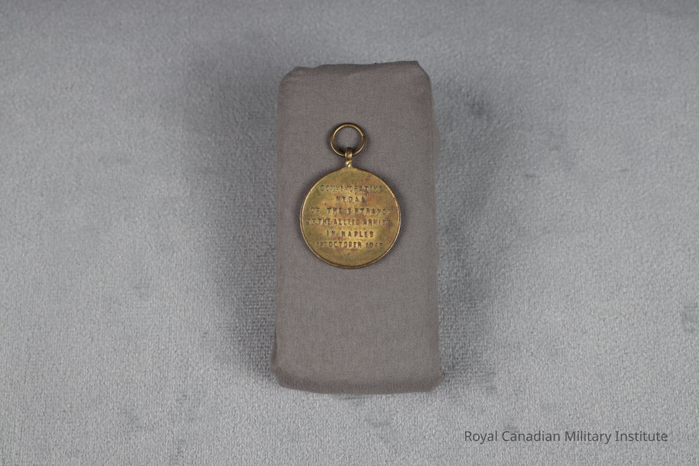 1943 Italian civilian commemorative medallion "Allied Armies Entrance to Naples 1st October 1943" Circular, brass. obverse shows harbour, mountains, volcano, ships At top is title "8th Army" Reverse shows title "Commemorative Medal of the Entrance of the Allied Armies In Naples 1st October 1943"Inscription/Signature/Marks