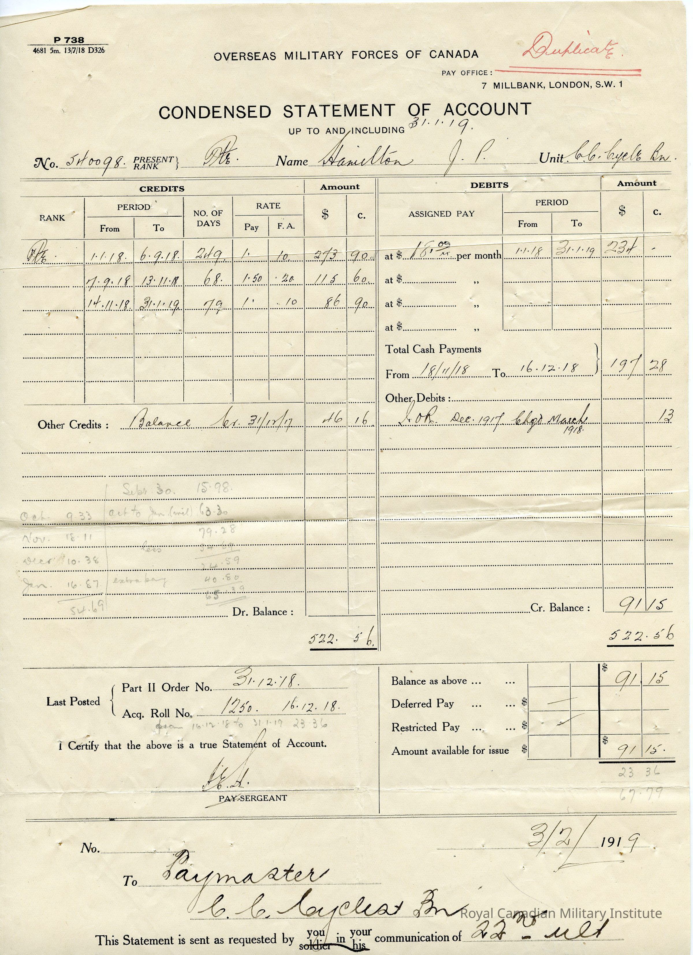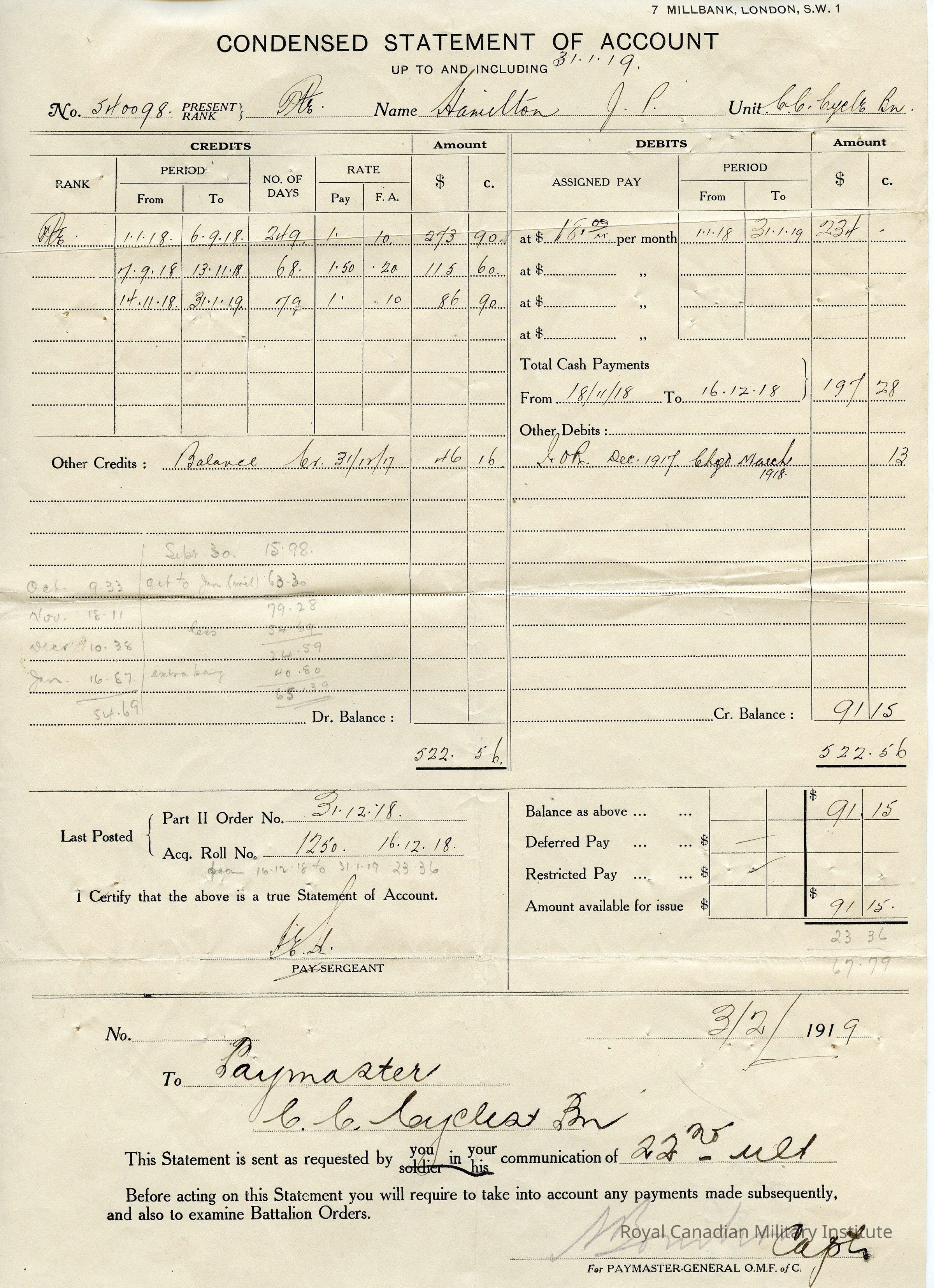 Account Statement produced by the Overseas Military Forces of Canada for Private J.P. Hamilton's account. The statement was produced on January 31, 1919 at the request of the Paymaster.Made/Created