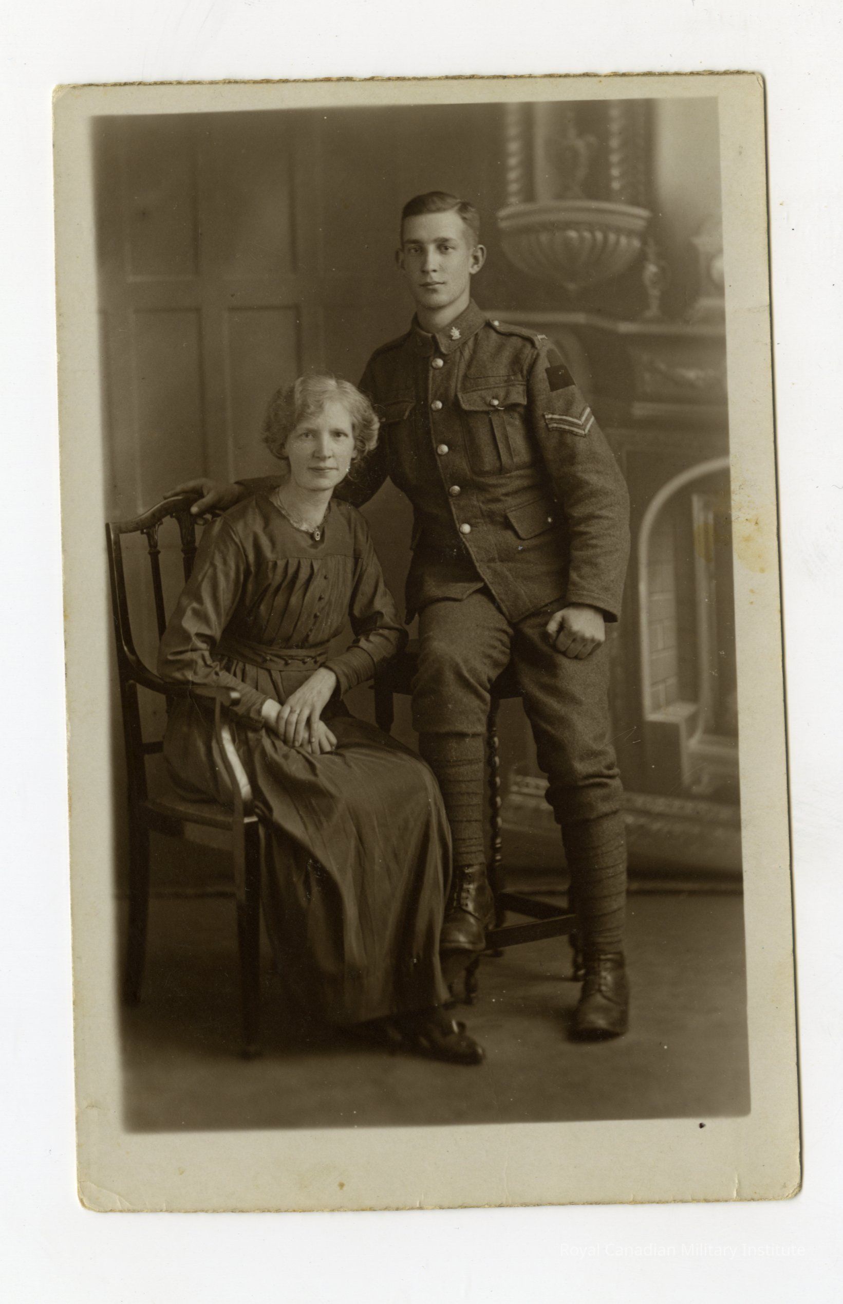 An unidentified Real Photo Postcard (RPPC) of a 4th Battalion Corporal alongside his mother. His mother is sitting on a chair, and he is leaning against a table with his arm around her. She is in civilian clothes, and he is in his military uniform, without the cap. Distinguishing unit patches and badges for the 4th Battalion are visible.