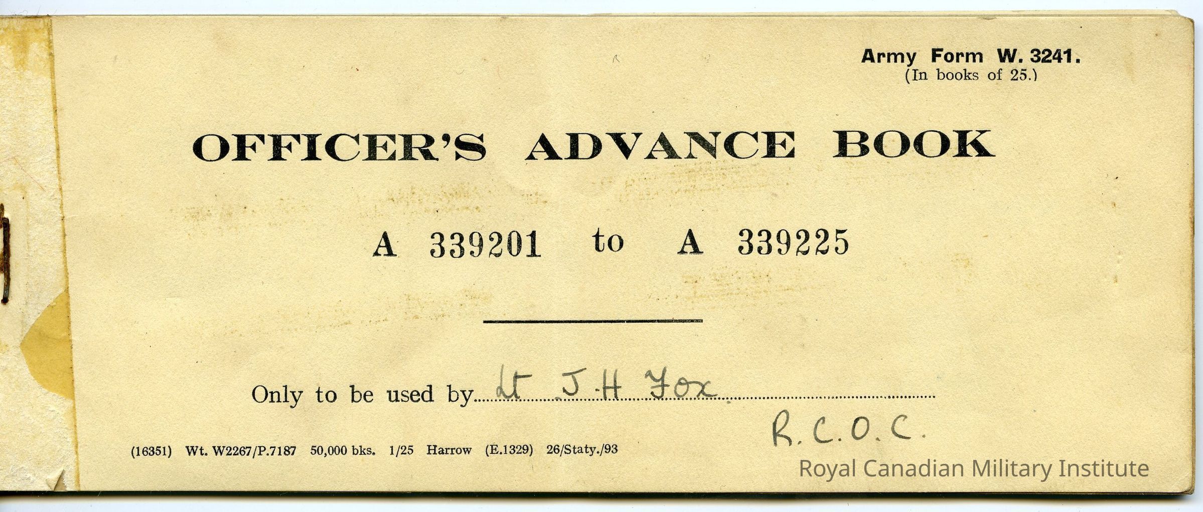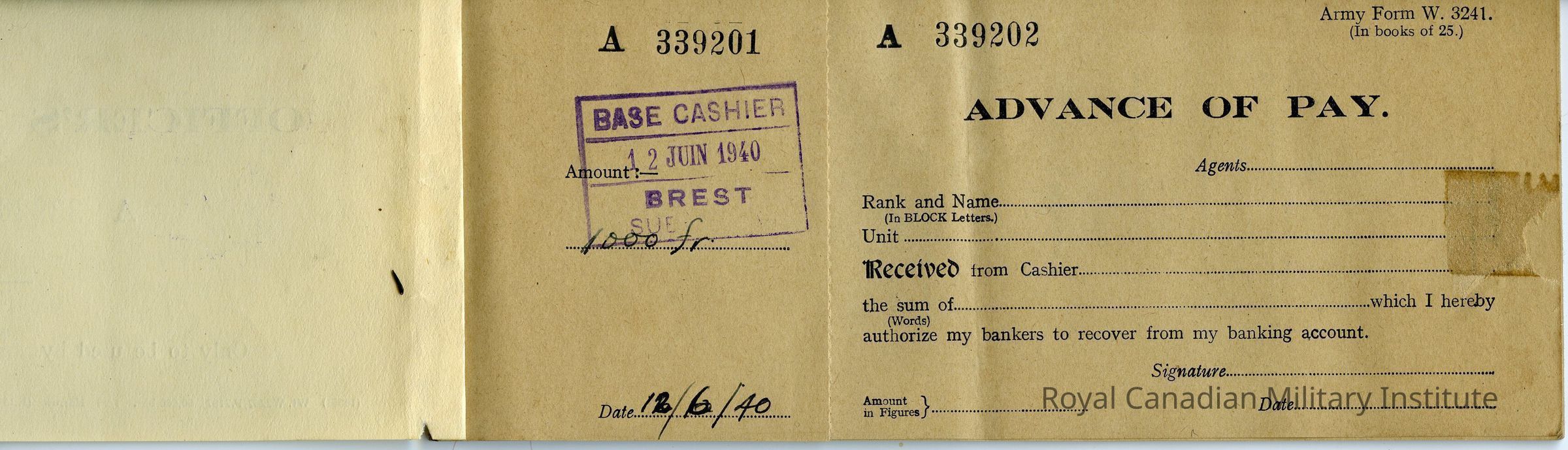 1940 British Army Officer's Advance Paybook, "Officer's Advance Book A 339201 to A 339225, Only to be used by Lt. J.H. Fox R.C.O.C" On the inside, only one reciept appears to be used. The issued reciept left in the book reads as: "A 339201, with a purple stamp marked as "Base Cashier 12 Juin 1940 Brest" the bottom lettering of the stamp appears to be faded. In pen, there is written: 1000 fr, Date 12/6/40.