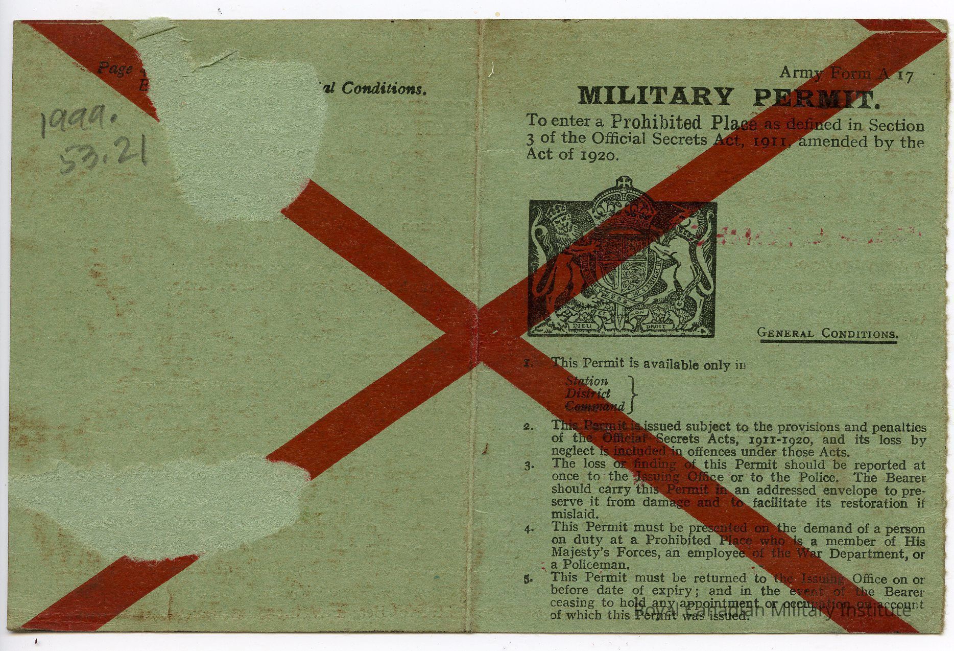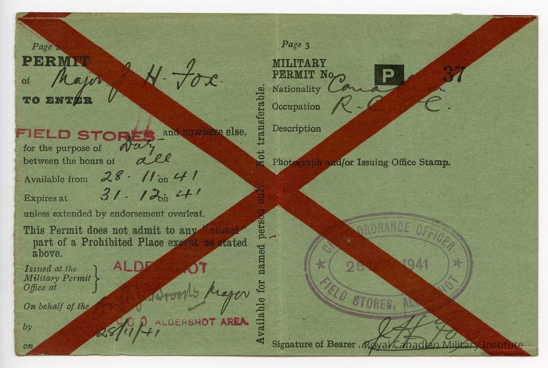 1940-1941 British Army Military Permit, printed on green paper. Both sides have large red X's. Is Army Form A 17 and is a permit to grant entry itnto a prohibited place. Permit granted to Major J.H. Fox to enter Field Stores. Issued at Aldershot by Major A.J. Broons (?). Issued on November 28, 1941. Available from November 28, 1941 to December 31, 1941. Nationality listed as Canadian and Occupation as R.C.O.C. Purple Stamp reads "Chief Ordnance Officer November 28, 1941 Field Stores, Aldershot"Dimensions