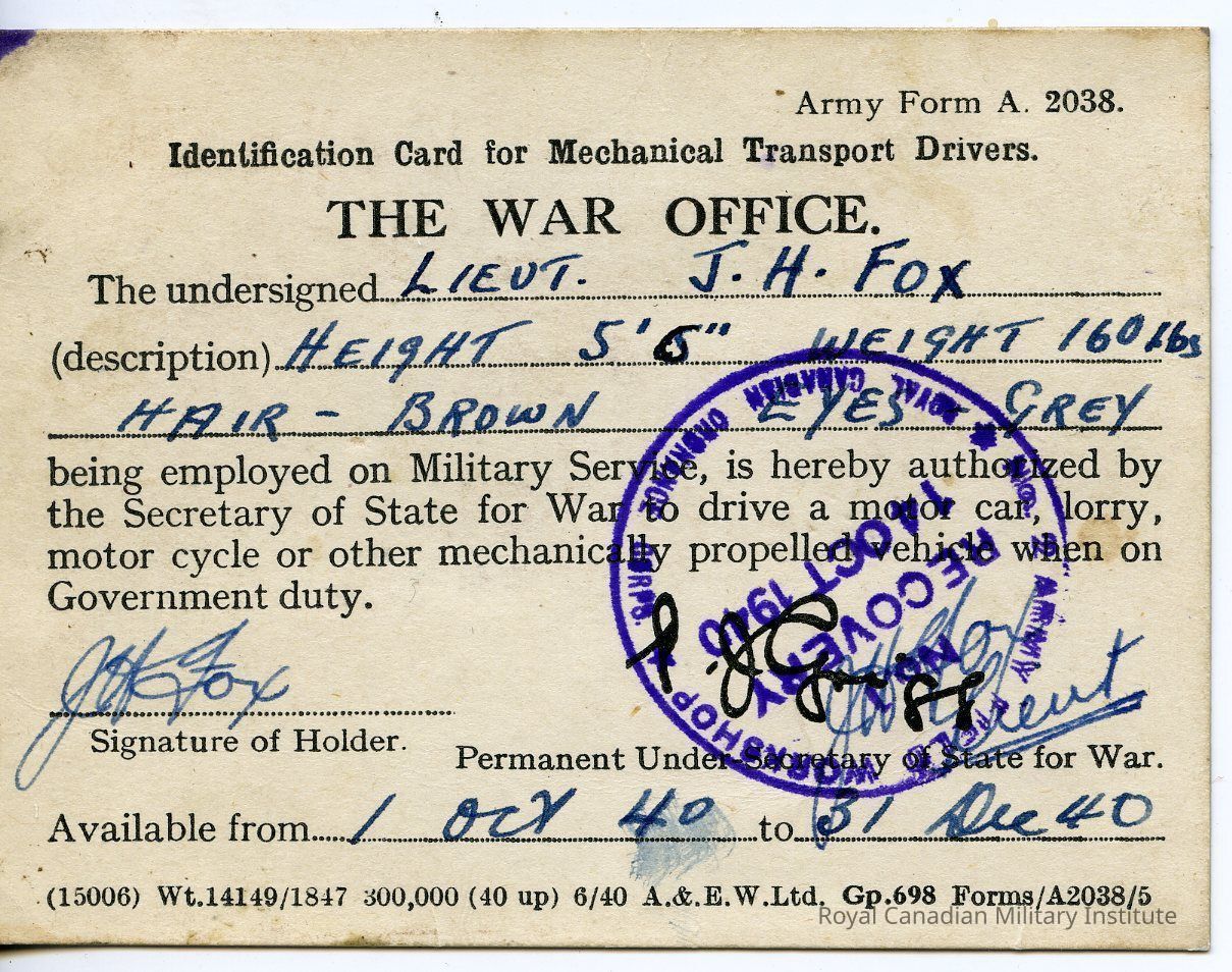 1940 British Army Transport Drivers' Card "Lieut. J.H. Fox" Rectangular gray-brown card with description of Fox ("Height 5 6" (6 seems to be marked over top of a 5), weight 160lbs, Hair: brown, Eyes: grey" Card states "...authorizes to drive a motor vehichle, motor cycle, or any mechanically propelled vehicle when on government duty." Licence is valid 01 October to 31