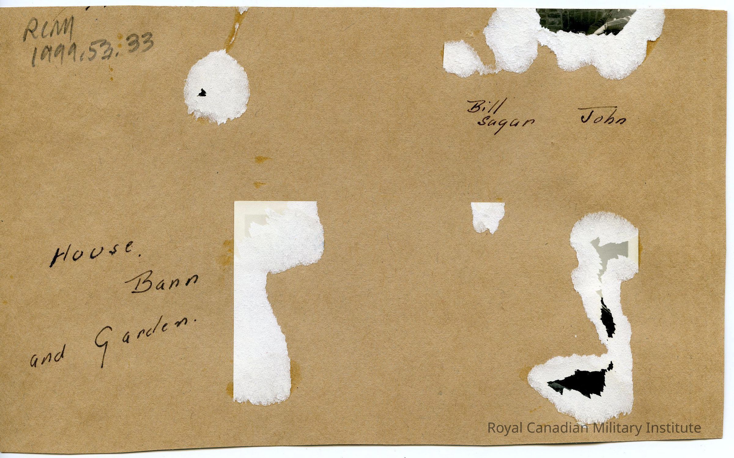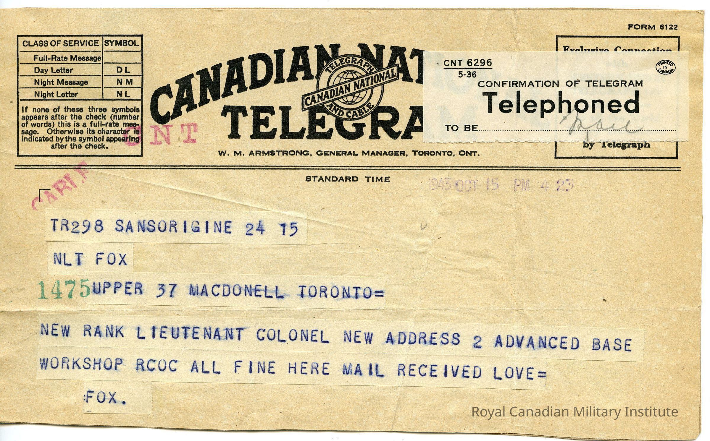 1943 Canadian National Telegram "Lieutenant-Colonel J.H. Fox." Rectangular light tan paper, blue lines and title "Canadian National." Brown cardstock backing. Text reads "TR298 SANSORIGINE 24 15 / NLT FOX / UPPER 37 MACDONELL TORONTO= / NEW RANK LIEUTENANT COLONEL NEW ADDRESS (sic) 2 ADVANCED BASE WORKSHOP RCOC ALL FINE HERE MAIL RECIEVED LOVE= / FOX.." In faded blue is stamped "1943 OCT 15 PM 4:23." On the brown cardstock backing is written in brown in in lower right hand corner "HOUSE. / Bann / and Garden." In upper right hand corner is written "Bill / Sugar John"Inscription/Signature/Marks
