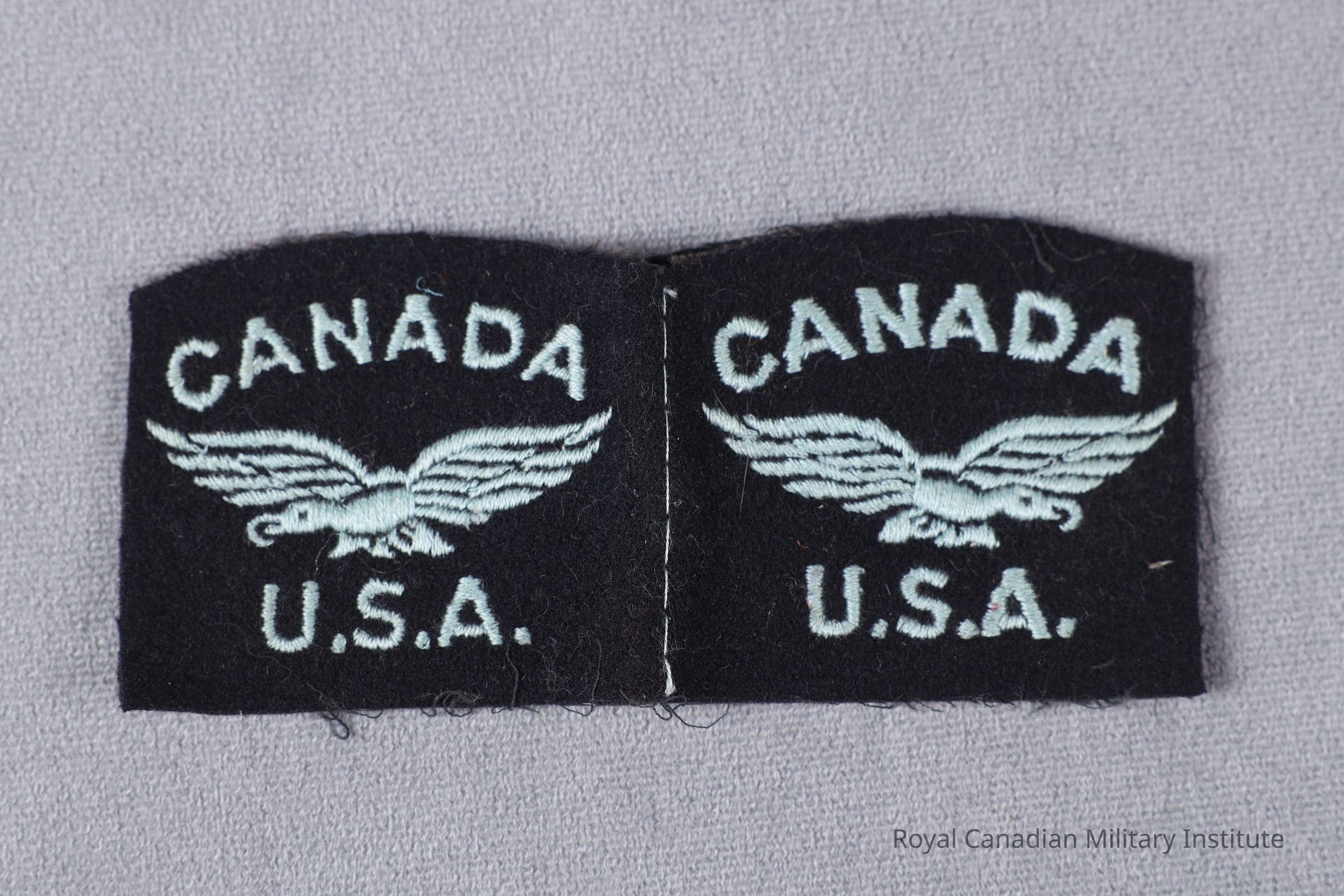 1940-1945 RAF "Canada/USA" shoulder titles. Two titles still attached together. Dark blue fabric cut into rectangular archtops with "CANADA", "U.S.A.", and a stylised RAF eagle stitched on in aqua-coloured thread. Stiff black fabric backing. Aqua stitching divides the two titles.Inscription/Signature/Marks