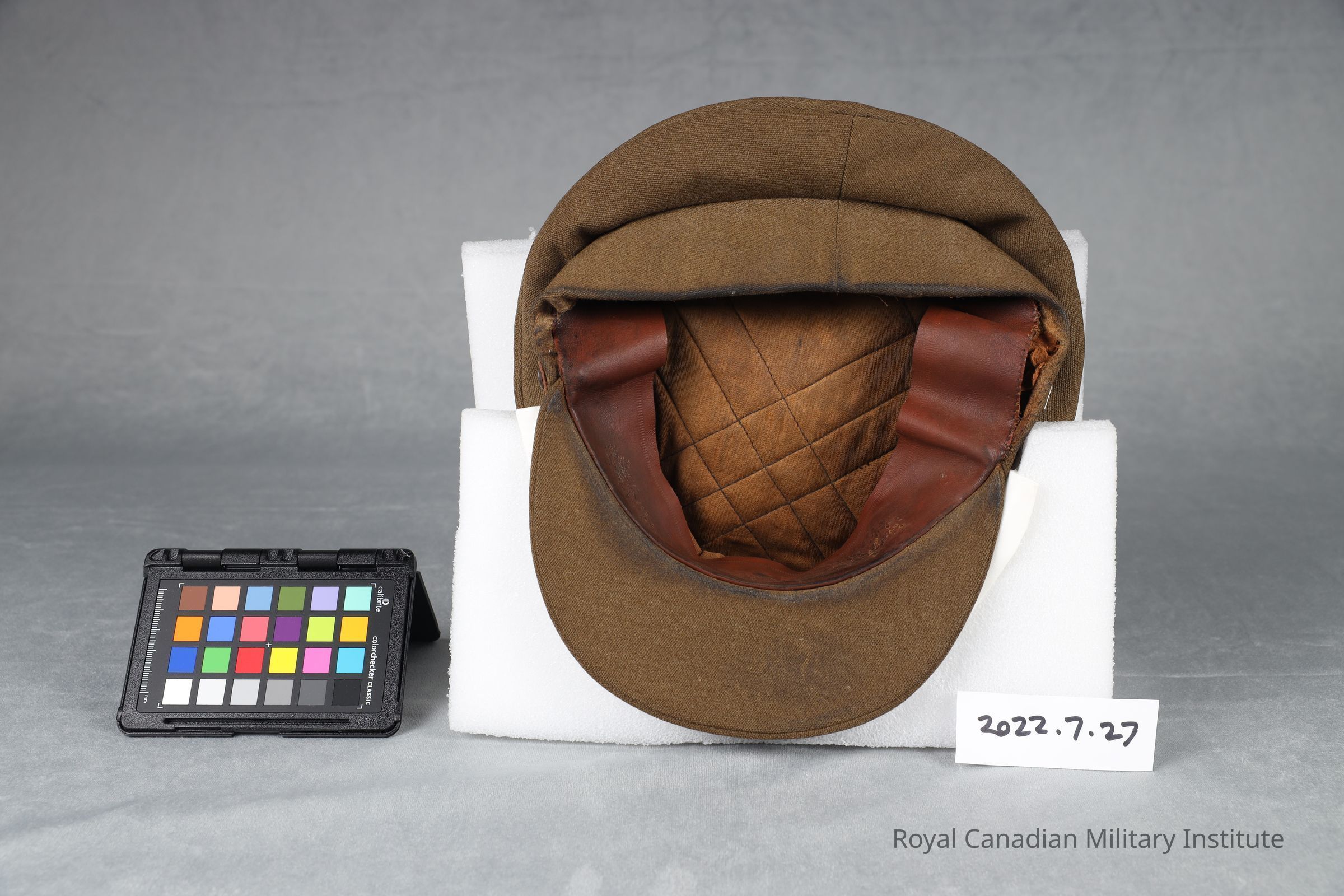 1917-1918 Canadian Army officer's General List service dress cap made of tan khaki wool. The top of the cap is flattened and has a front peak. On either side of the body are two painted brown ventilation grommets. The adjustable leather chinstrap (29.5 cm long) is attached to the cap with two pressed leather chinstrap buttons (1.5 cm diameter). The general list cap badge (4.5 x 4.5 cm) is a plated gold maple leaf cap badge with a King's crown in the center.