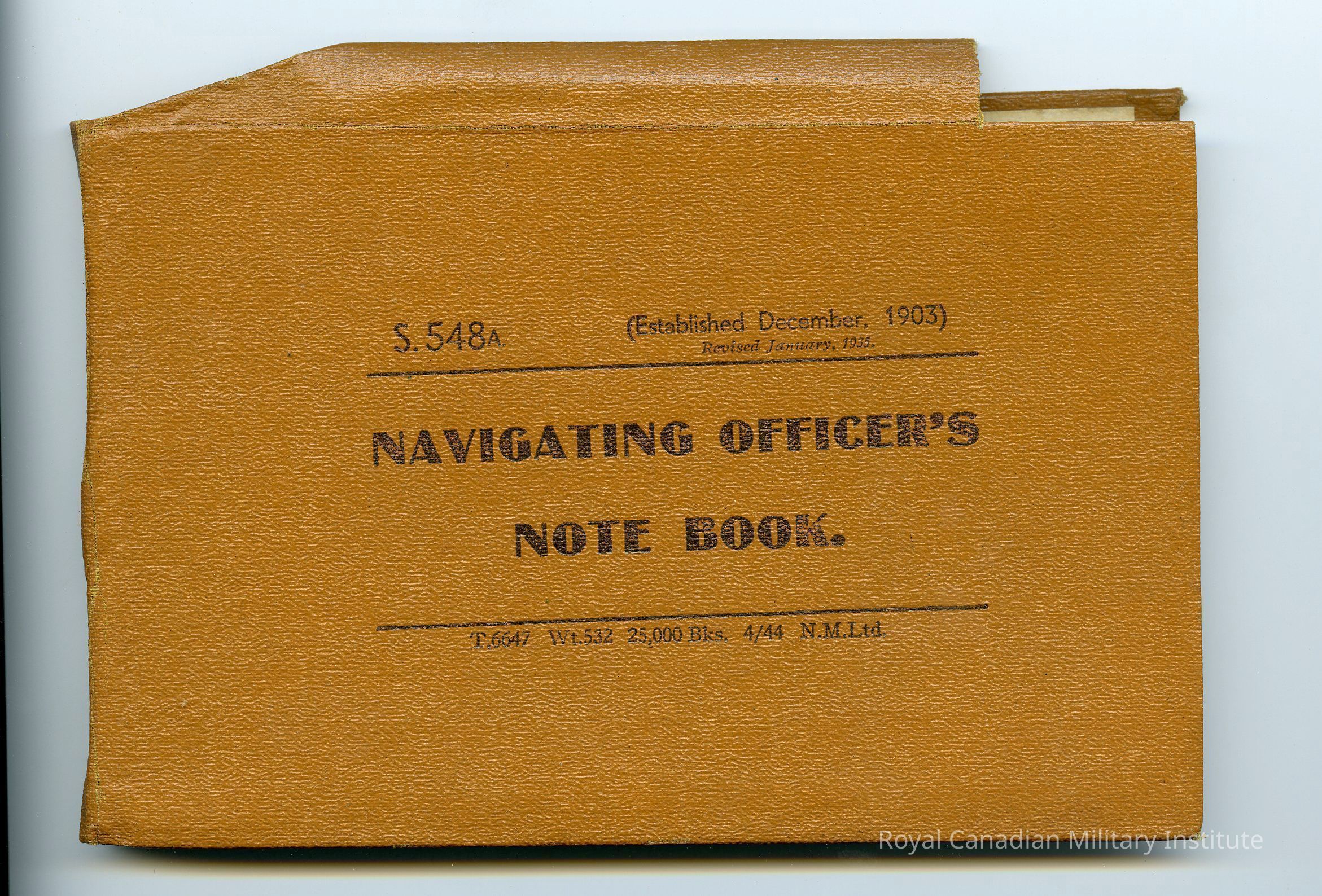 Front cover, stamped in black ink: "S. 548A (Established December, 1903 / Revised January, 1935) / Navigating Officer's / Note Book. / T.6647 Wt.532 25,000 Bks. 4/44 N.M.Ltd."