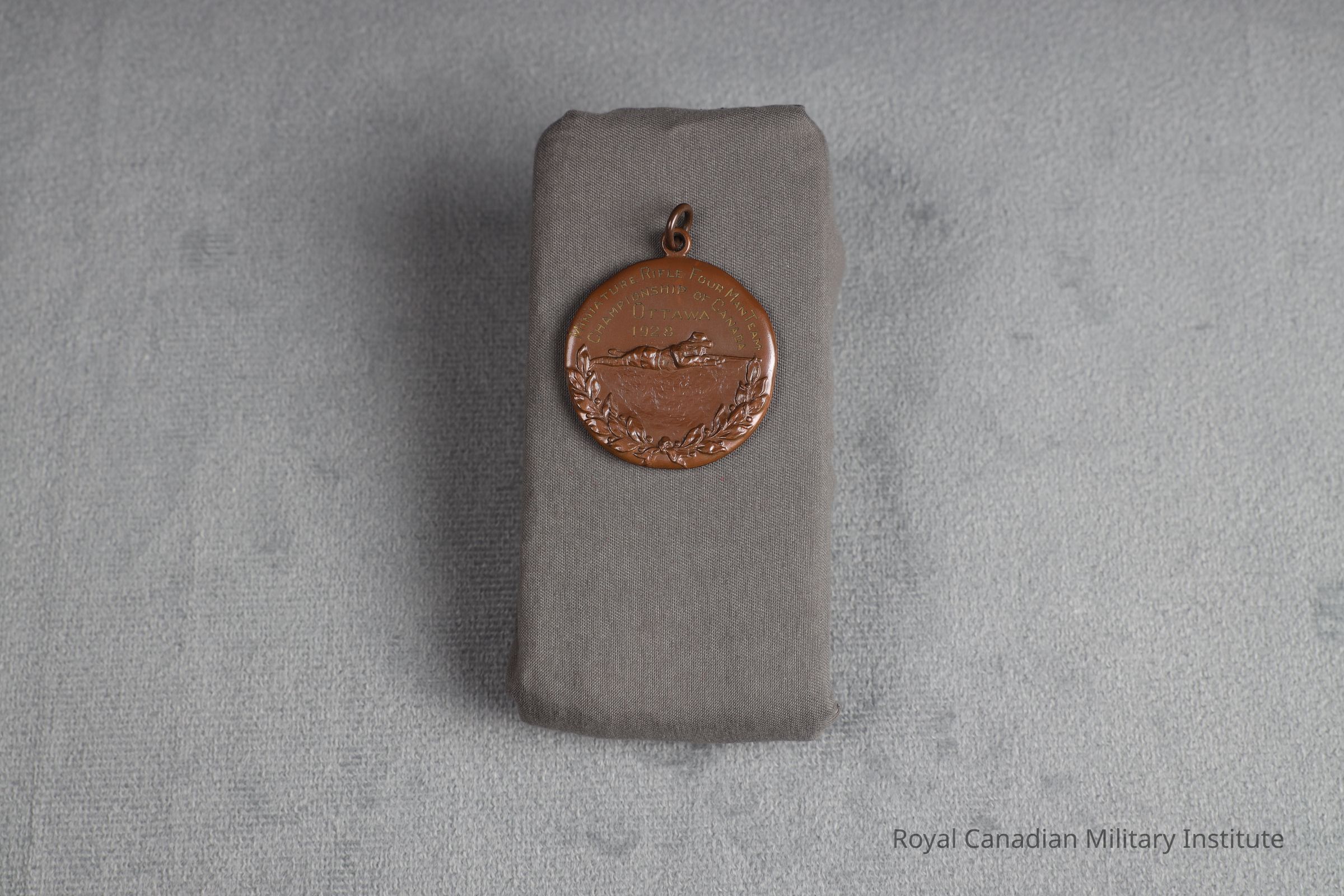 1928 Miniature Rifle Championship of Canada Medallion. Circular, copper. Obverse a prone figure firing a rifle, over crossed laurel wreath. At top, stamped in gold leaf: "Miniature Rifle Four Man Team Championship of Canada Ottawa 1928" Reverse shows maple leaf wreath and title stamped in gold leaf: "Presented by Dominion Cartridge Company Limited" (Reg'd 08) Suspender of fixed and loose ring at top.Made/Created